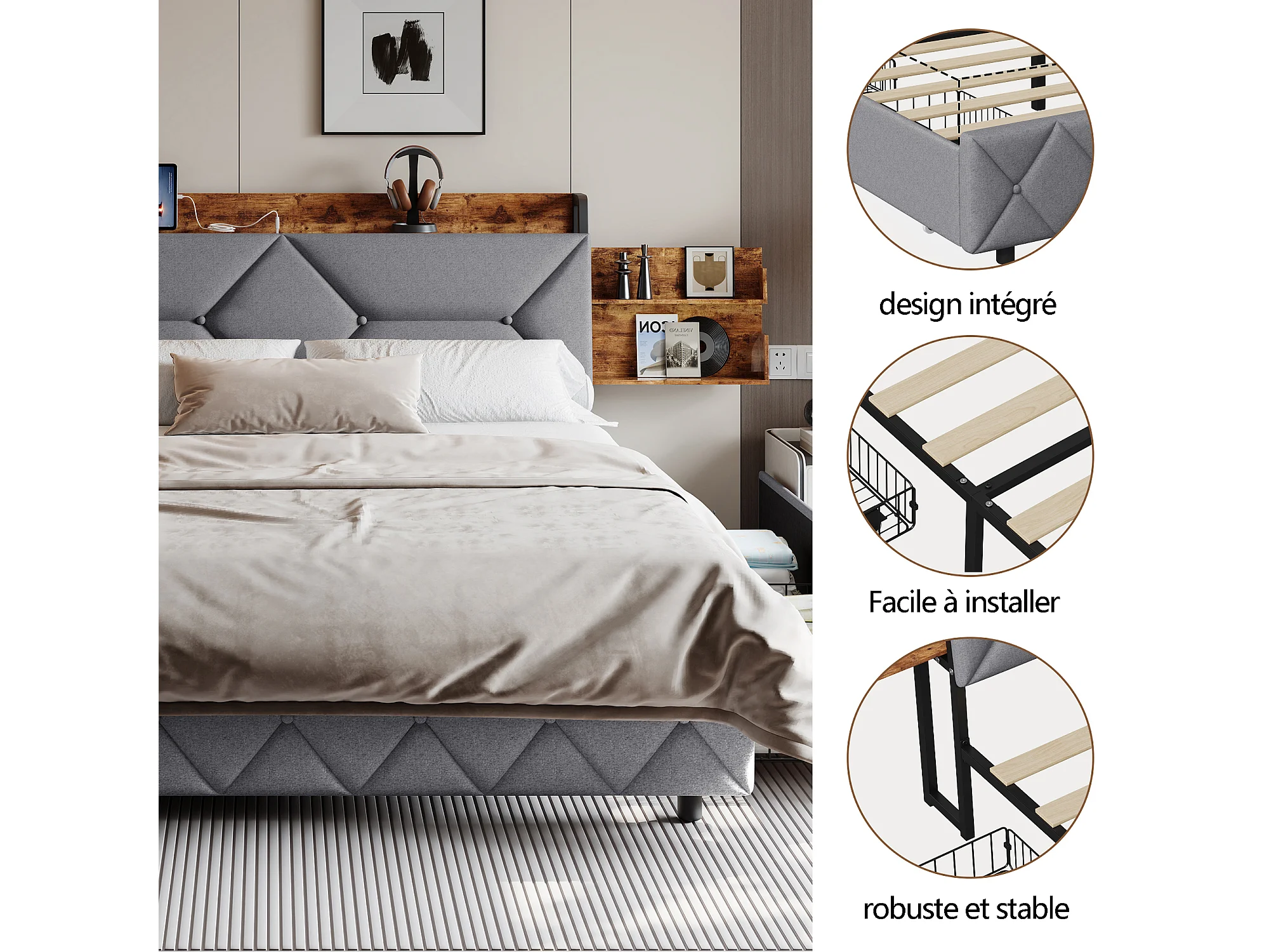 Lit Double 160 x 200 cm, avec USB, 4 tiroirs de rangement et tête de lit rembourrée, Lin, gris