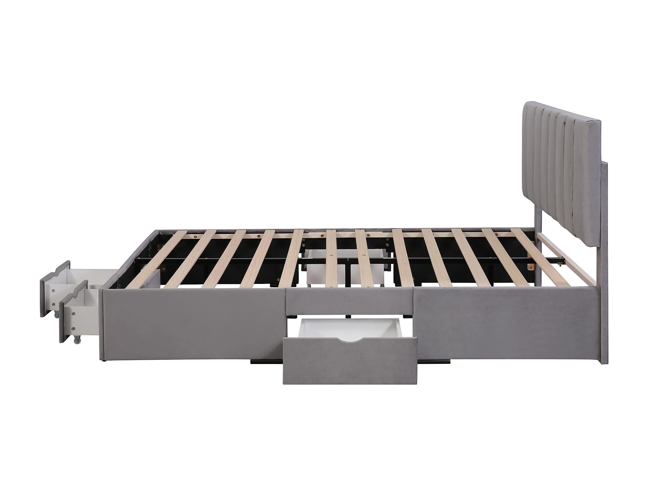 Lit double 160 x 200 cm, rangement, sommier à lattes, dossier, 4 tiroirs, Velours gris, sans matelas