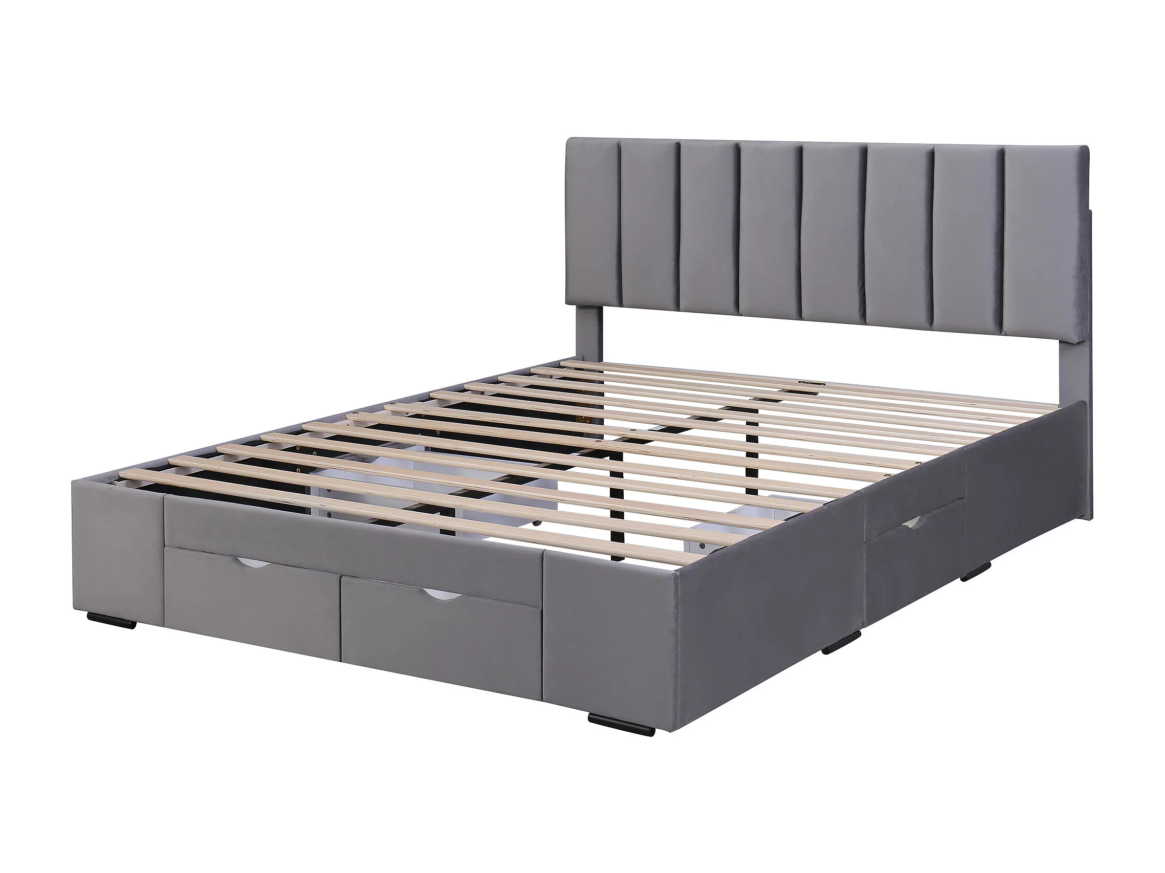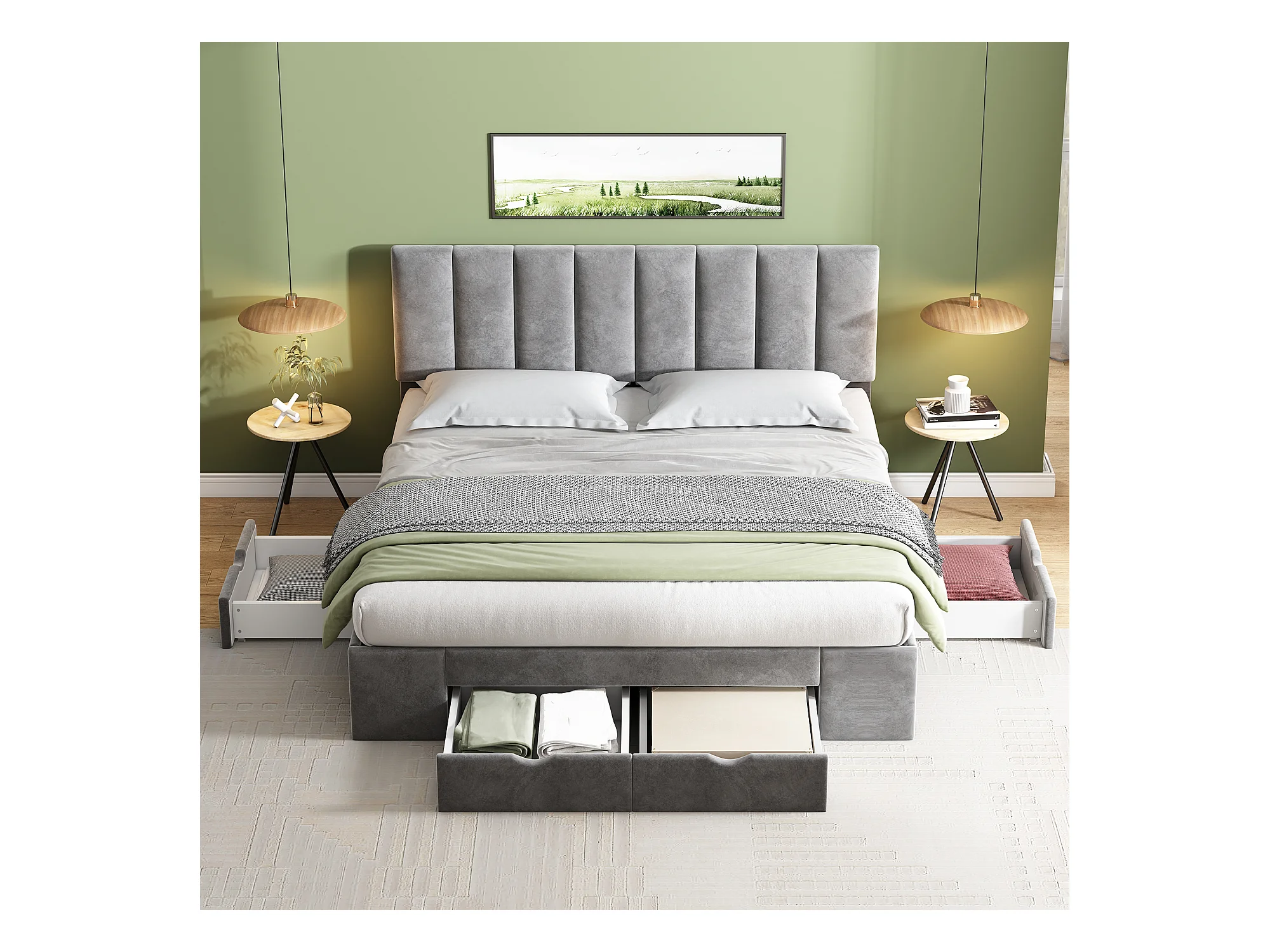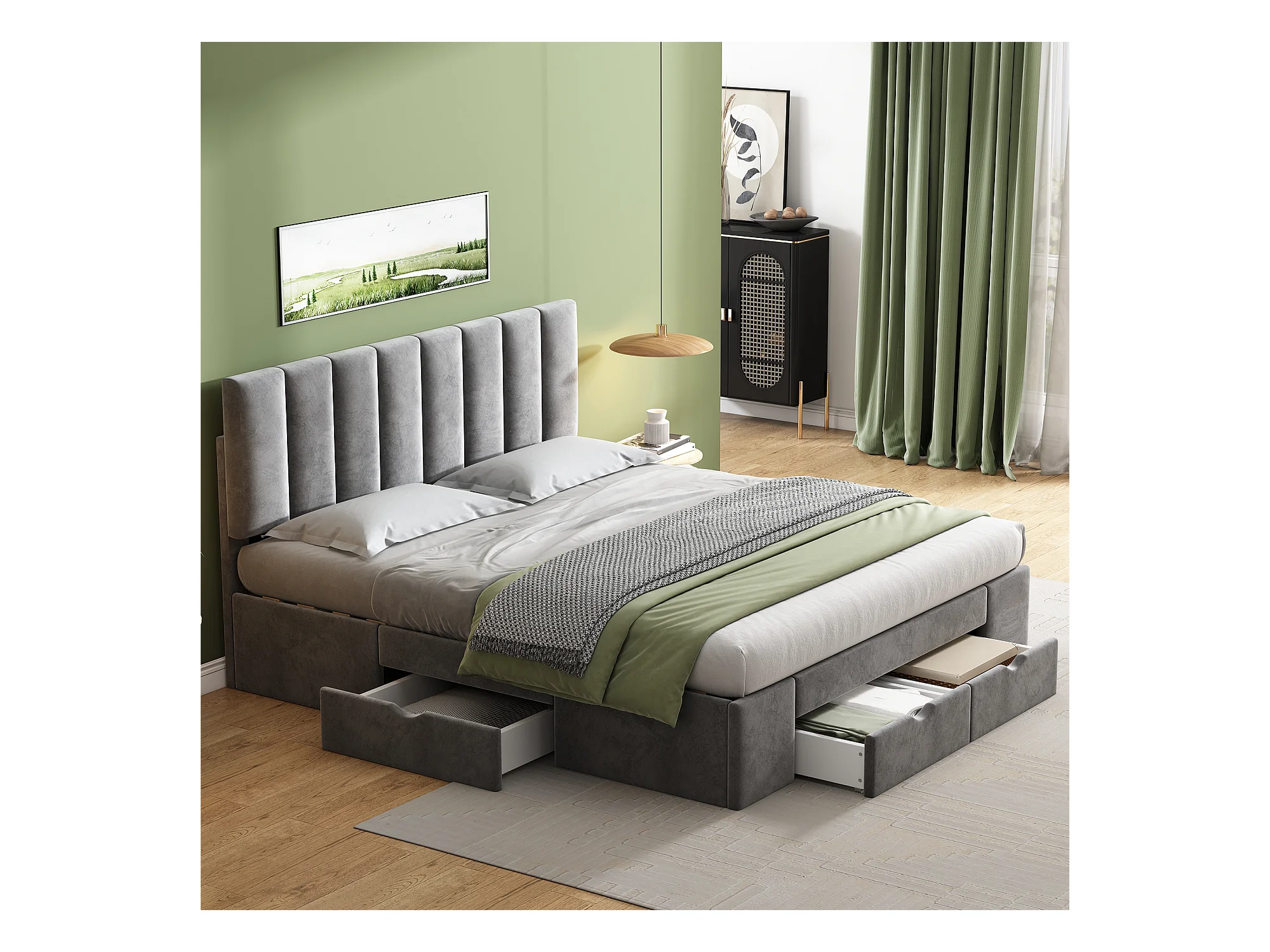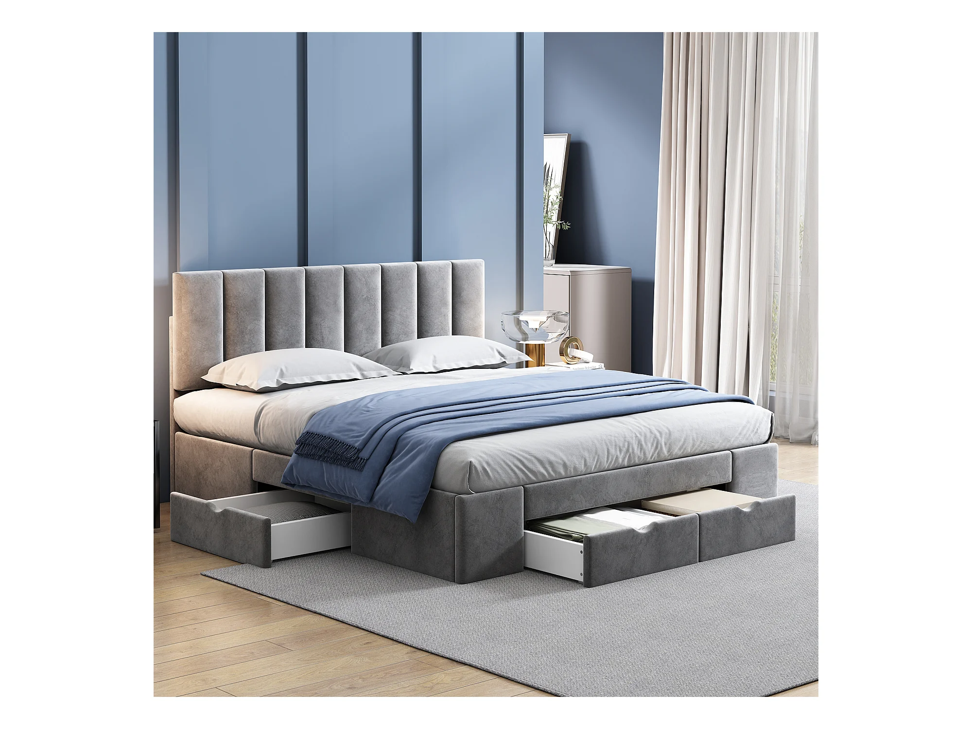 Lit adulte 160x200 cm en velours gris avec 4 tiroirs de rangement, sans matelas