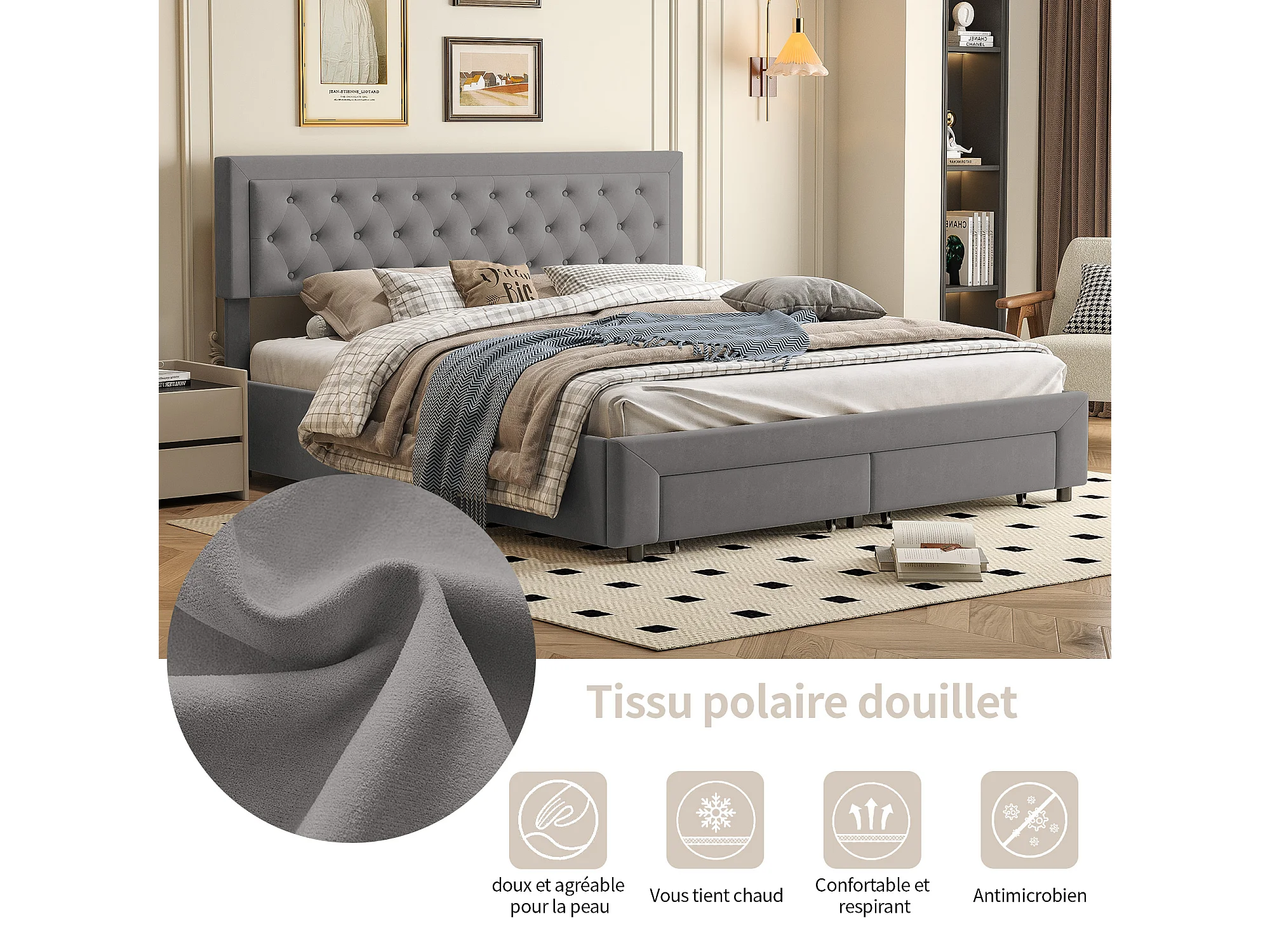 Lit double 160x200cm avec 2 tiroirs - rangement hydraulique et sommier à lattes - velours - gris