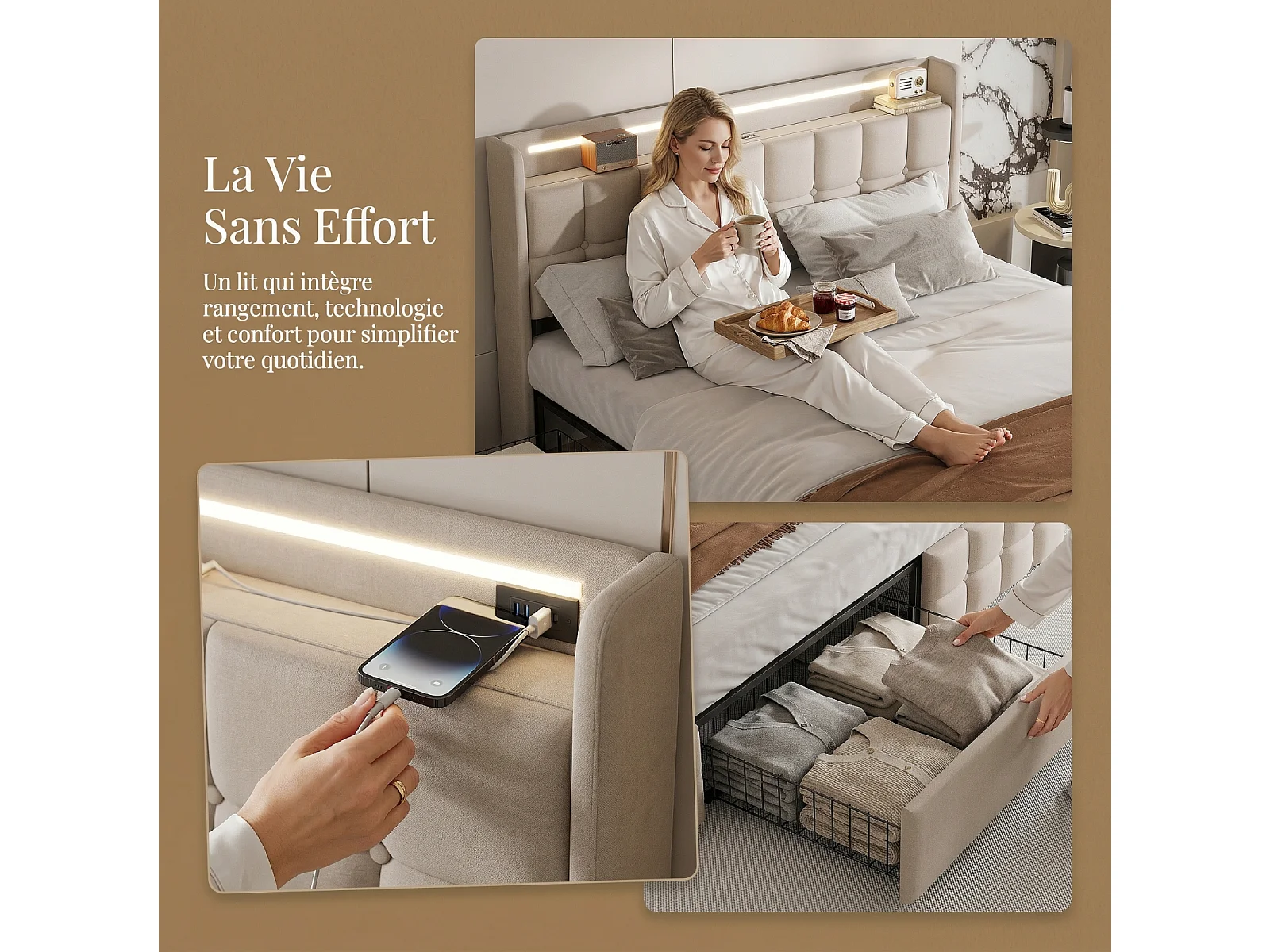 Lit double 160x200cm avec 4 tiroirs,Structure de lit avec avec Ports USB et éclairage LED,Sommier à lattes,Lin,Beige