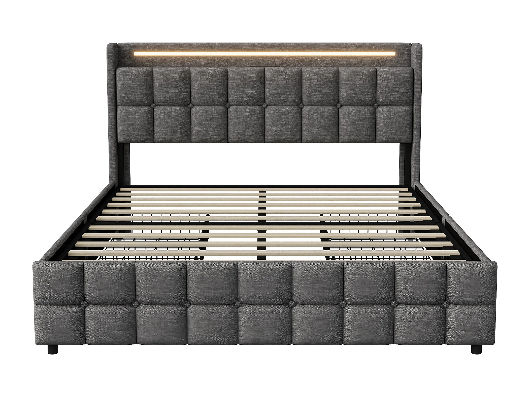 Lit double 160x200cm avec 4 tiroirs,Structure de lit avec avec Ports USB et éclairage LED,Sommier à lattes,Lin,Gris