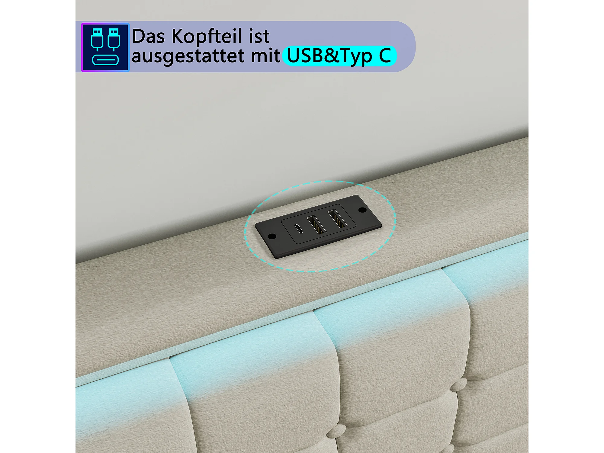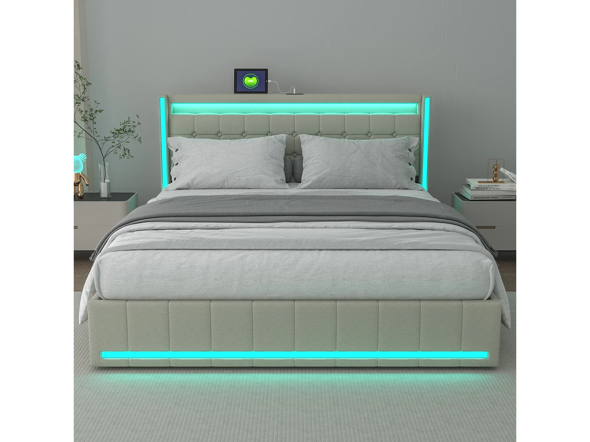 Lit Double 160x200cm - avec Éclairage LED et Charge USB - 4 Tiroirs - Lin - Beige