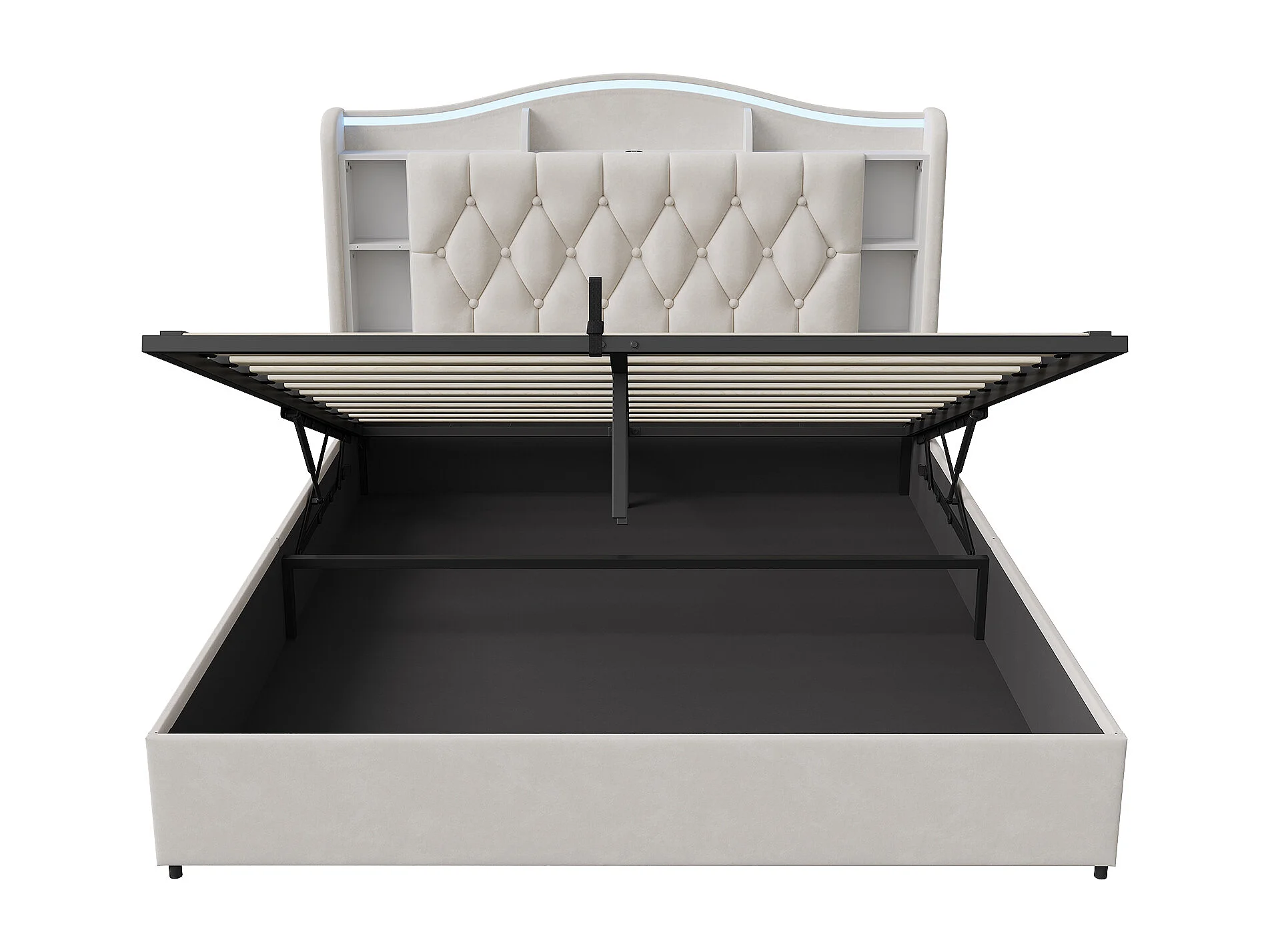 Lit double 160x200cm avec éclairage LED et ports USB - rangement hydraulique - velours - style moderne - beige