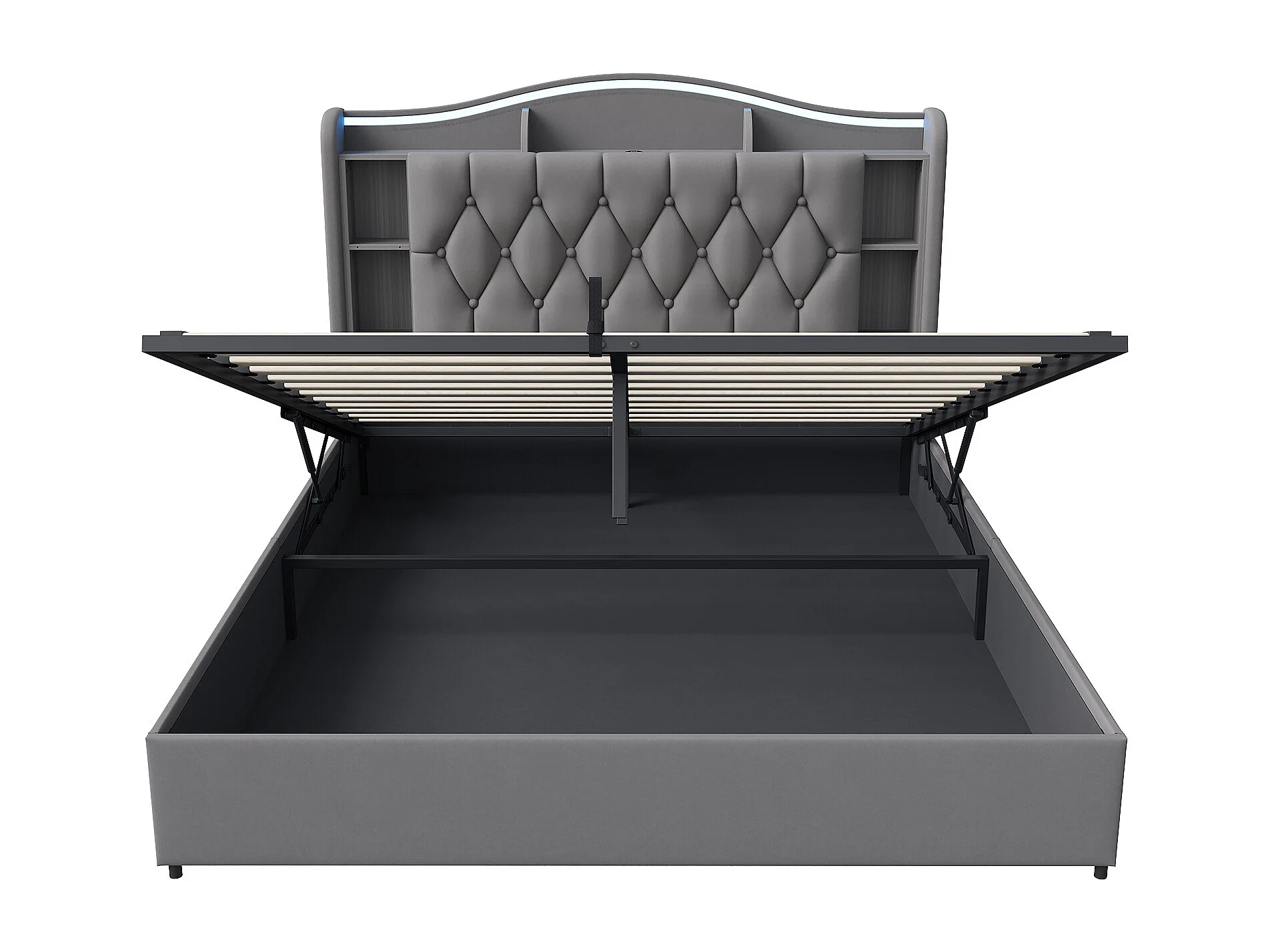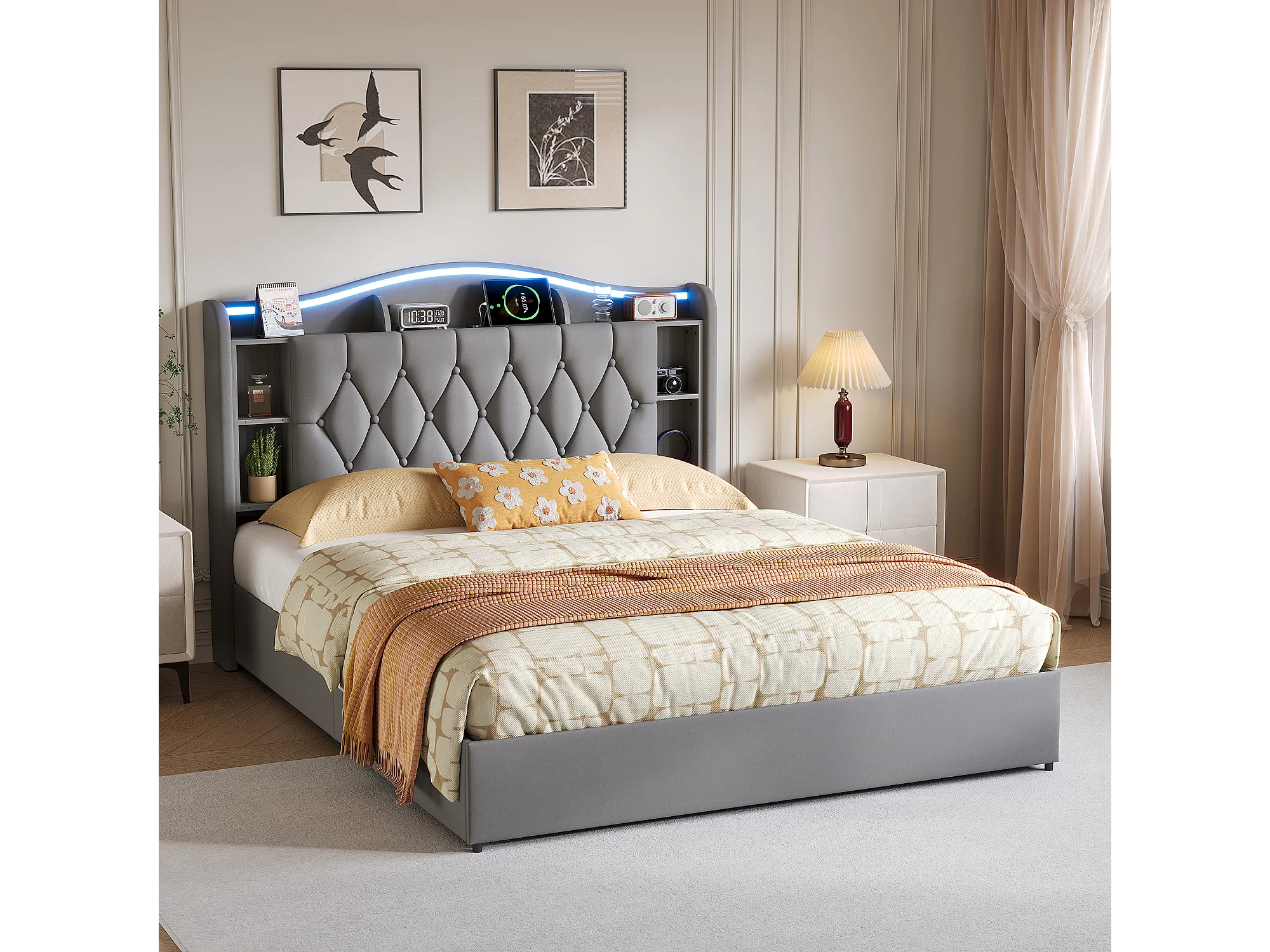 Lit double 160x200cm avec éclairage LED et ports USB - rangement hydraulique - velours - style moderne - gris