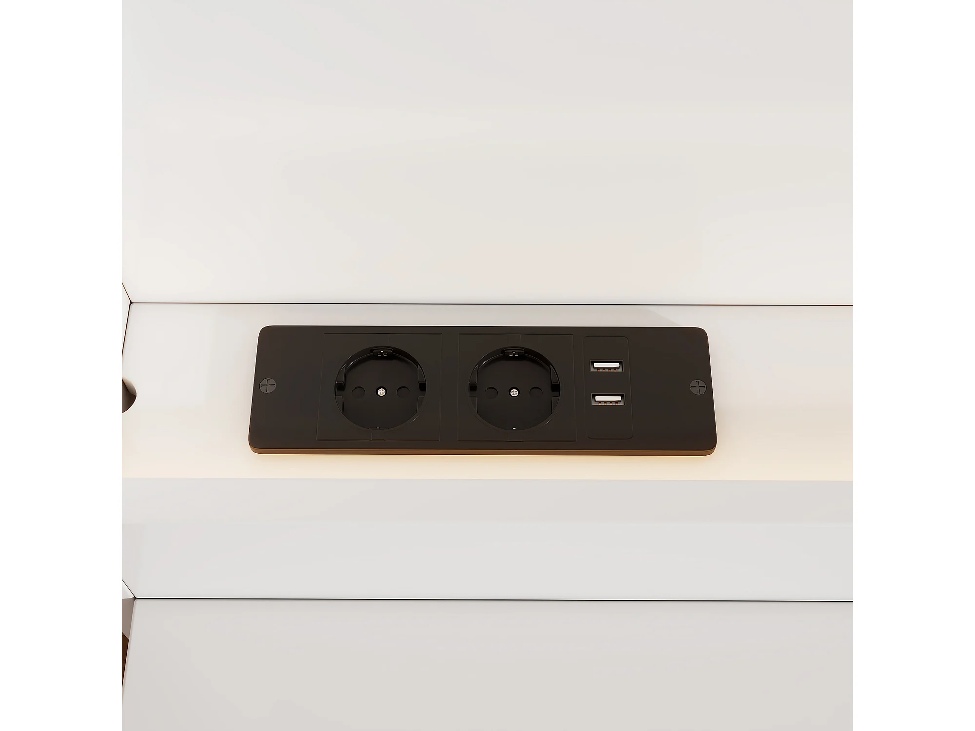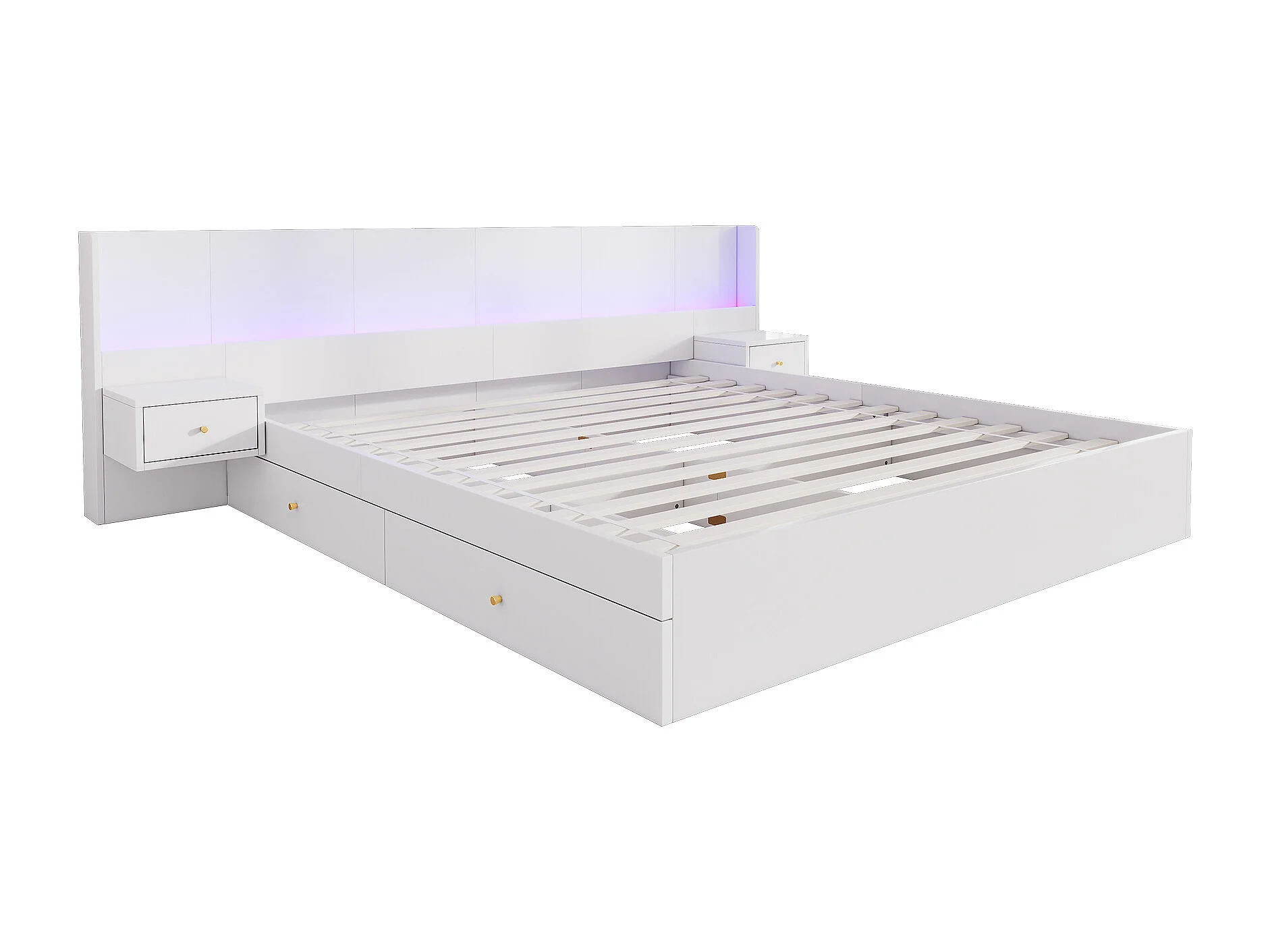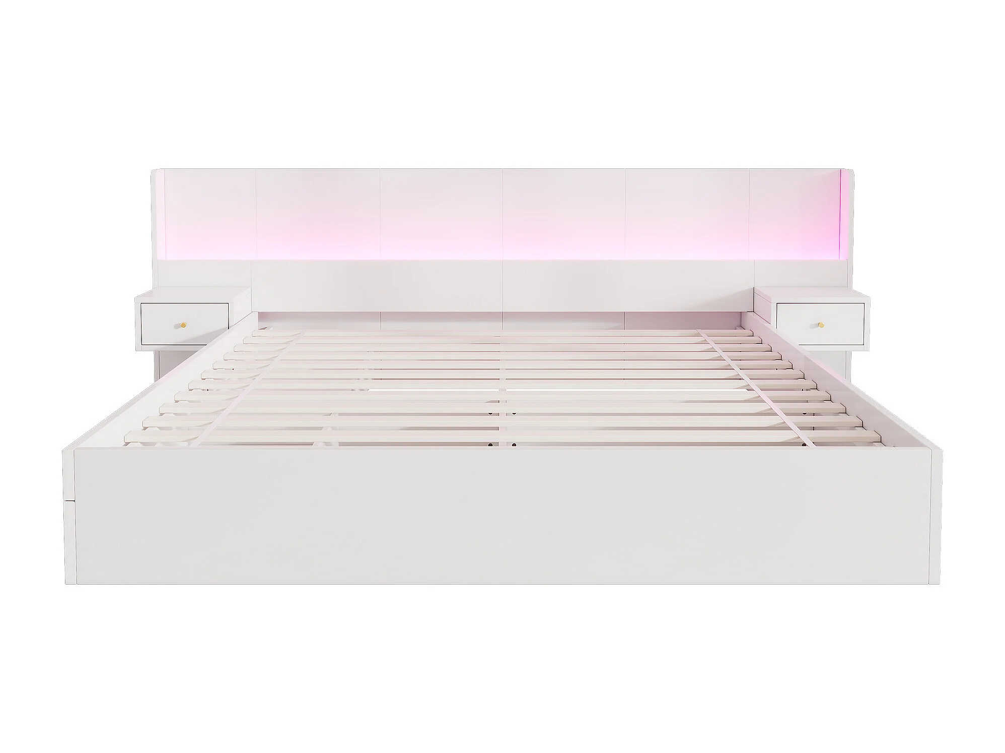 Lit double 180 x 200 cm en bois MDF - Lit adulte avec LED, prise et 2 tables de chevet - Blanc