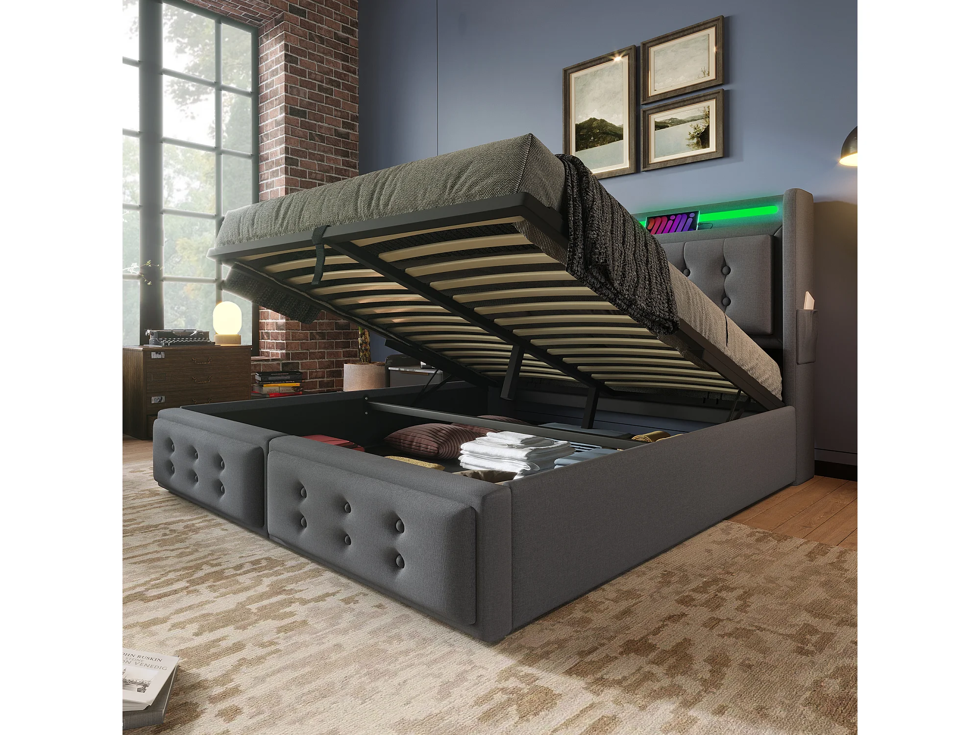 Lit double 180x200 cm avec tête de lit en cuir et fonction de chargement USB, gris, avec rangement pratique