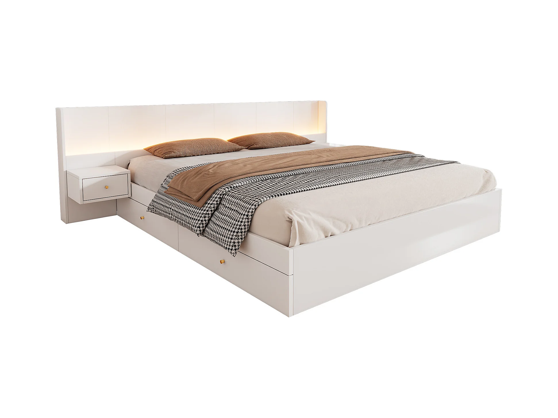 Lit double 180×200 cm blanc, bois, avec port USB, LED, prises, appli mobile, 2 tables de chevet, tiroirs intégrés