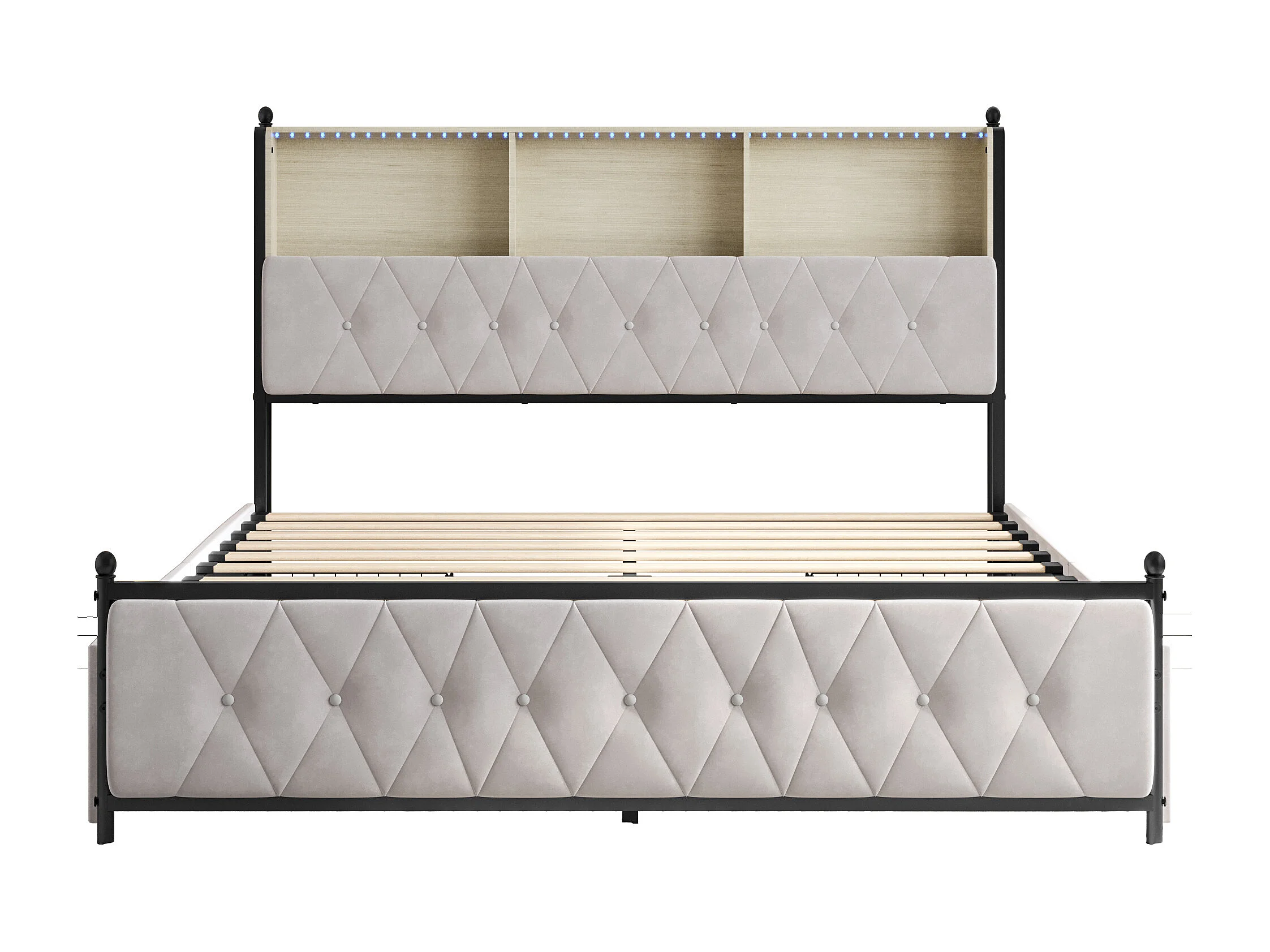 Lit double 180x200cm avec 4 tiroirs - tête de lit avec LED et ports USB- espace de rangement - velours - beige