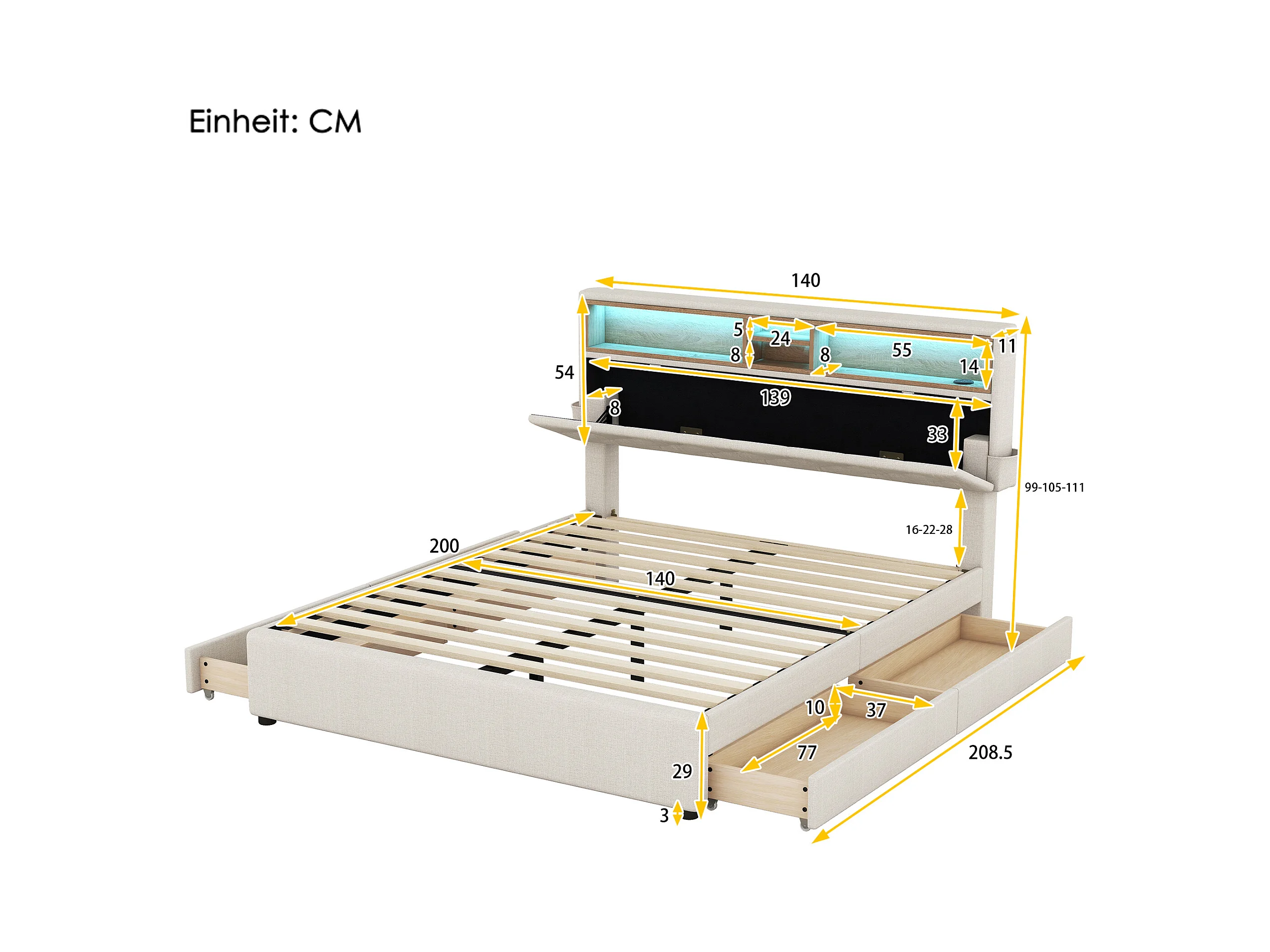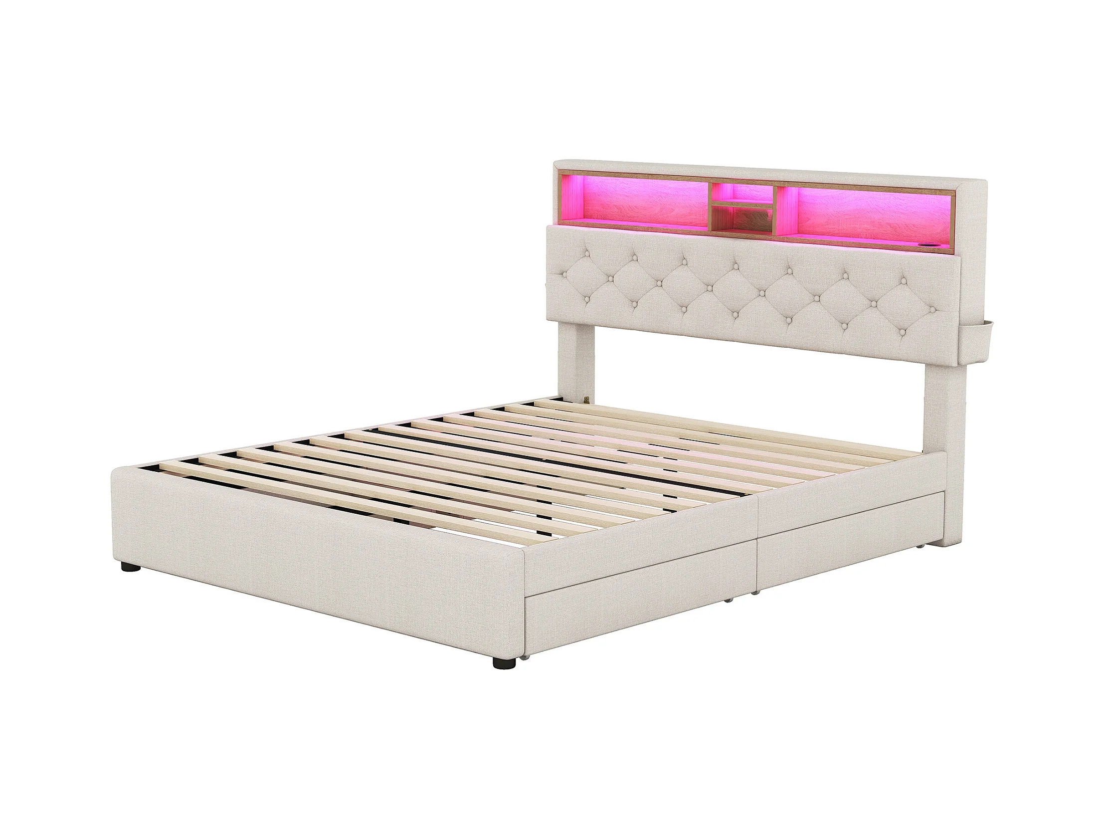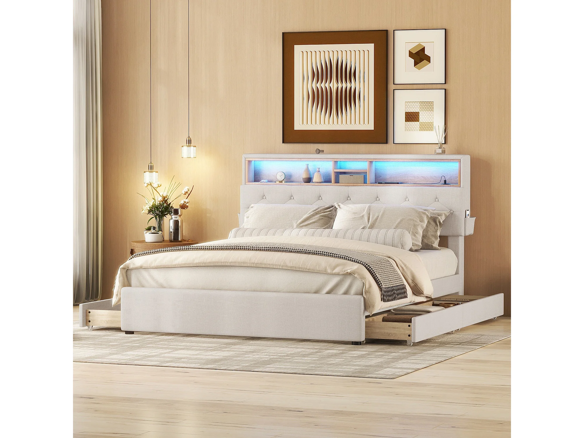 Lit double capitonné 140x200 cm beige avec LED, ports USB, tête réglable et quatre tiroirs de rangement intégrés
