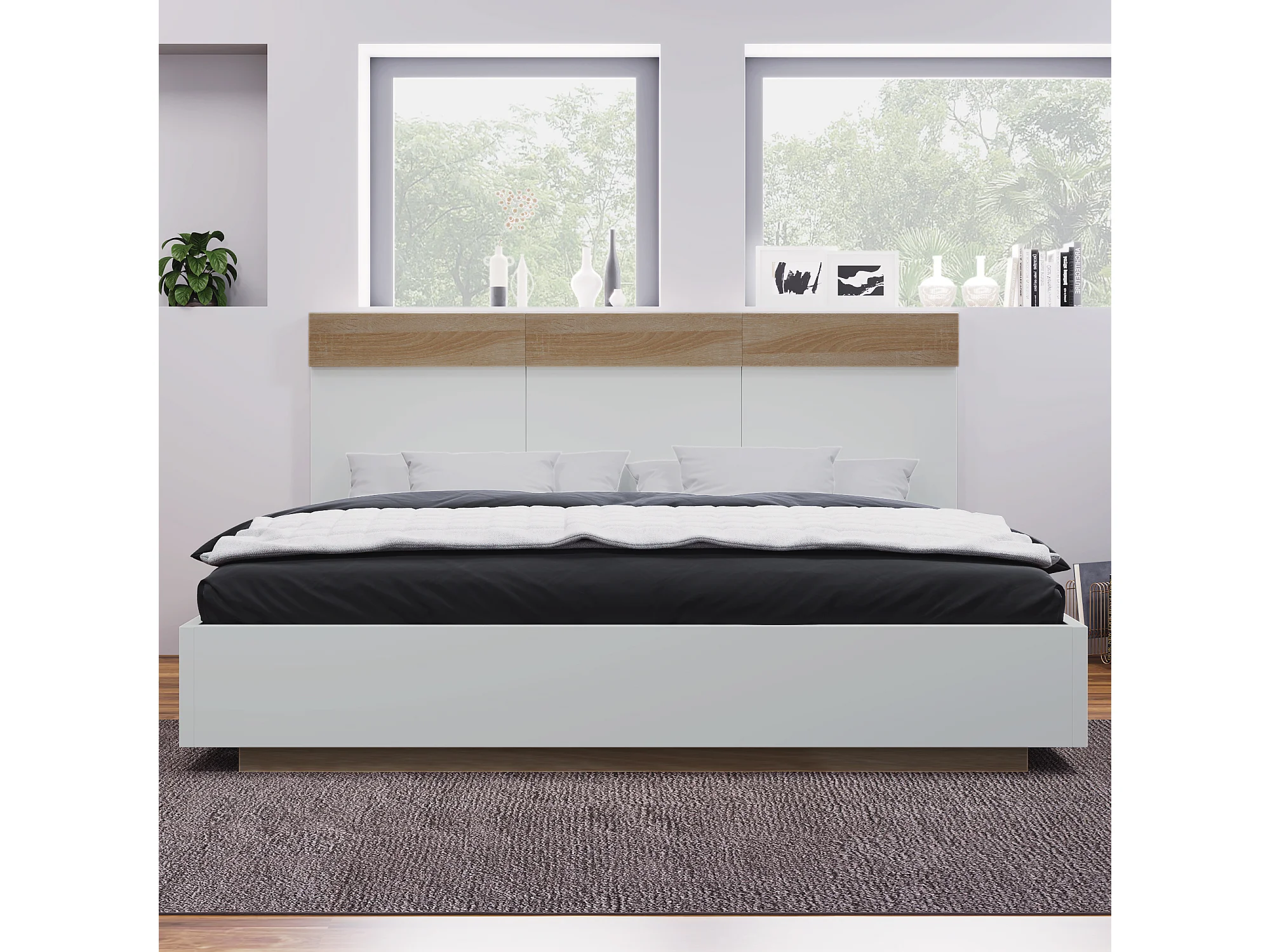 Lit double en bois 180x200 cm, style moderne, tête de lit, couleur de chêne Sonoma et blanc, sans matelas