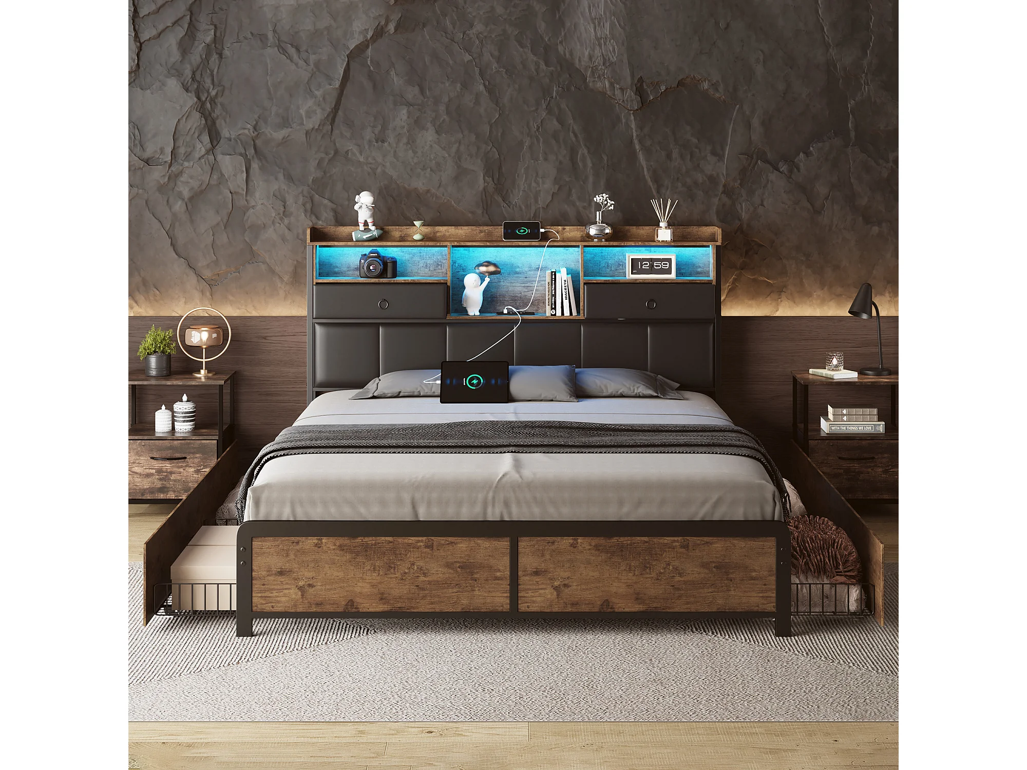 Lit double en métal 140x200cm, lit jeunesse avec LED et étagère, lit coffre avec 4 tiroirs, noir