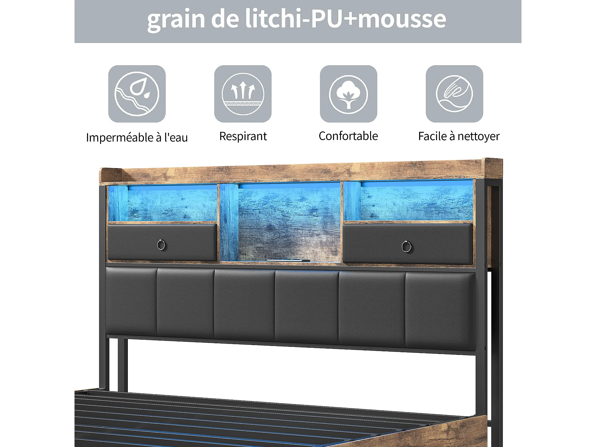 Lit double en métal 160x200cm, lit jeunesse avec LED et étagère, lit coffre avec 4 tiroirs, noir
