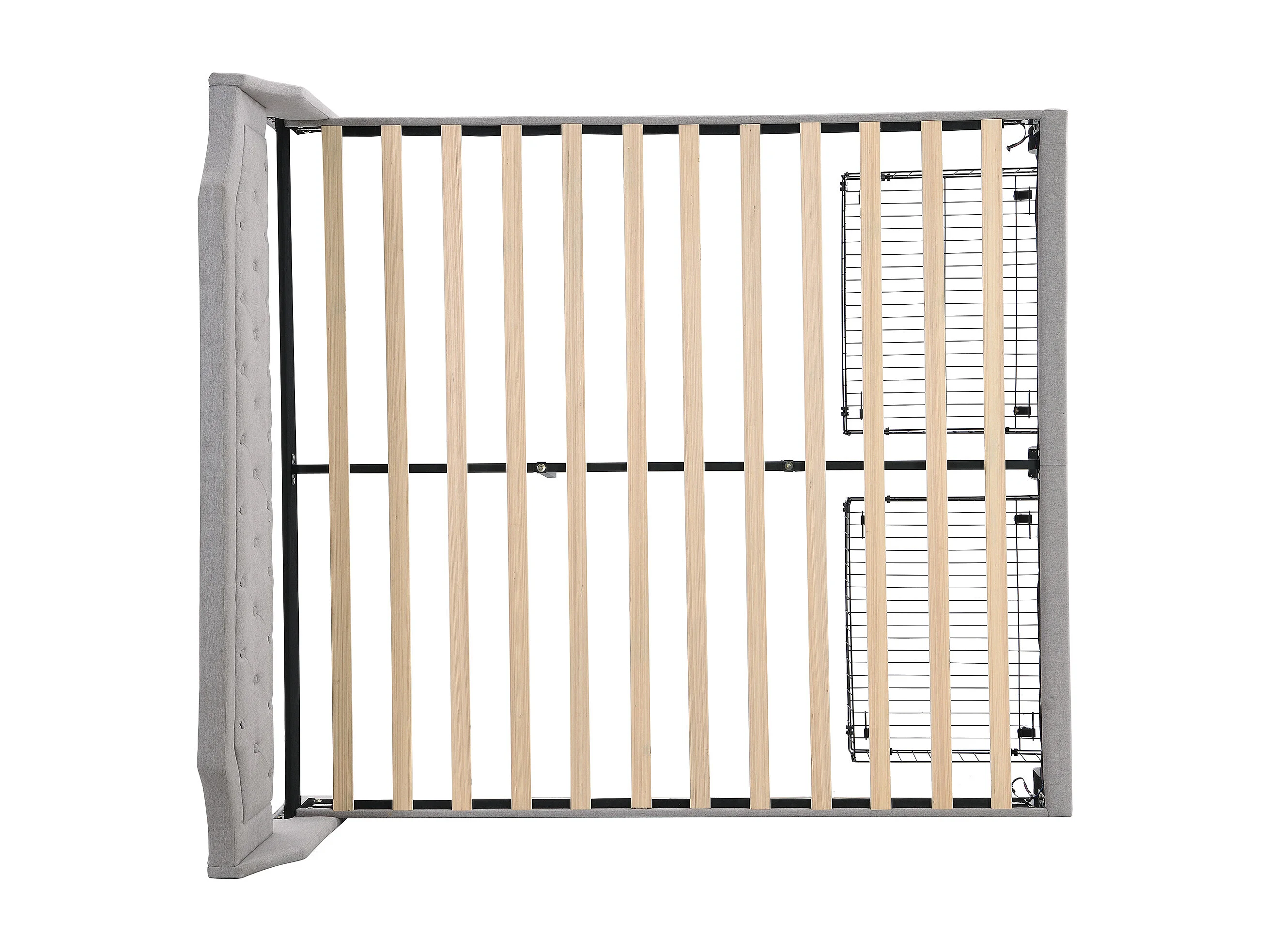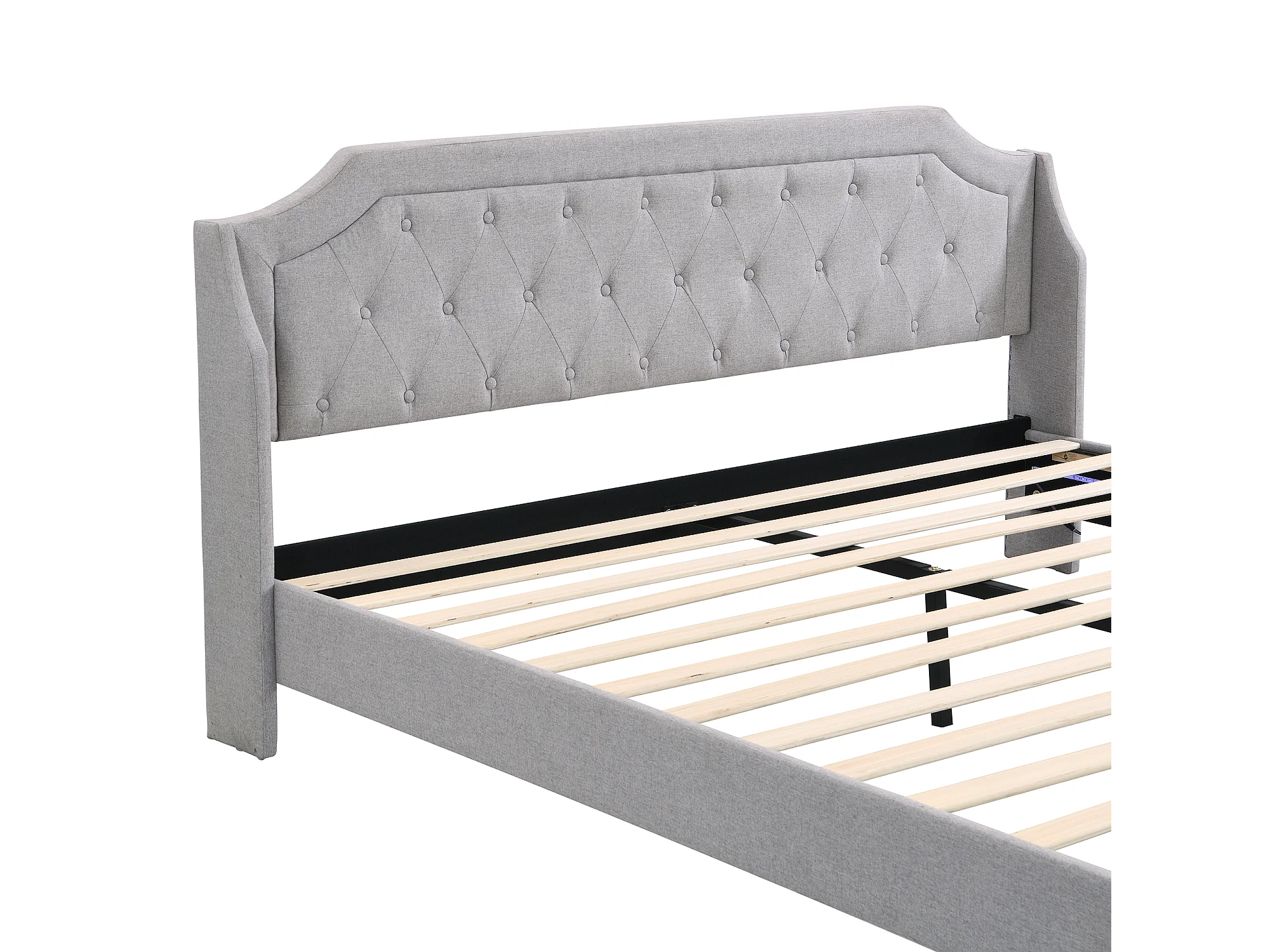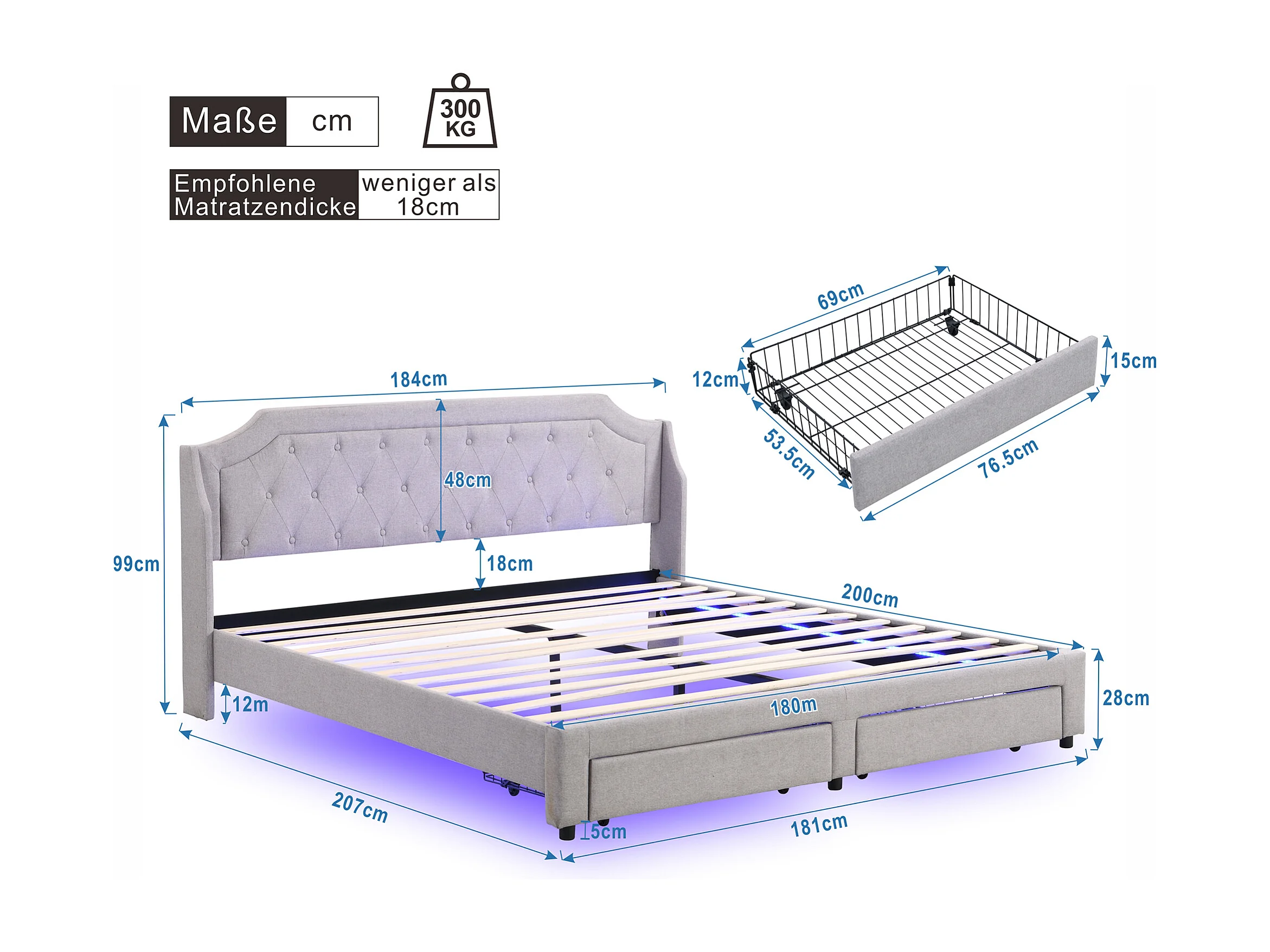 Lit double Lit adulte 180x200 cm avec 2 tiroirs, tête de lit, éclairage LED, tissu en lin gris, sans matelas