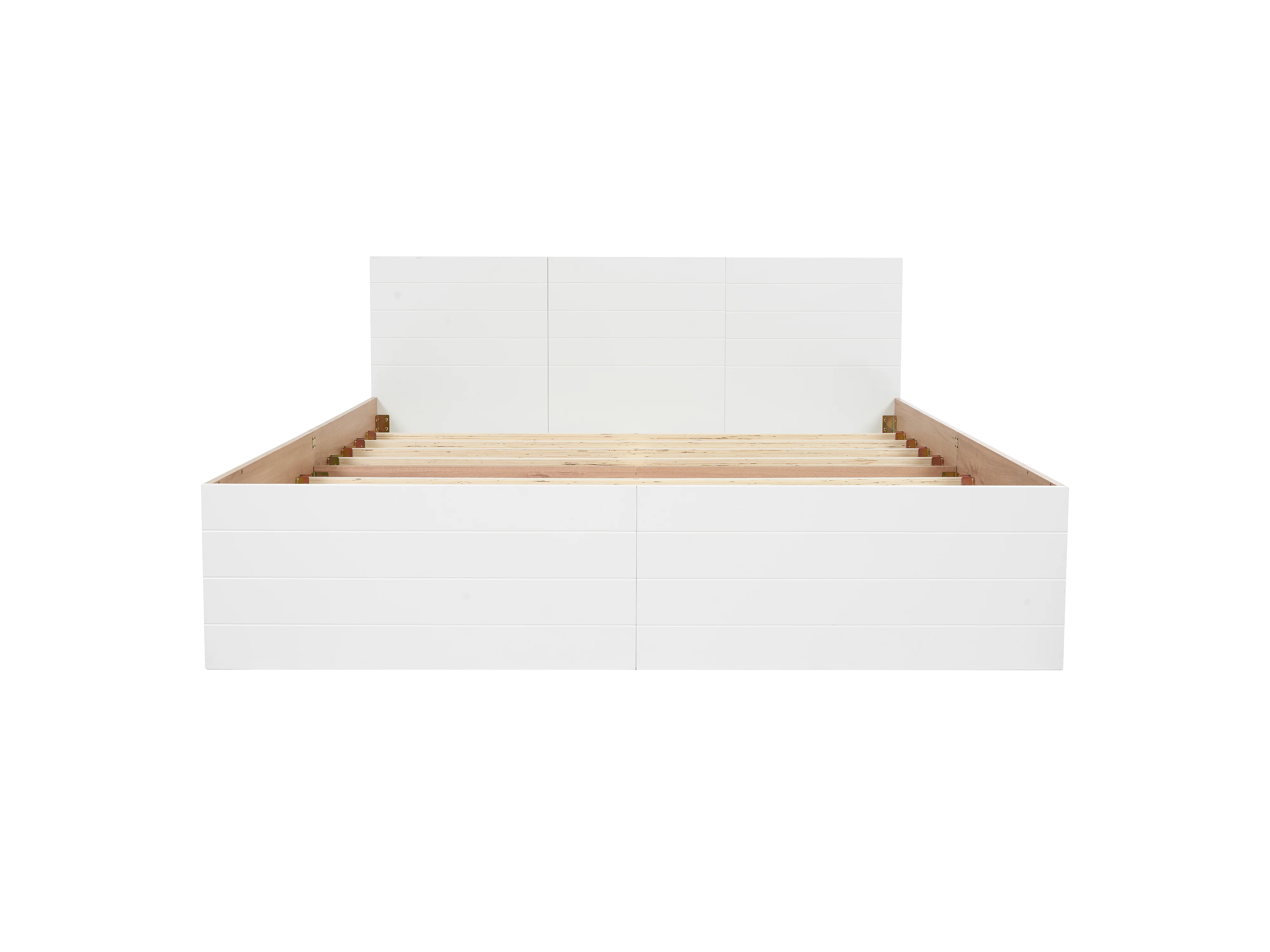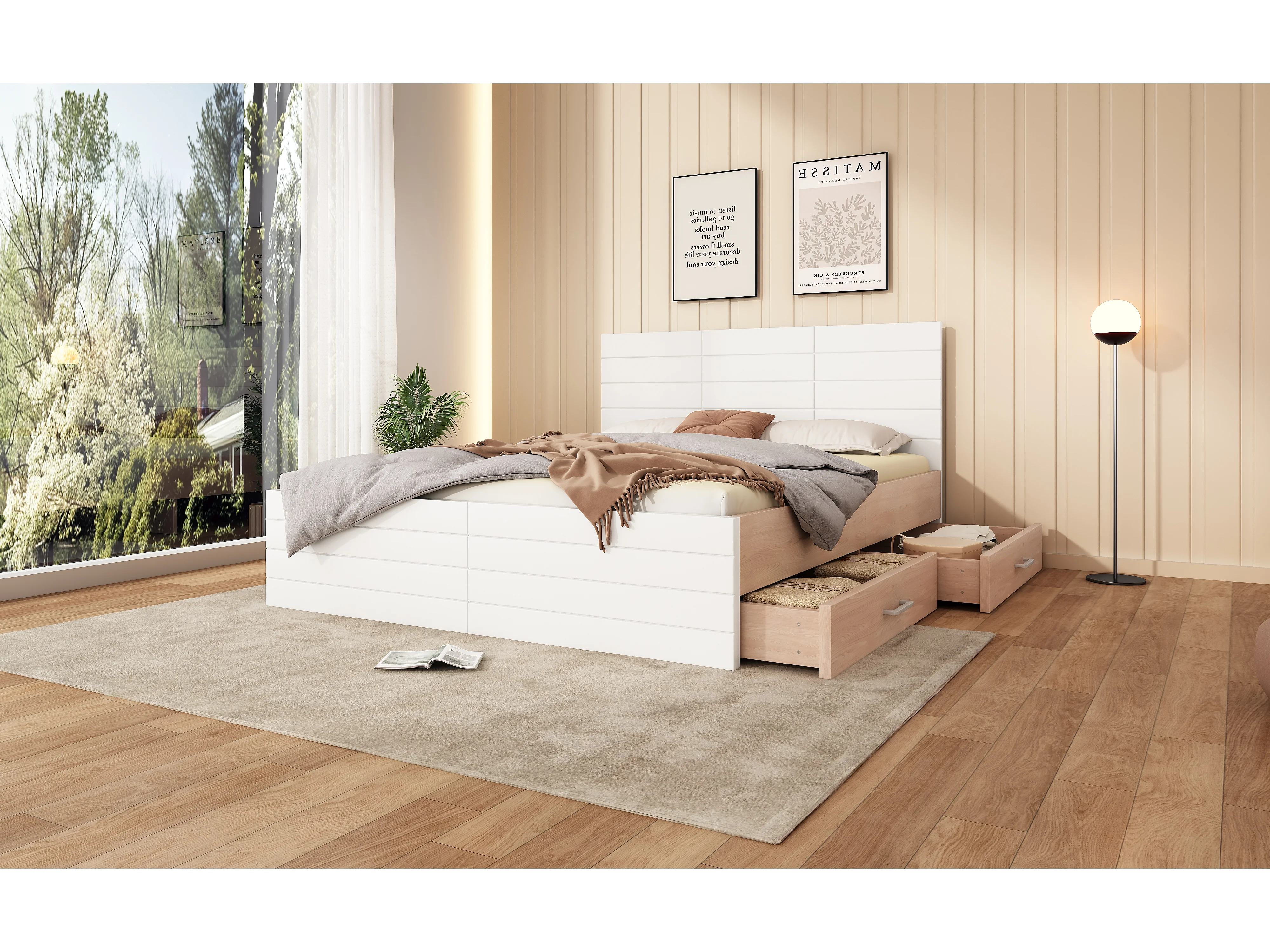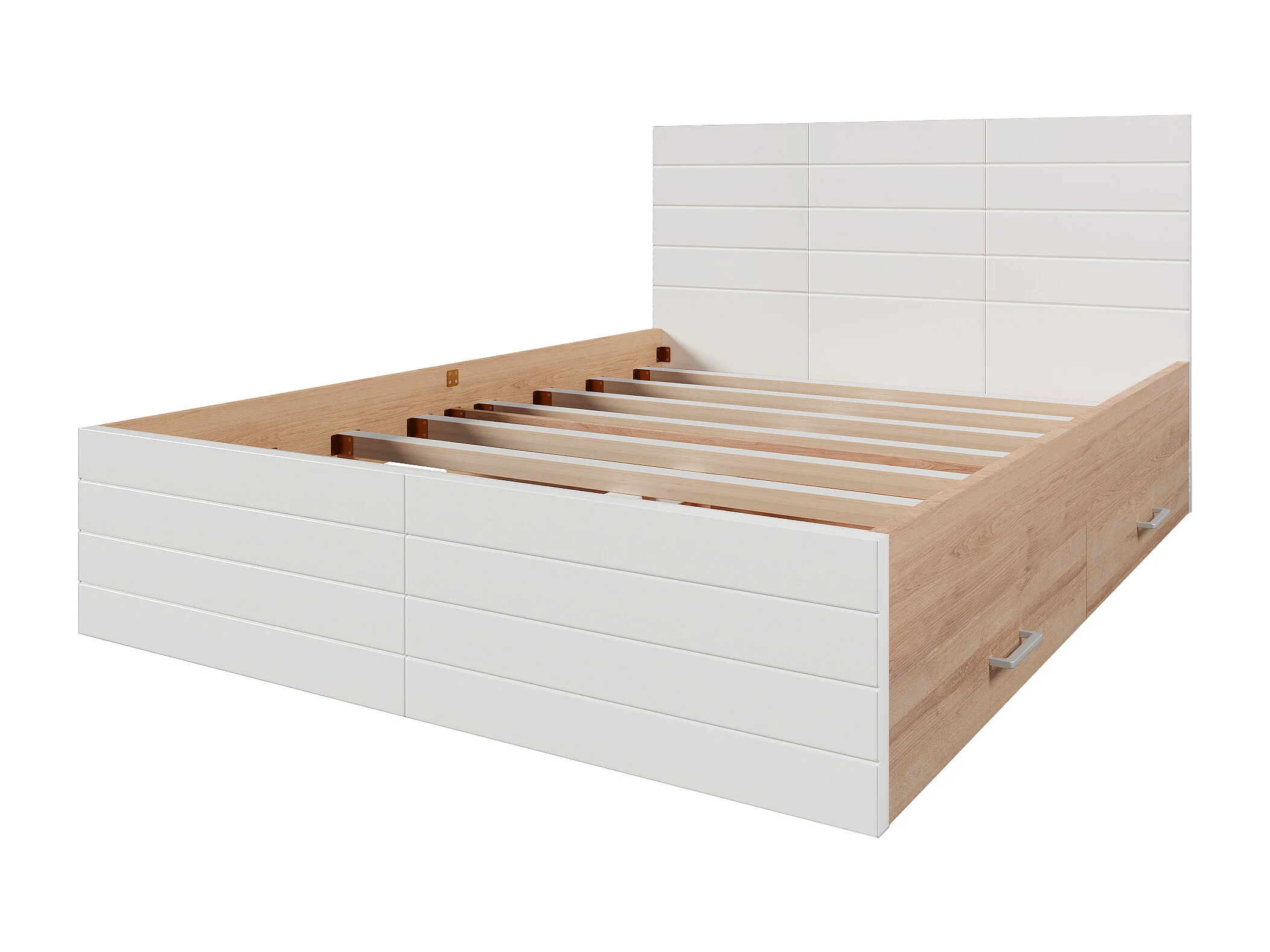 Lit double moderne 160×200 cm avec 2 tiroirs, cadre de lit et sommier à lattes, en bois blanc, sans matelas