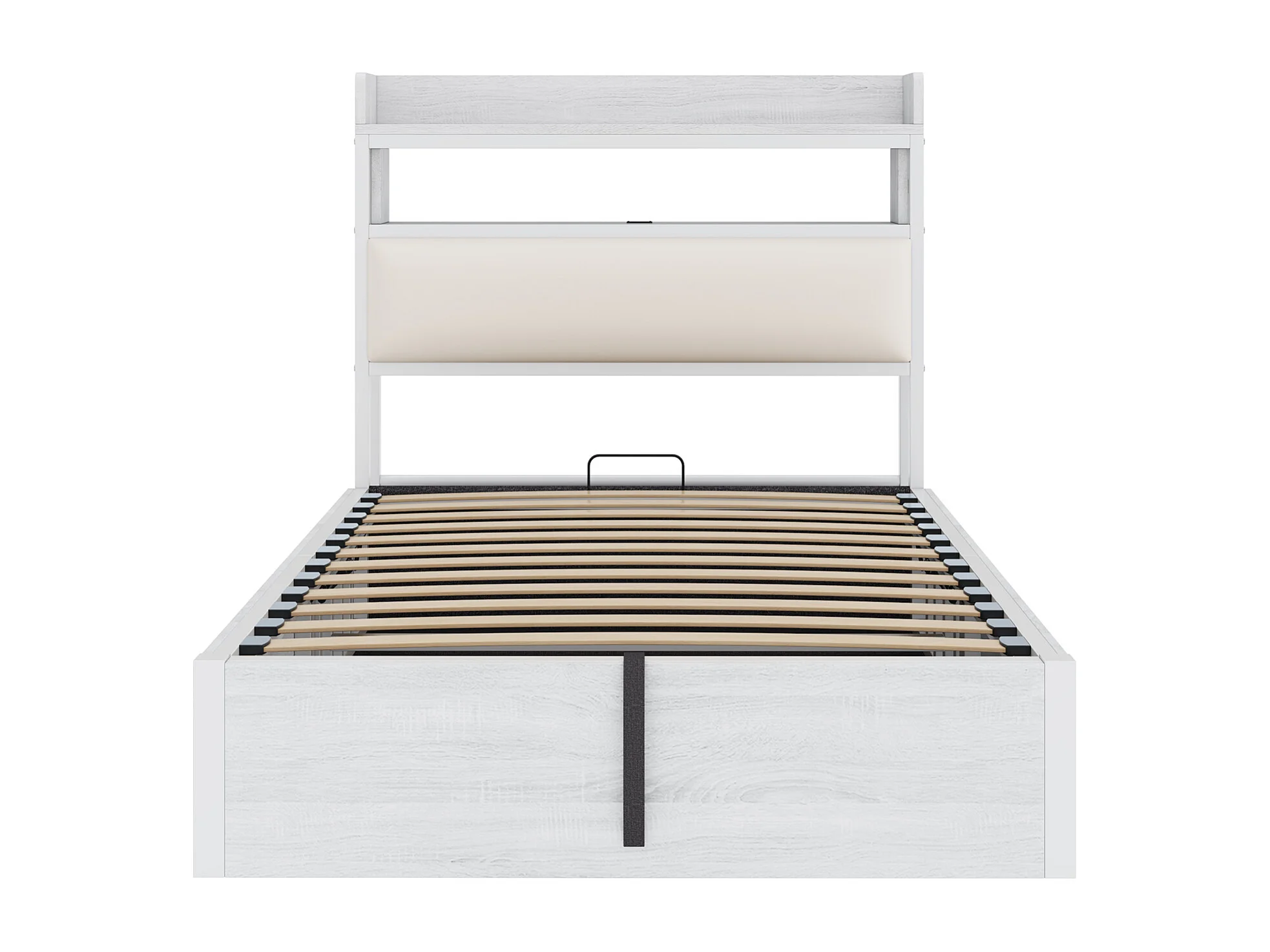 Lit Double Rembourré avec USB, avec espace de rangement, 90 x 200 cm, Sommier à Lattes, Blanc