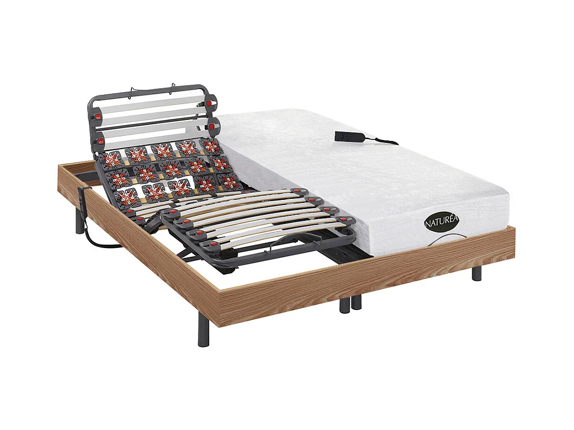 Lit électrique de relaxation lattes et plots + matelas mémoire de forme et bambou - 2 x 90 x 200 cm - Chêne - DAMYSOS de NATUREA