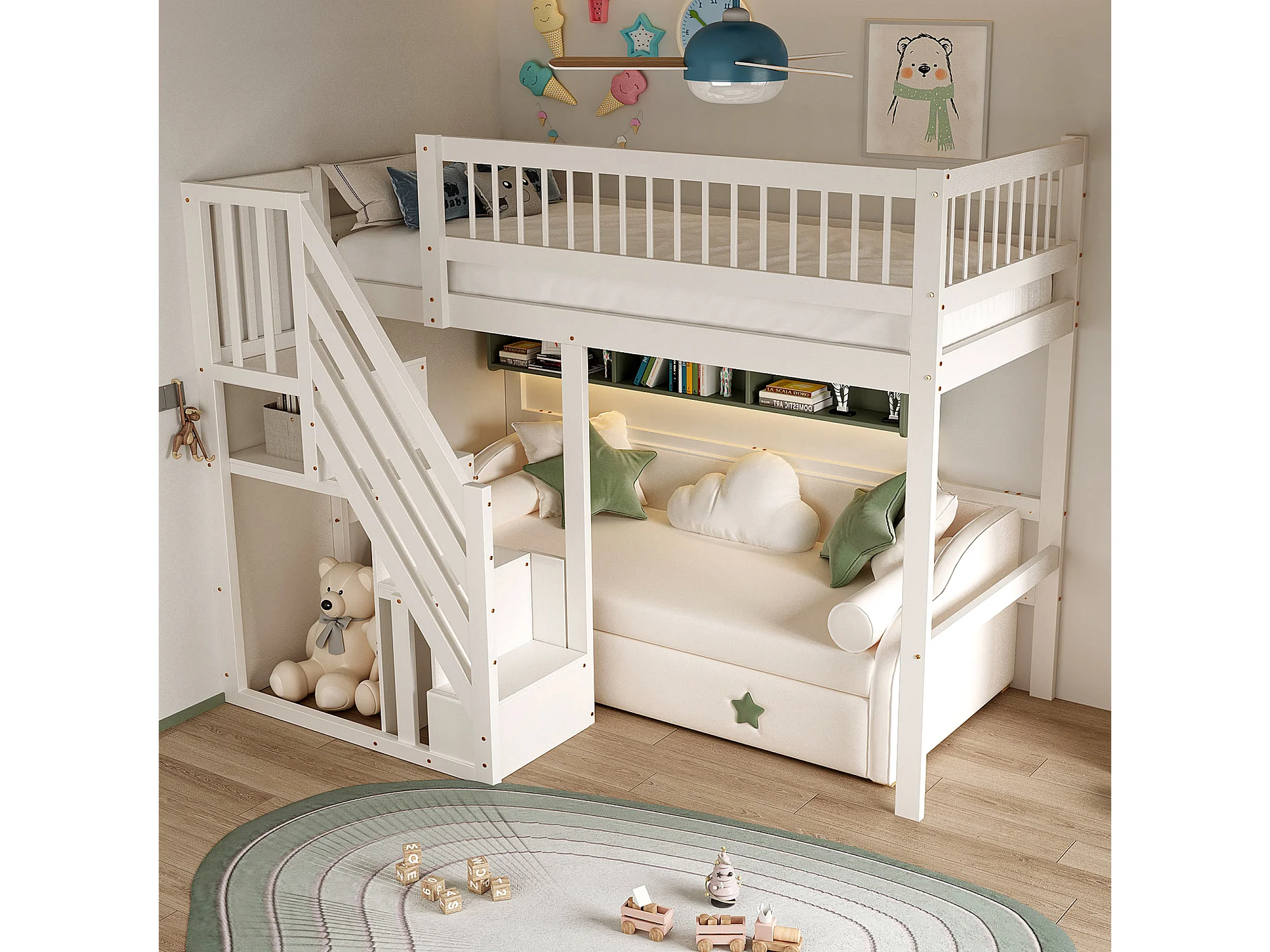Lit en bois massif 90x200 cm blanc, avec escalier et armoire de rangement, lit enfant ou ado, cadre haut solide