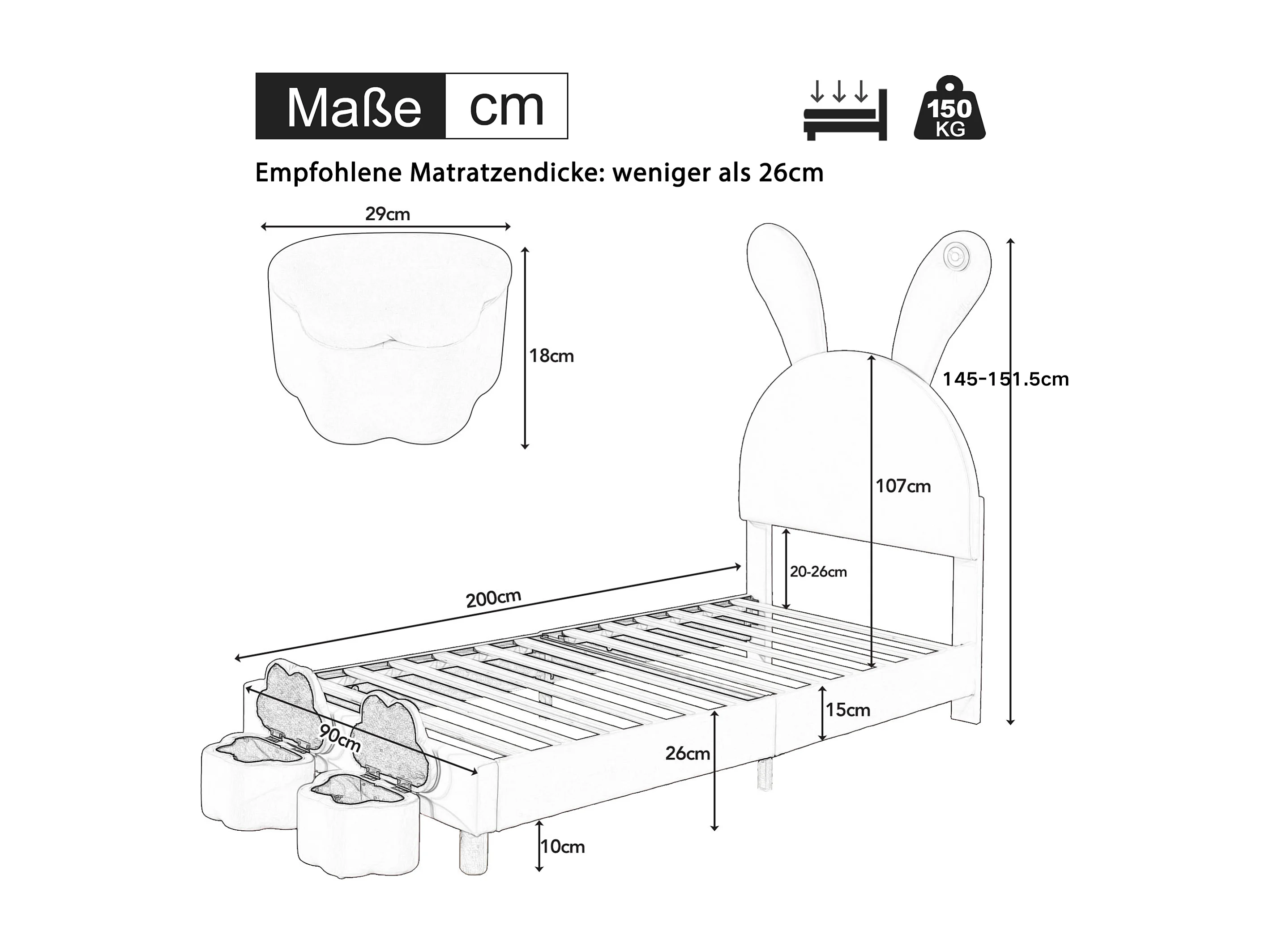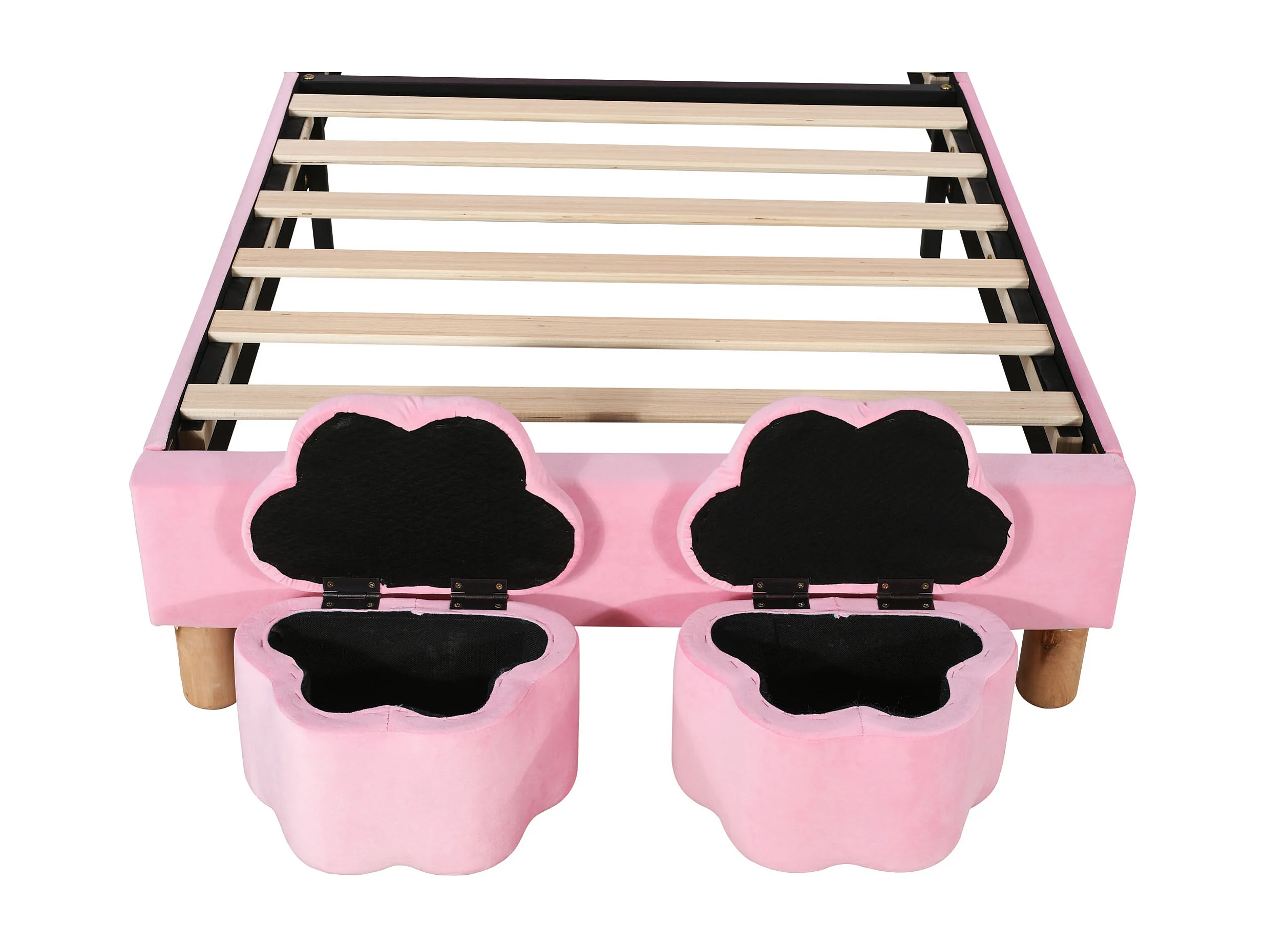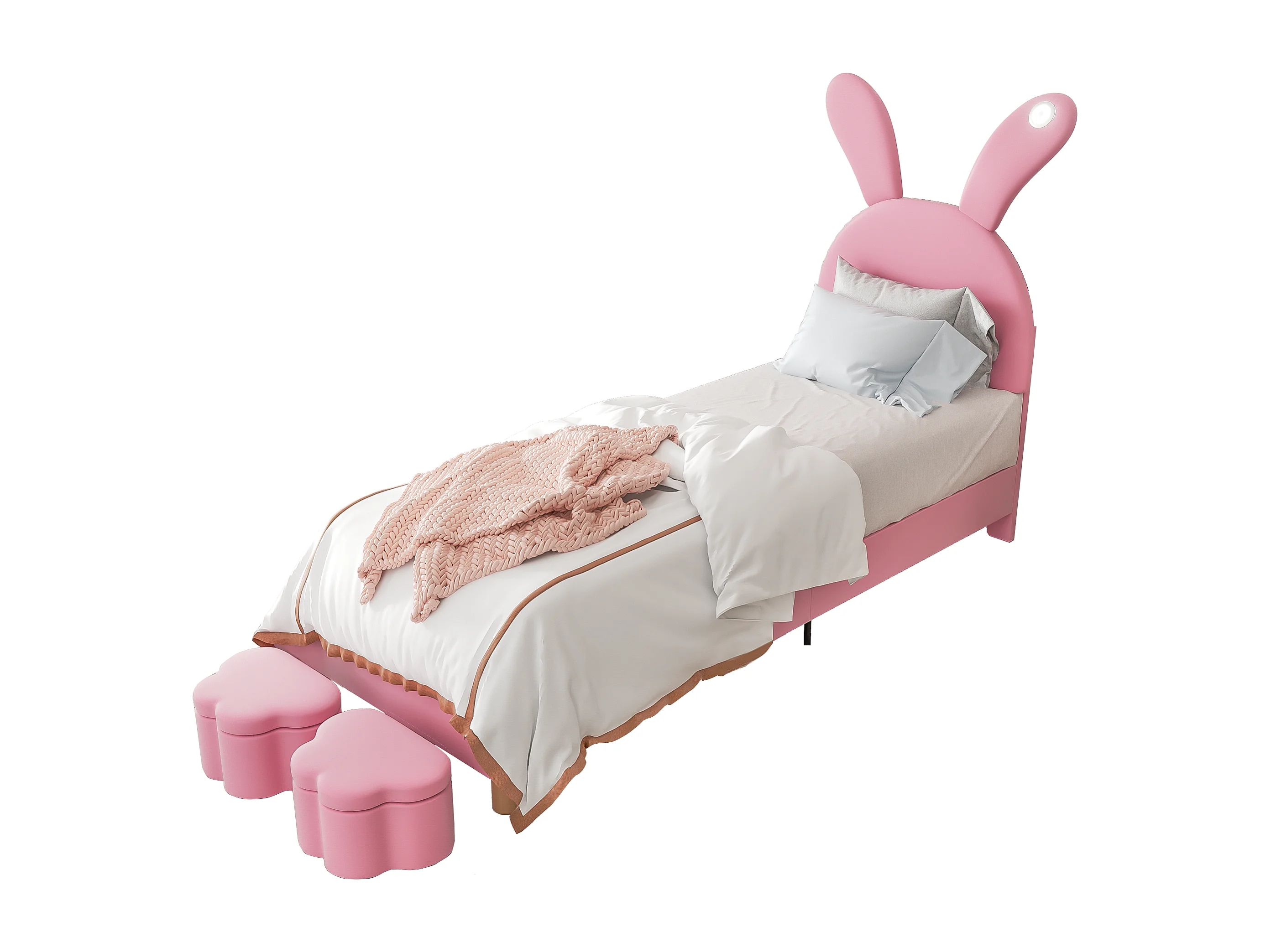 Lit en velours rose 90x200 cm avec deux bancs de rangement, éclairage LED et oreilles de lapin pliables