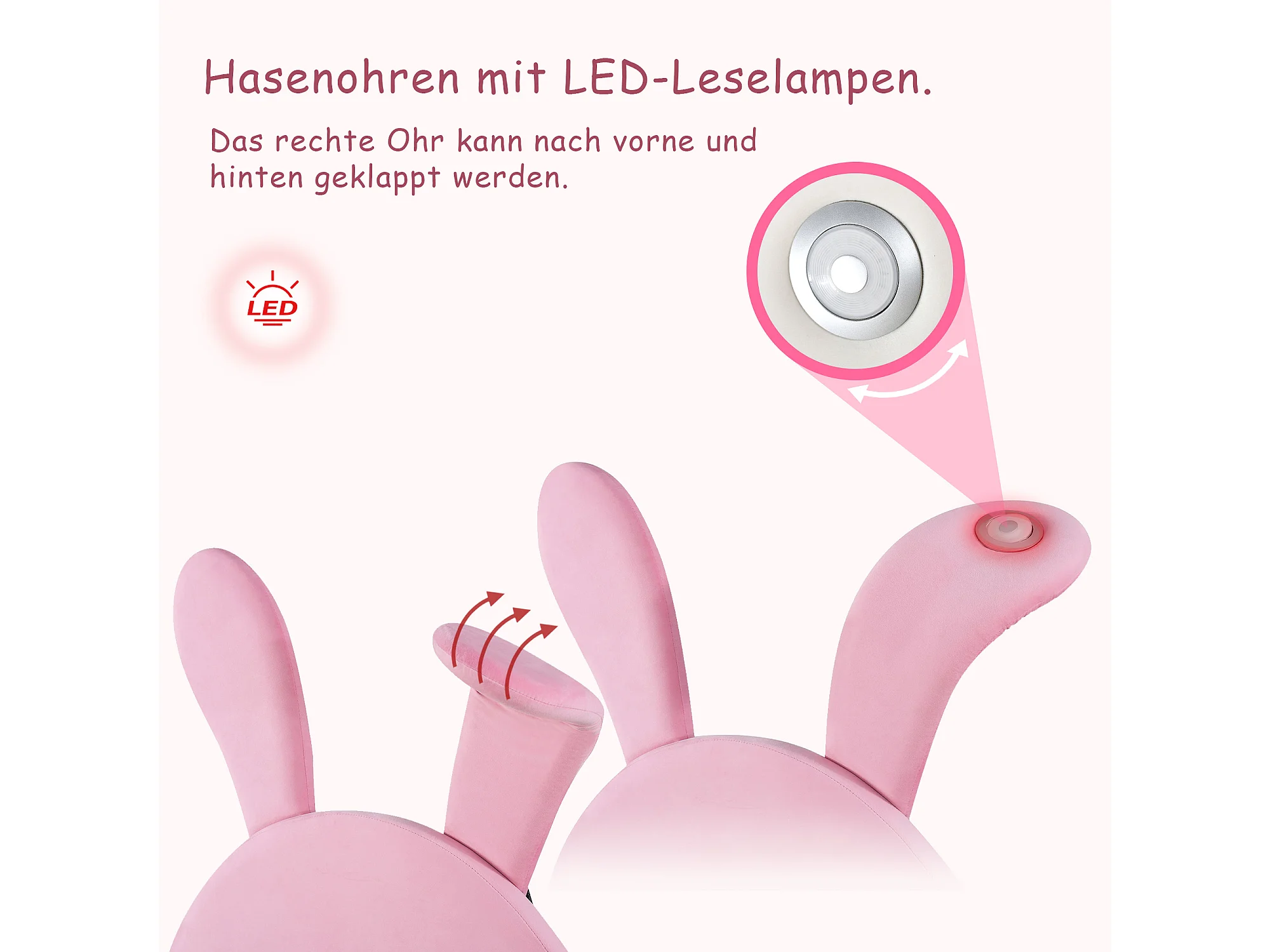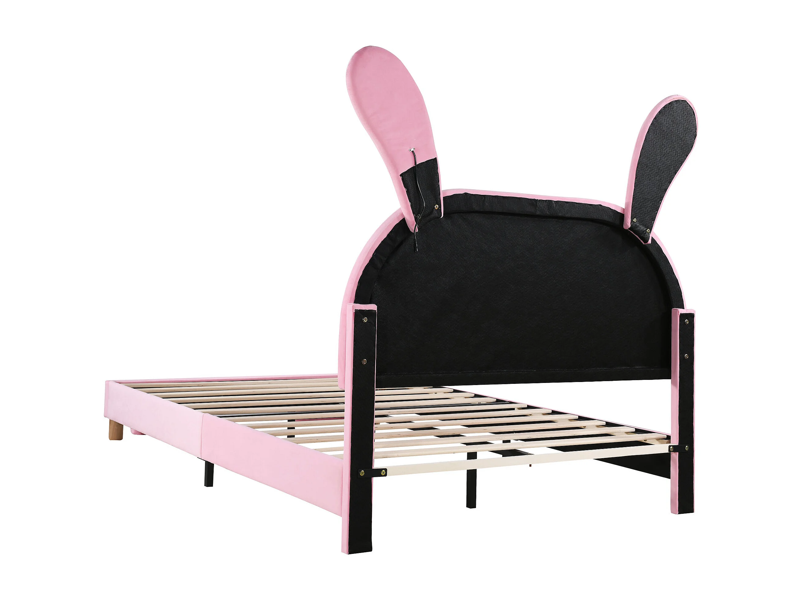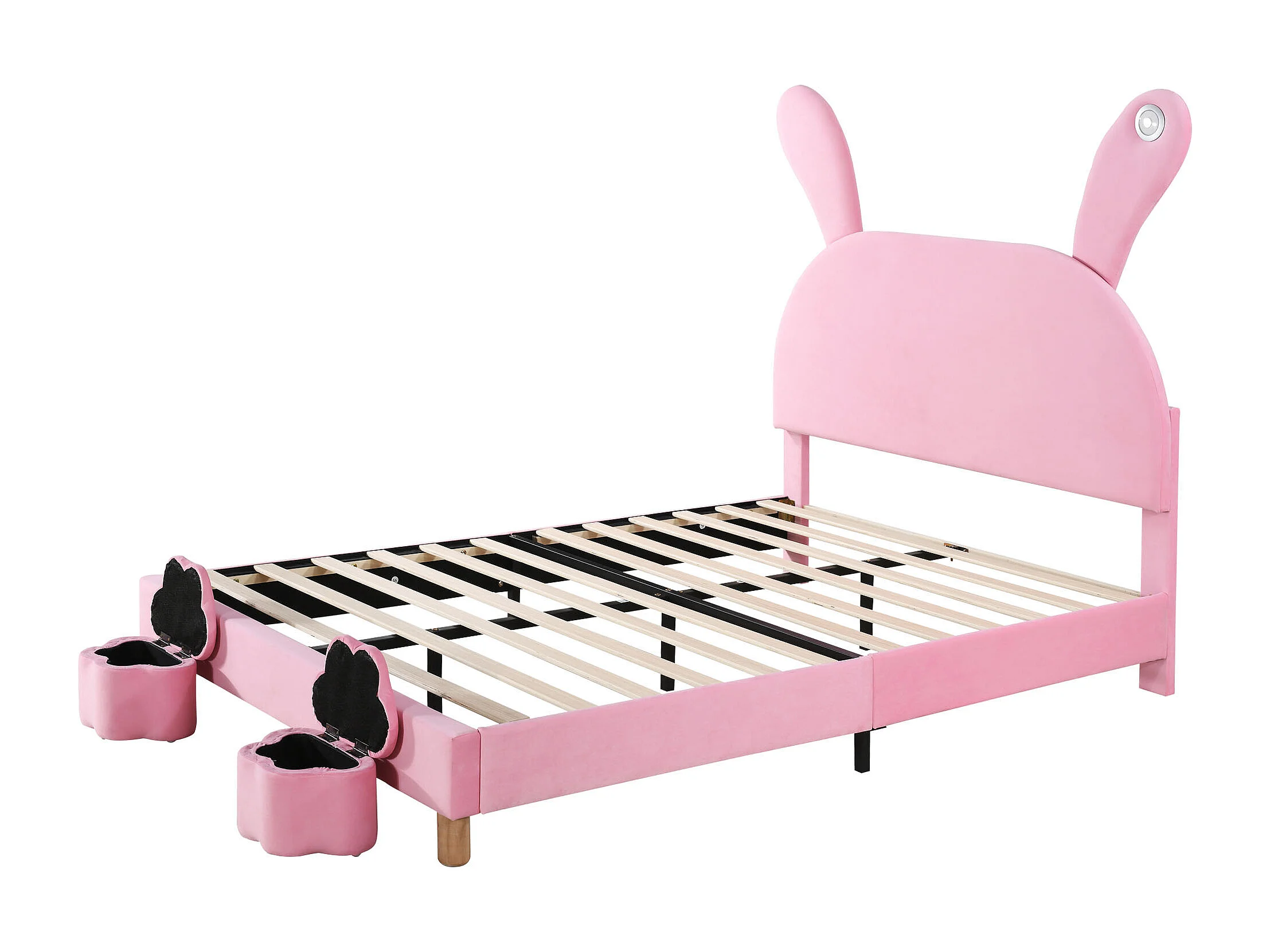 Lit Enfants 140 x 200 cm - Avec Deux Coffres, Éclairage LED Intégré Et Oreilles De Lapin Repliables - En Velours Français - Sans Matelas - Rose