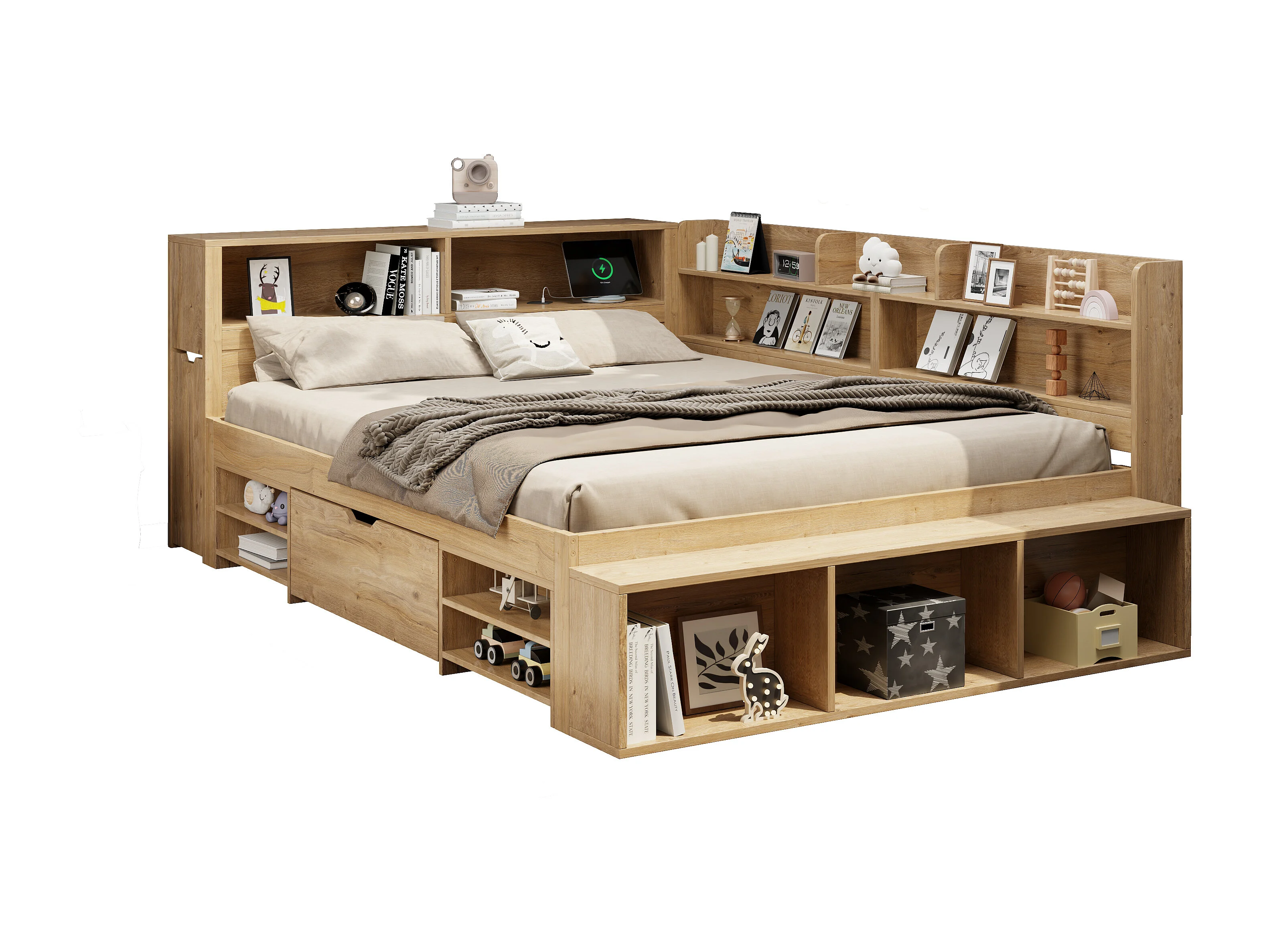 Lit enfant 140x200 cm - avec 1 tiroir - avec bibliothèque et rangement - sommier à lattes - naturel (sans matelas)