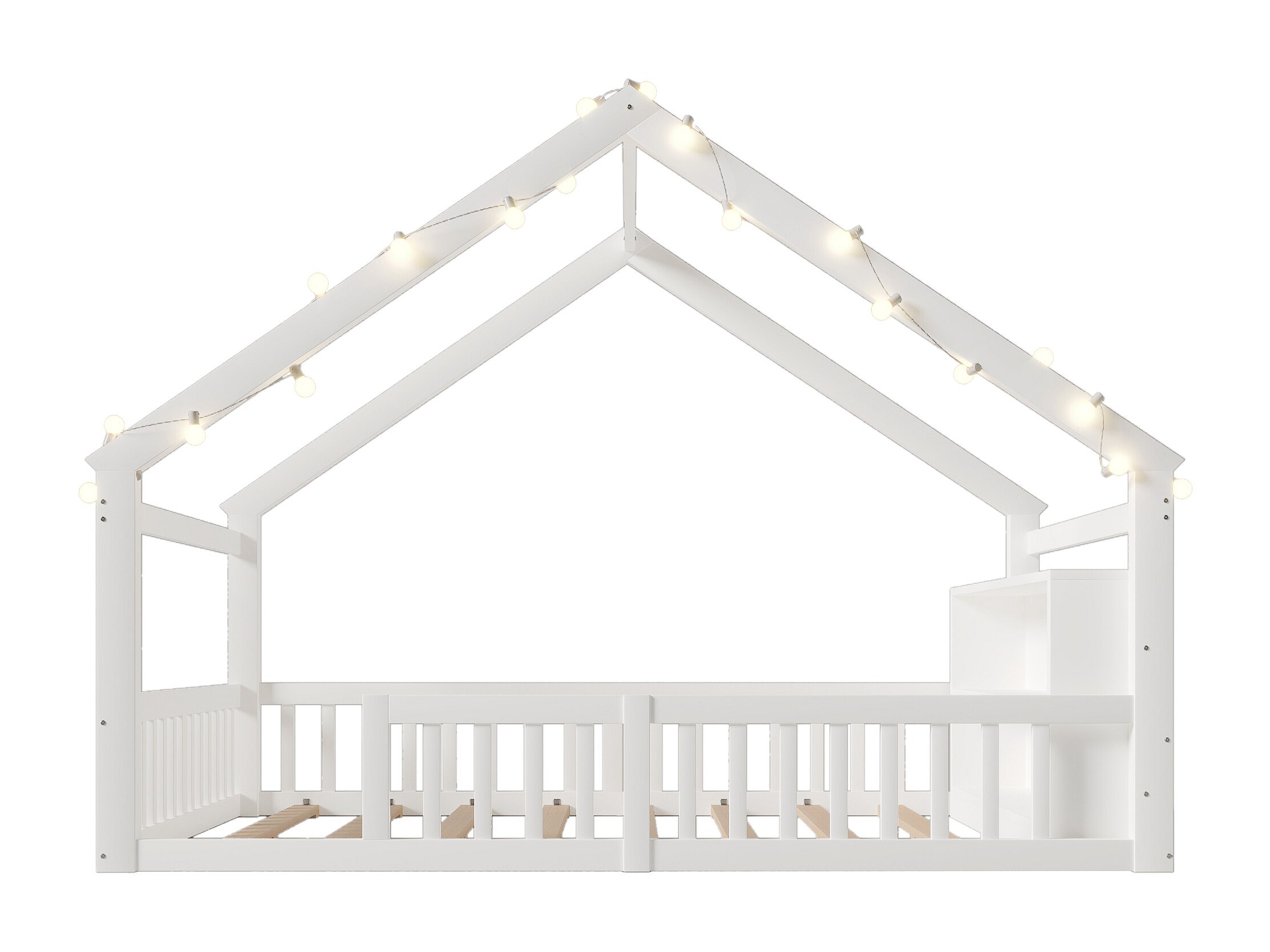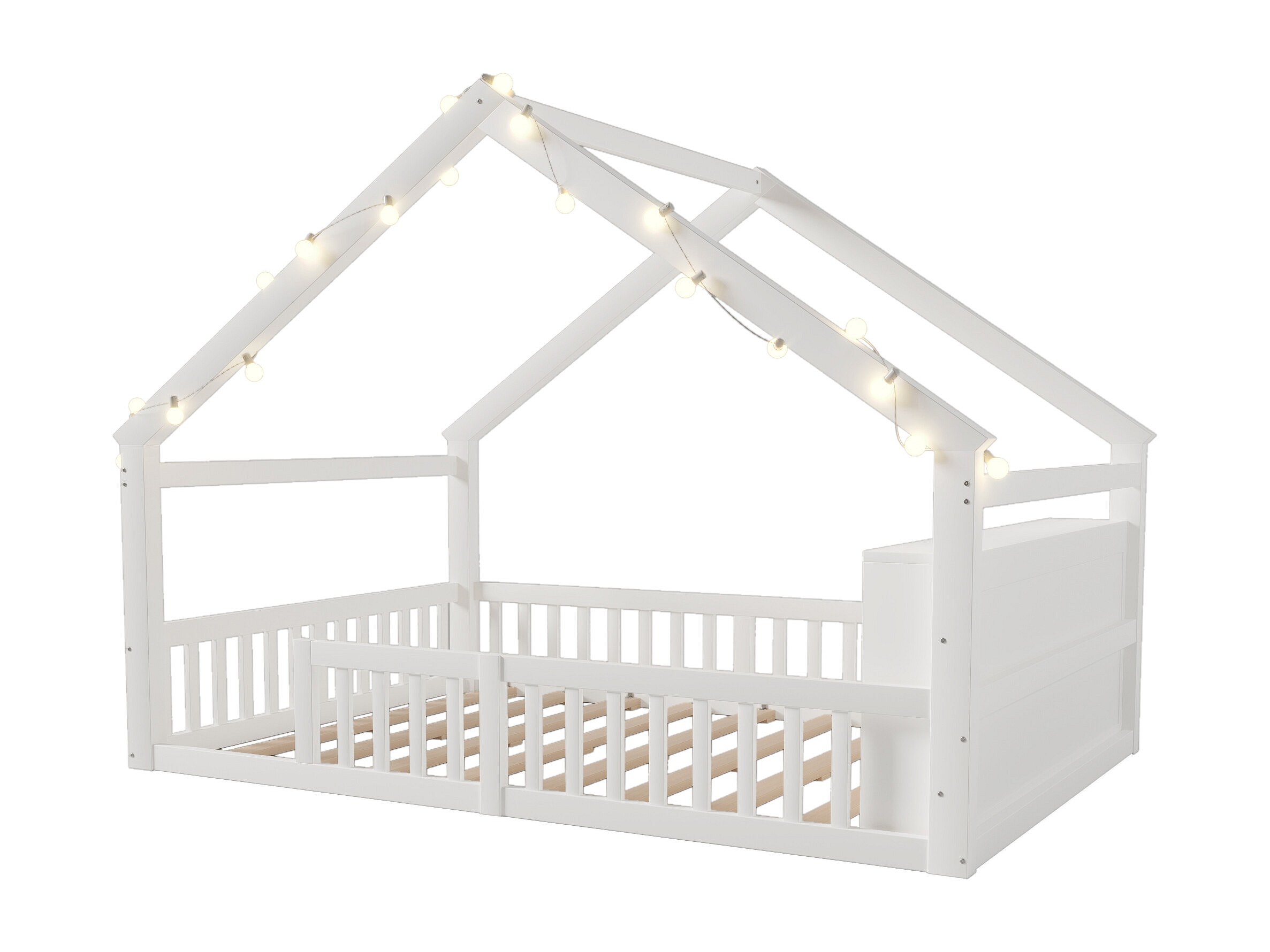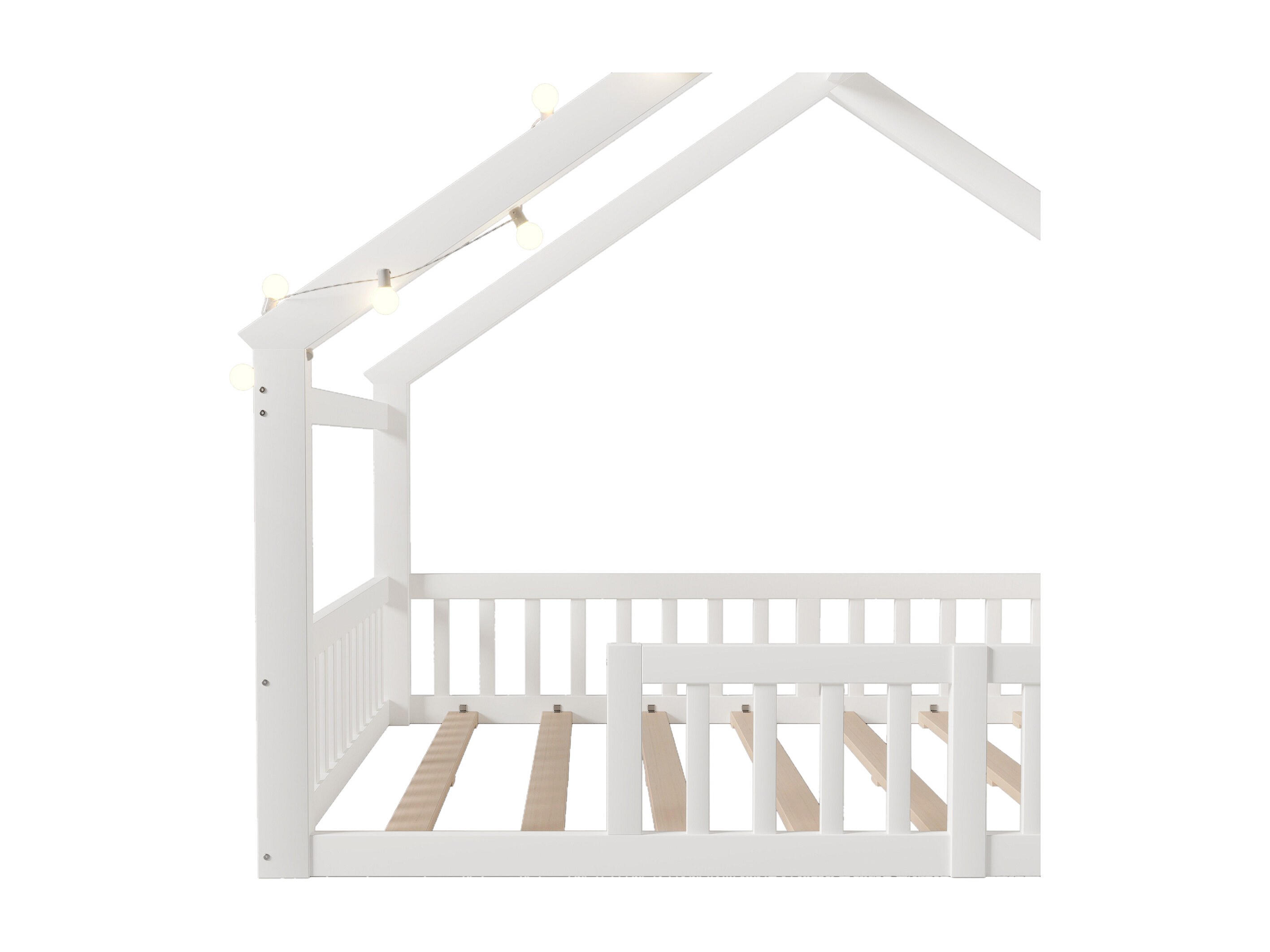 Lit cabane enfant 140x200cm, cadre de lit, sans sommier à lattes, lit enfant avec clôture et porte, Pin, Blanc