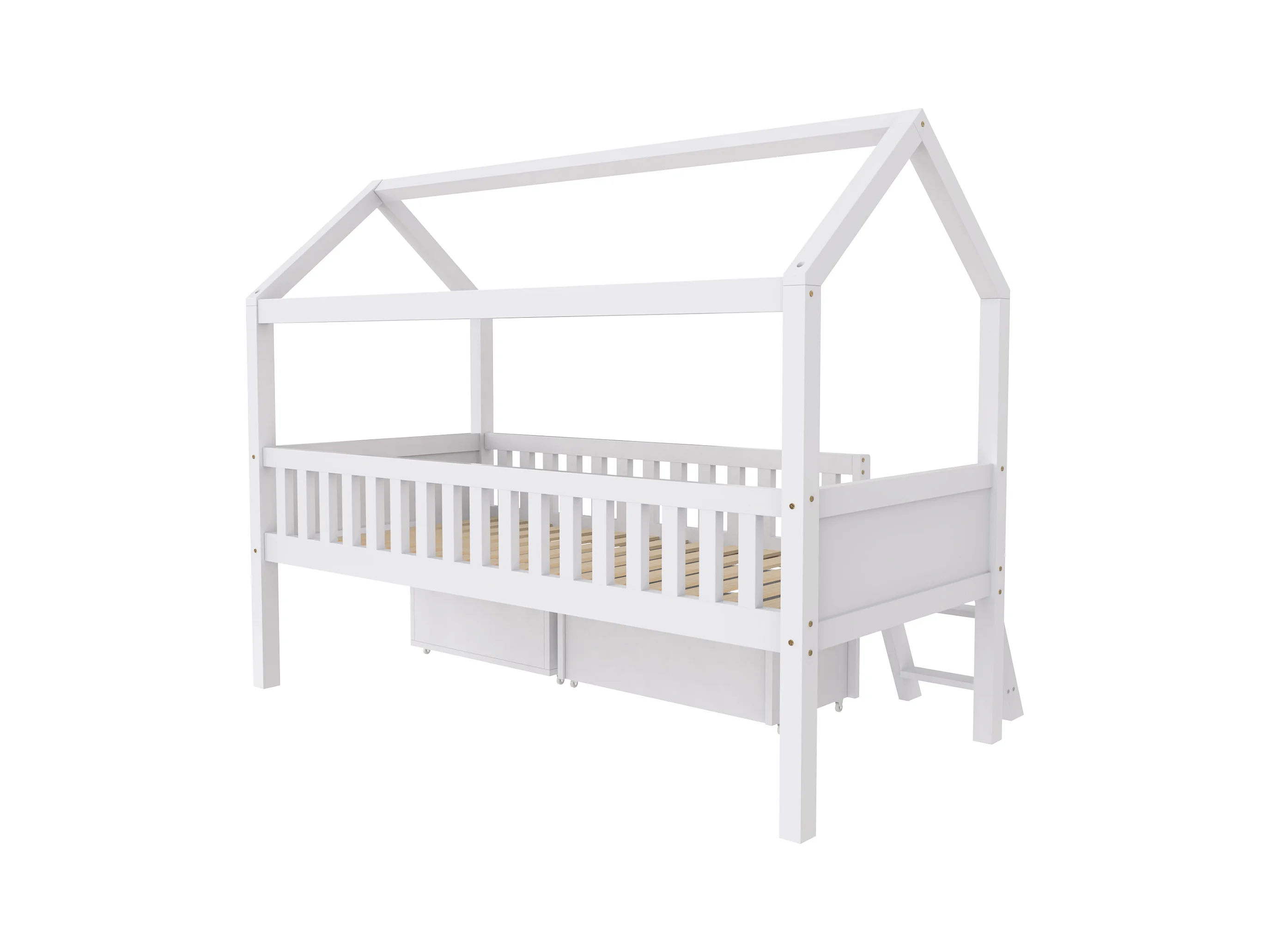 Lit enfant 200x90 cm, avec tiroirs et 2 espaces de rangement barrière de protection, lit cabane, sans matelas, bois, blanc