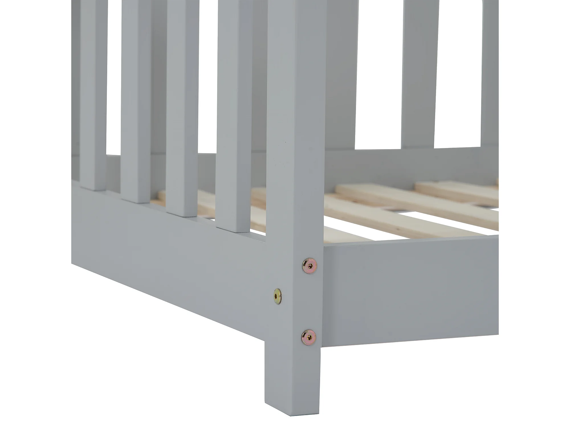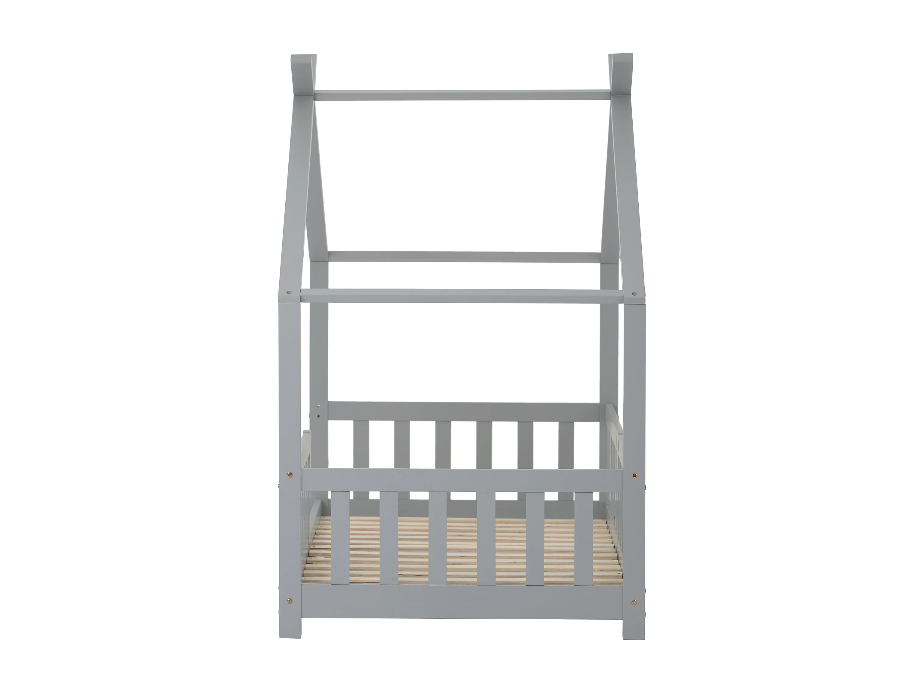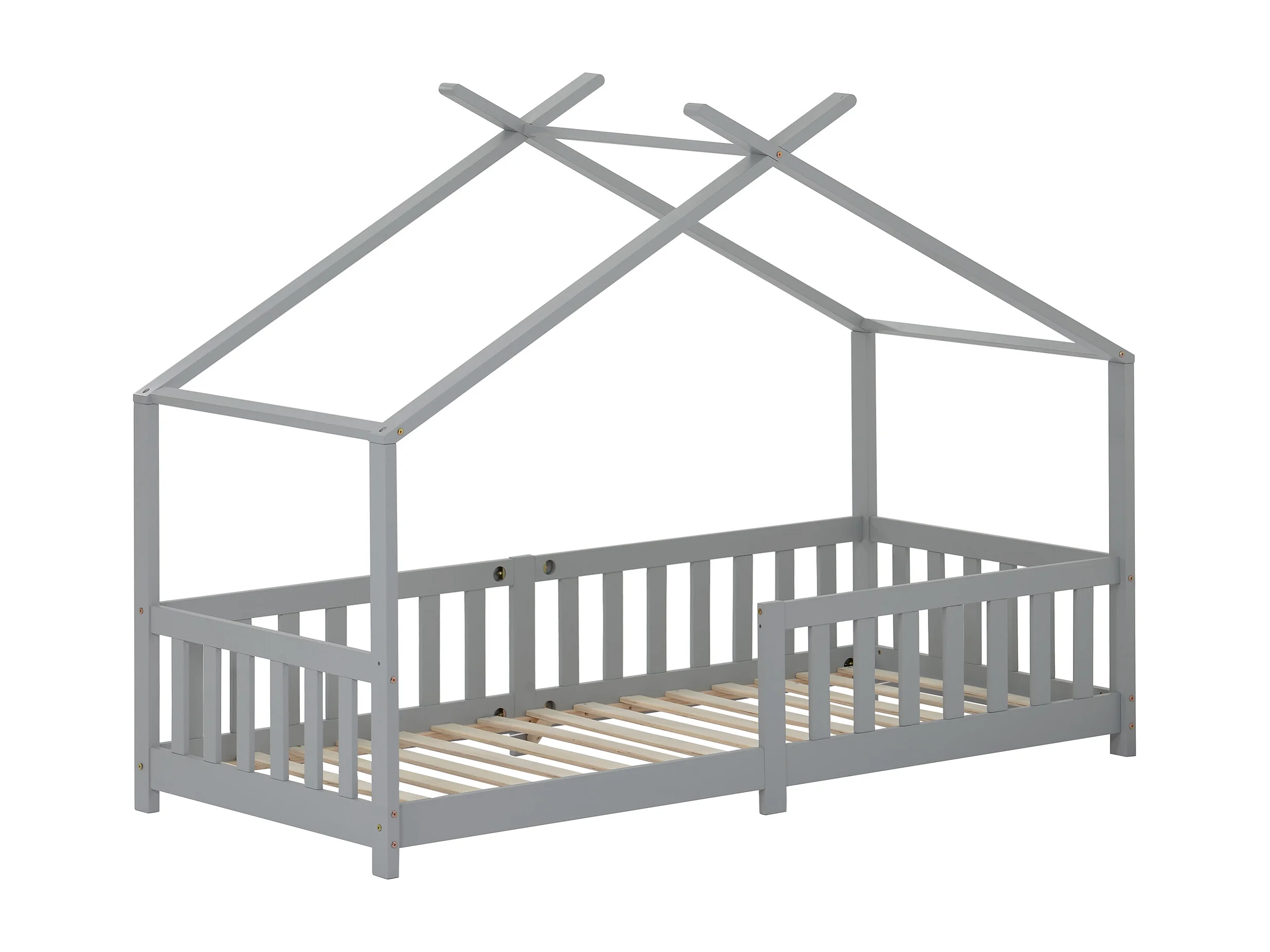Lit cabane enfant 90x200 cm gris, clôture et sommier à lattes, protection antichute, sans matelas