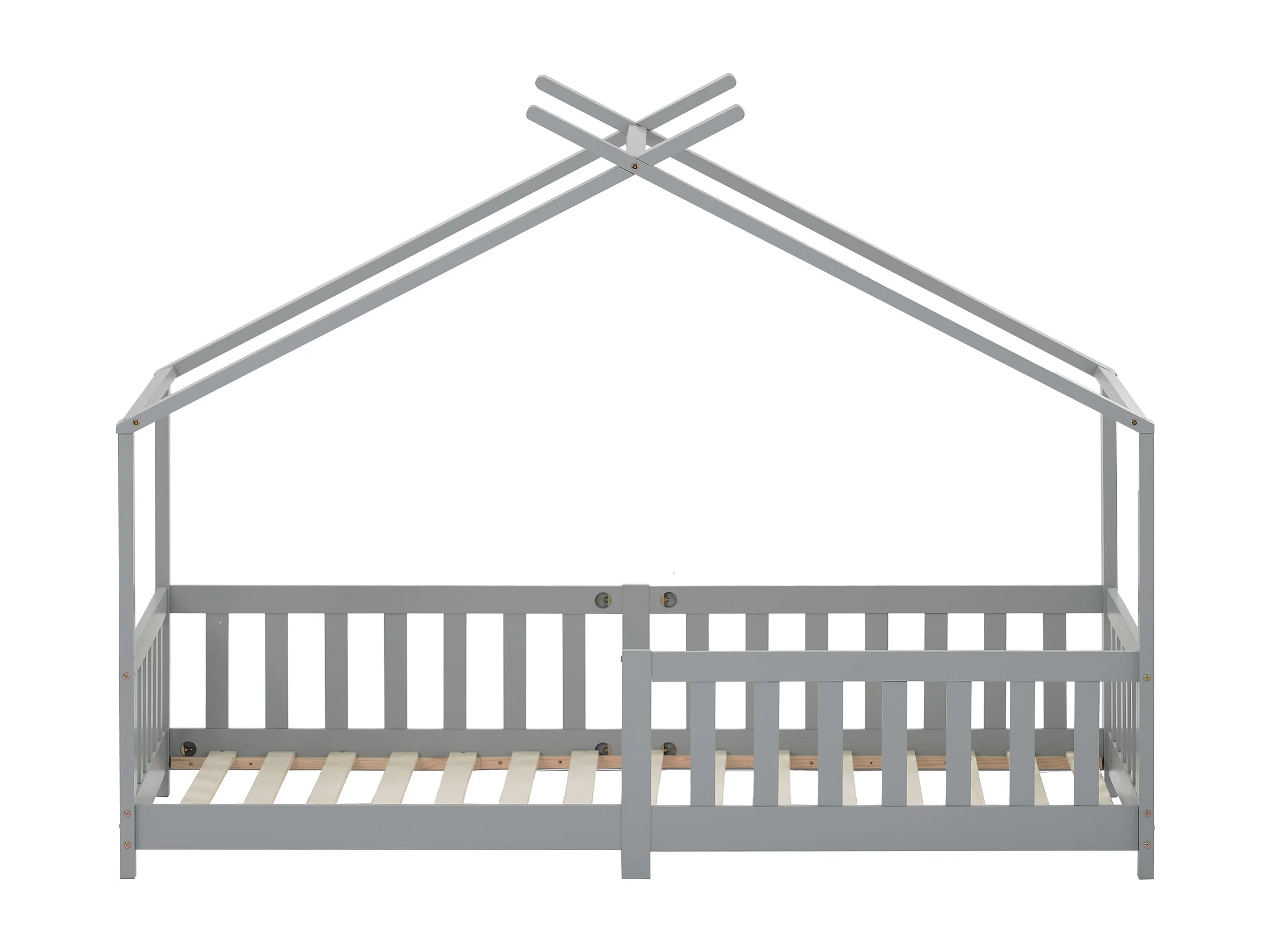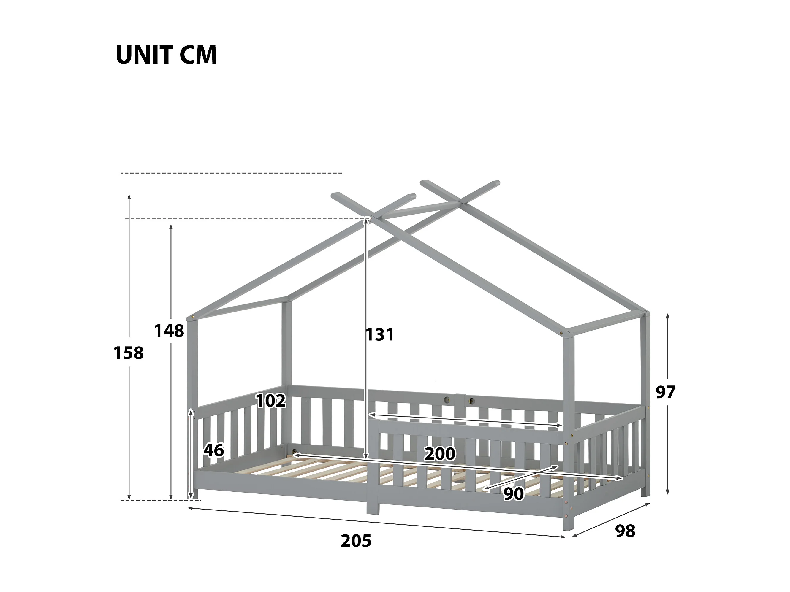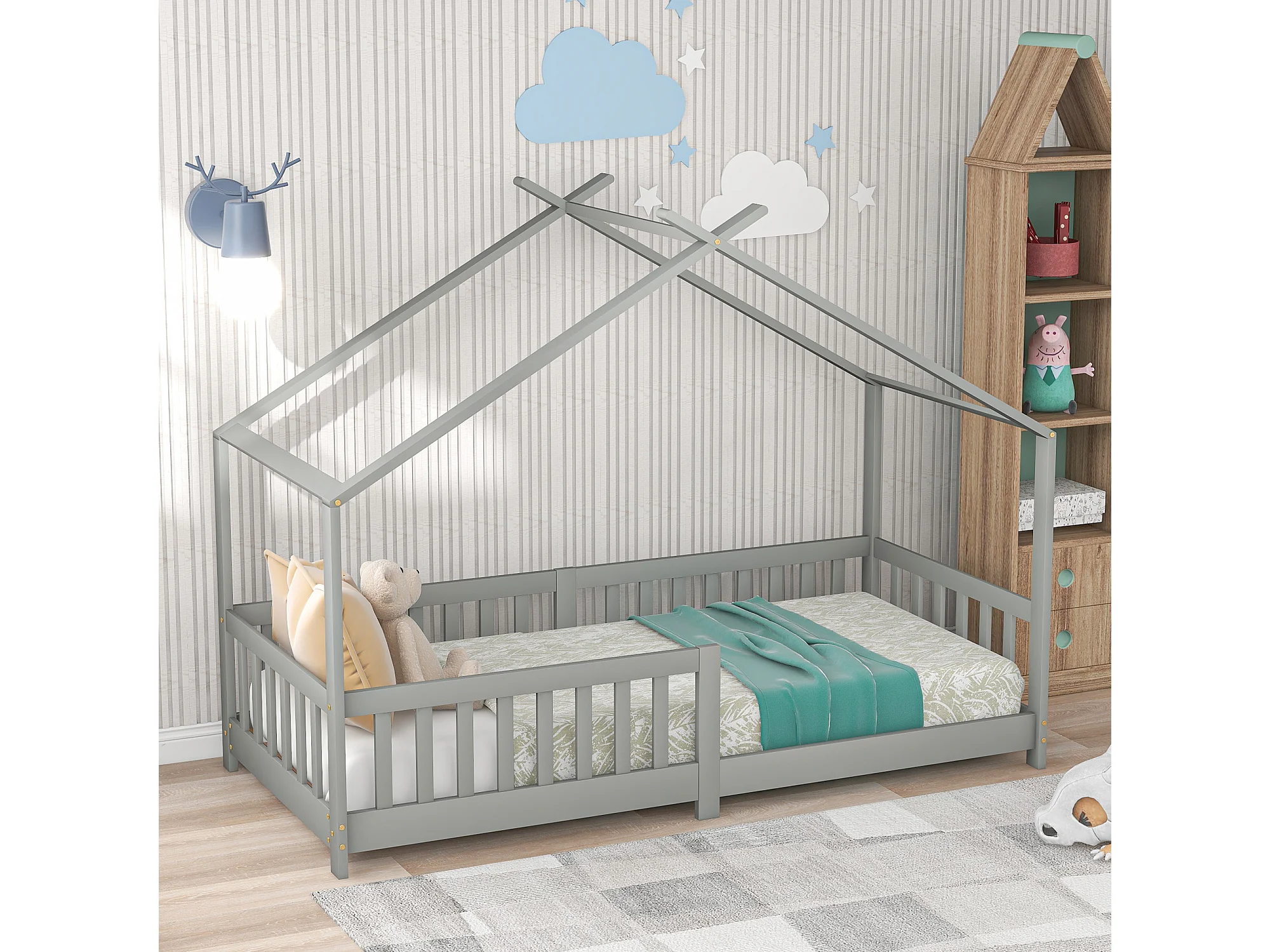 Lit cabane enfant 90x200 cm gris, clôture et sommier à lattes, protection antichute, sans matelas