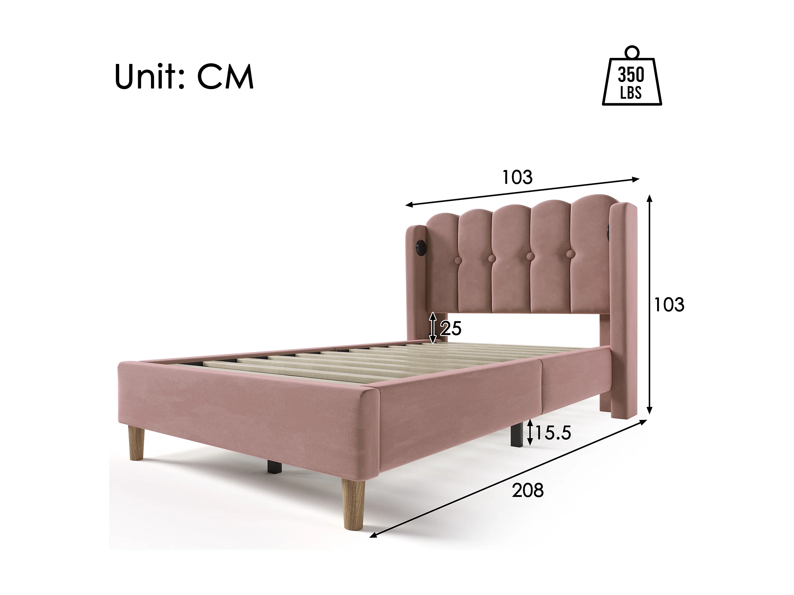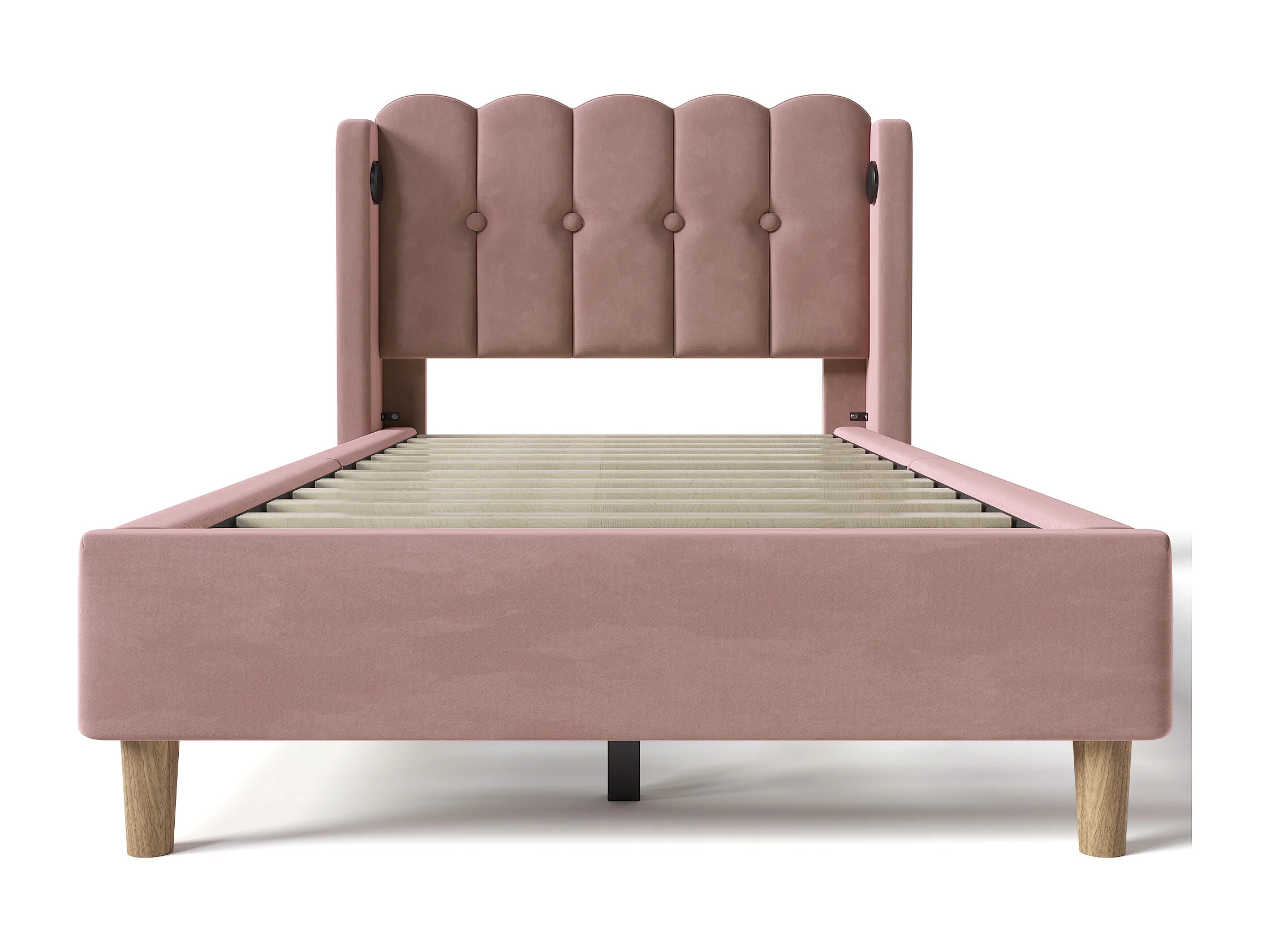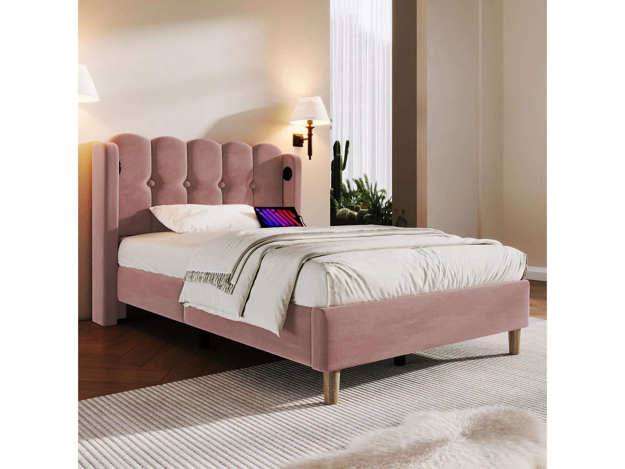 Lit 90x200 avec station de charge USB et USB Type C, avec sommier, velours, rose (Sans matelas)