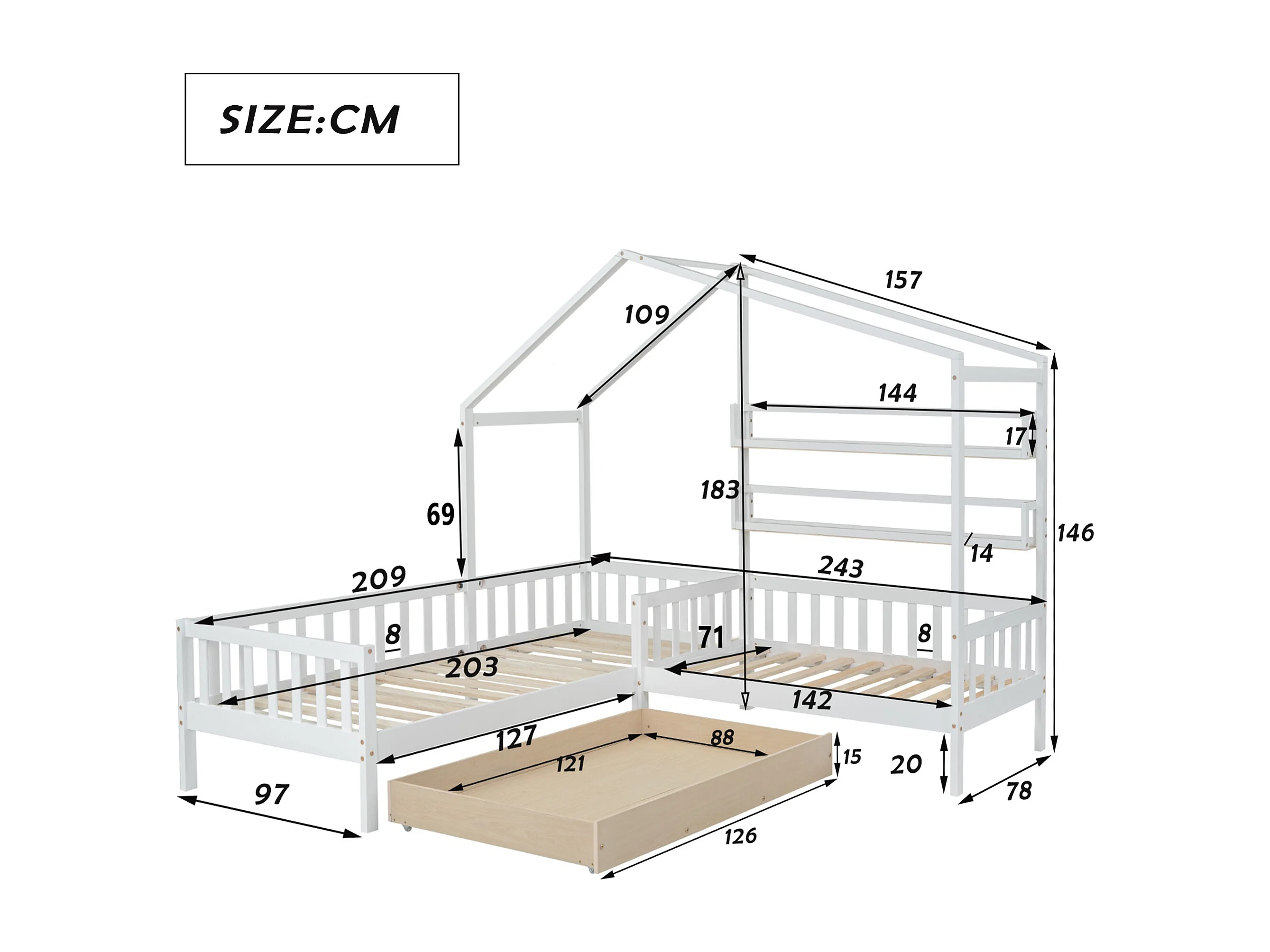 Lit cabane enfant 90x200cm+70x140cm - avec tiroirs, étagères, sommier à lattes, cadre en L, en pin - Blanc