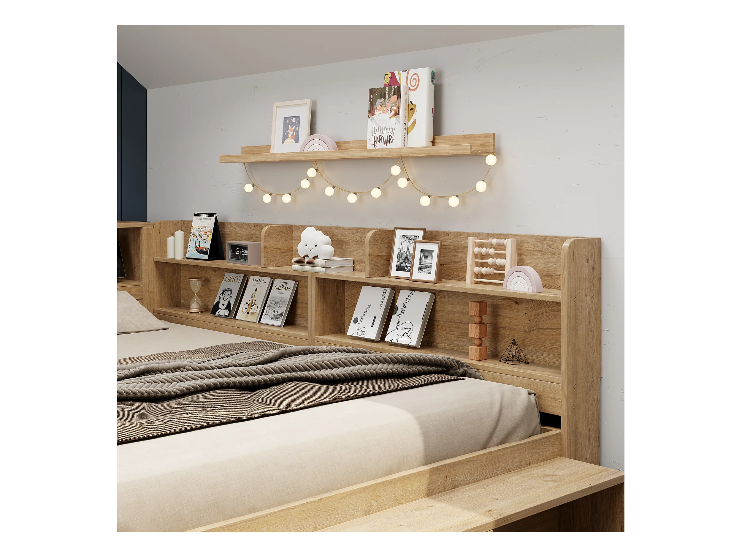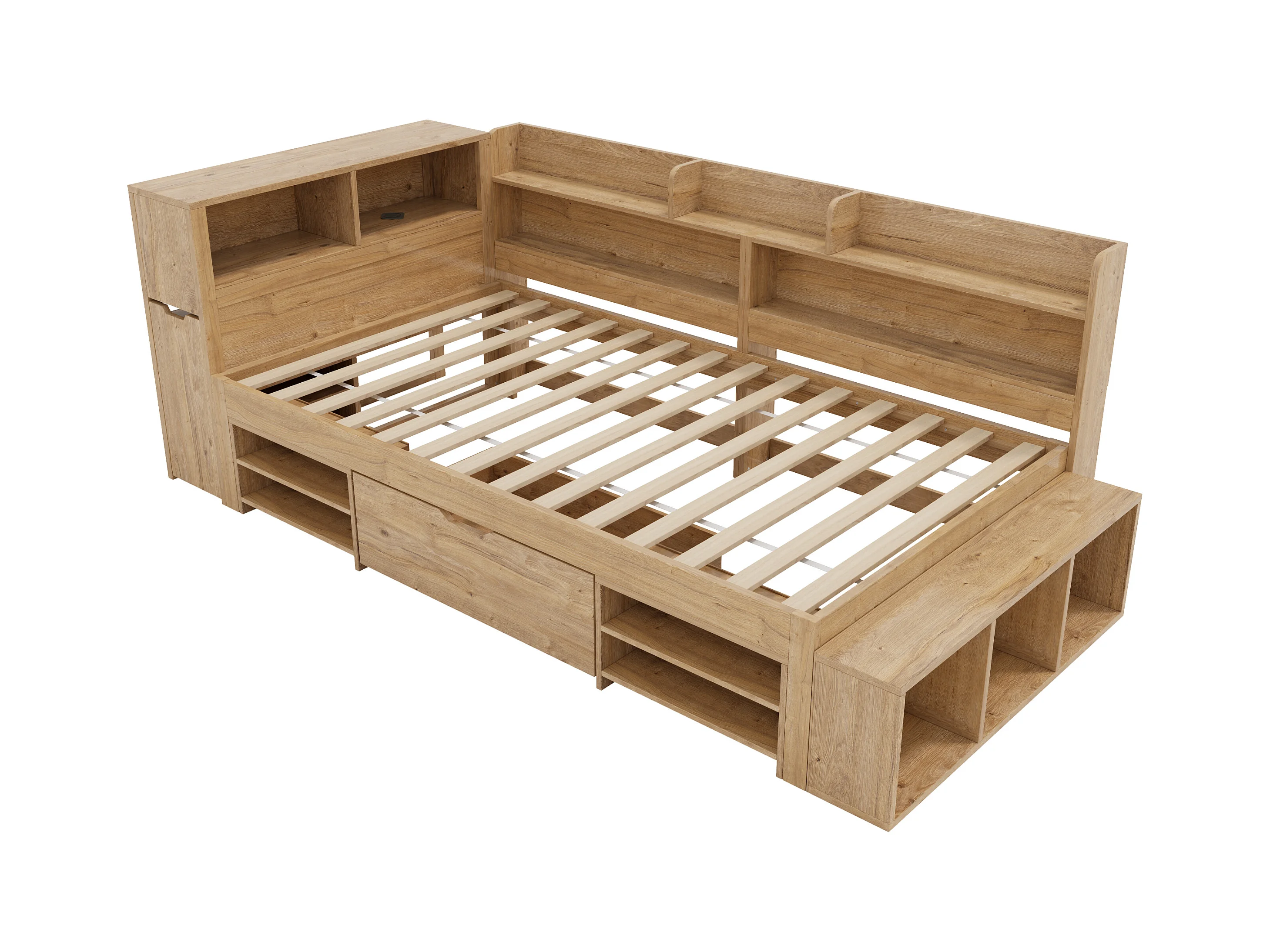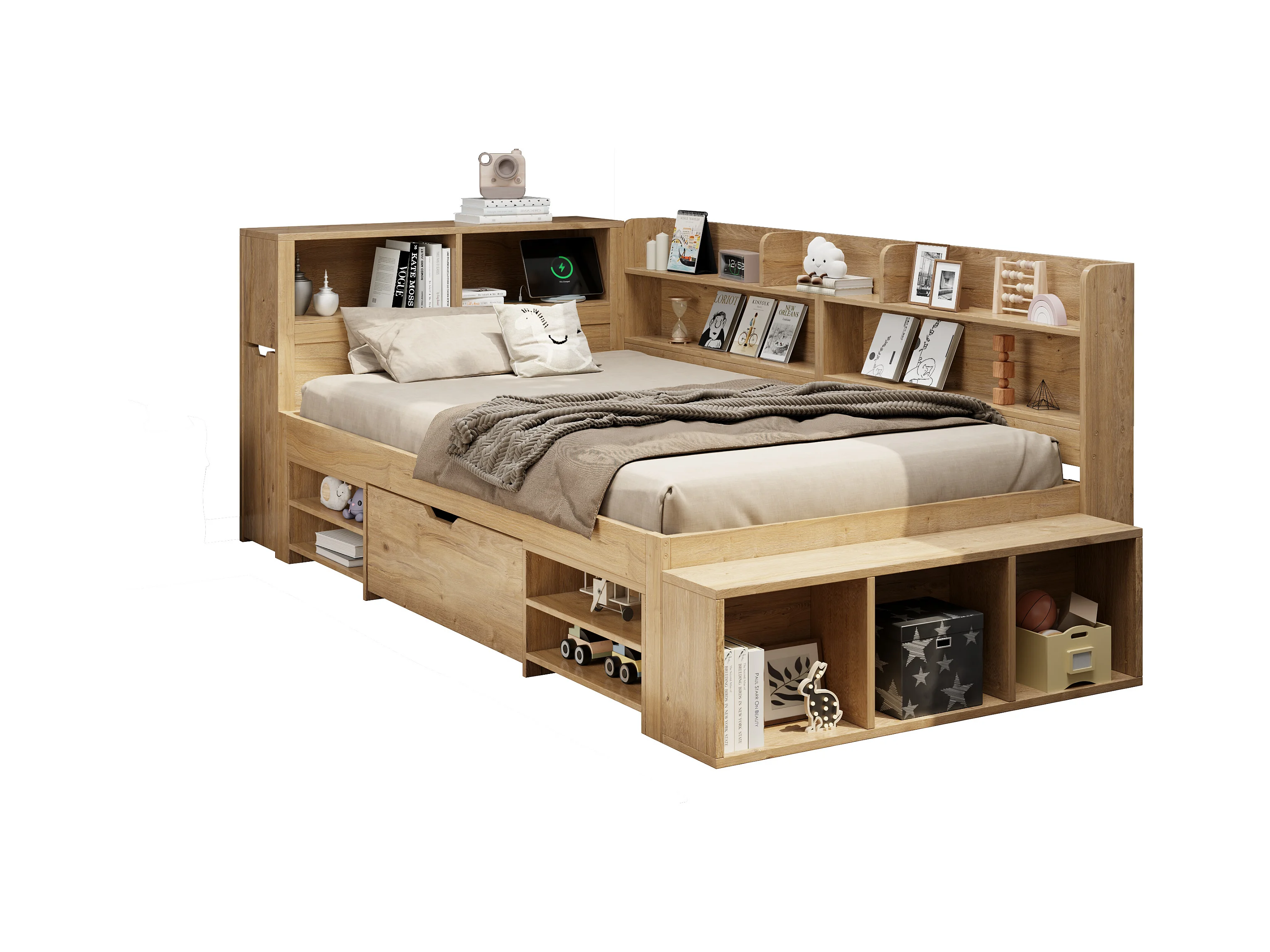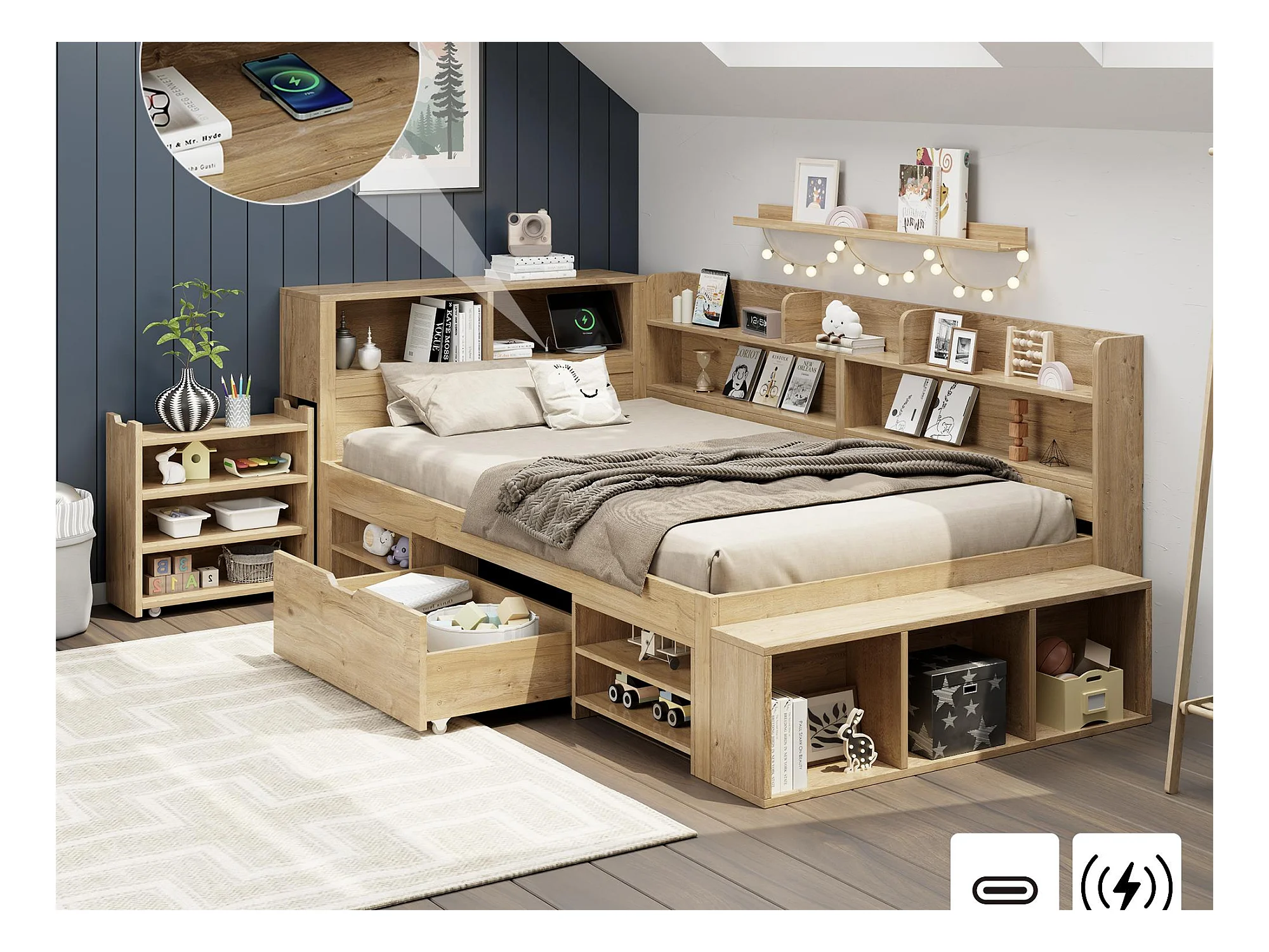 Lit enfant 90x200 cm - avec 1 tiroir - avec bibliothèque et rangement - sommier à lattes - naturel (sans matelas)