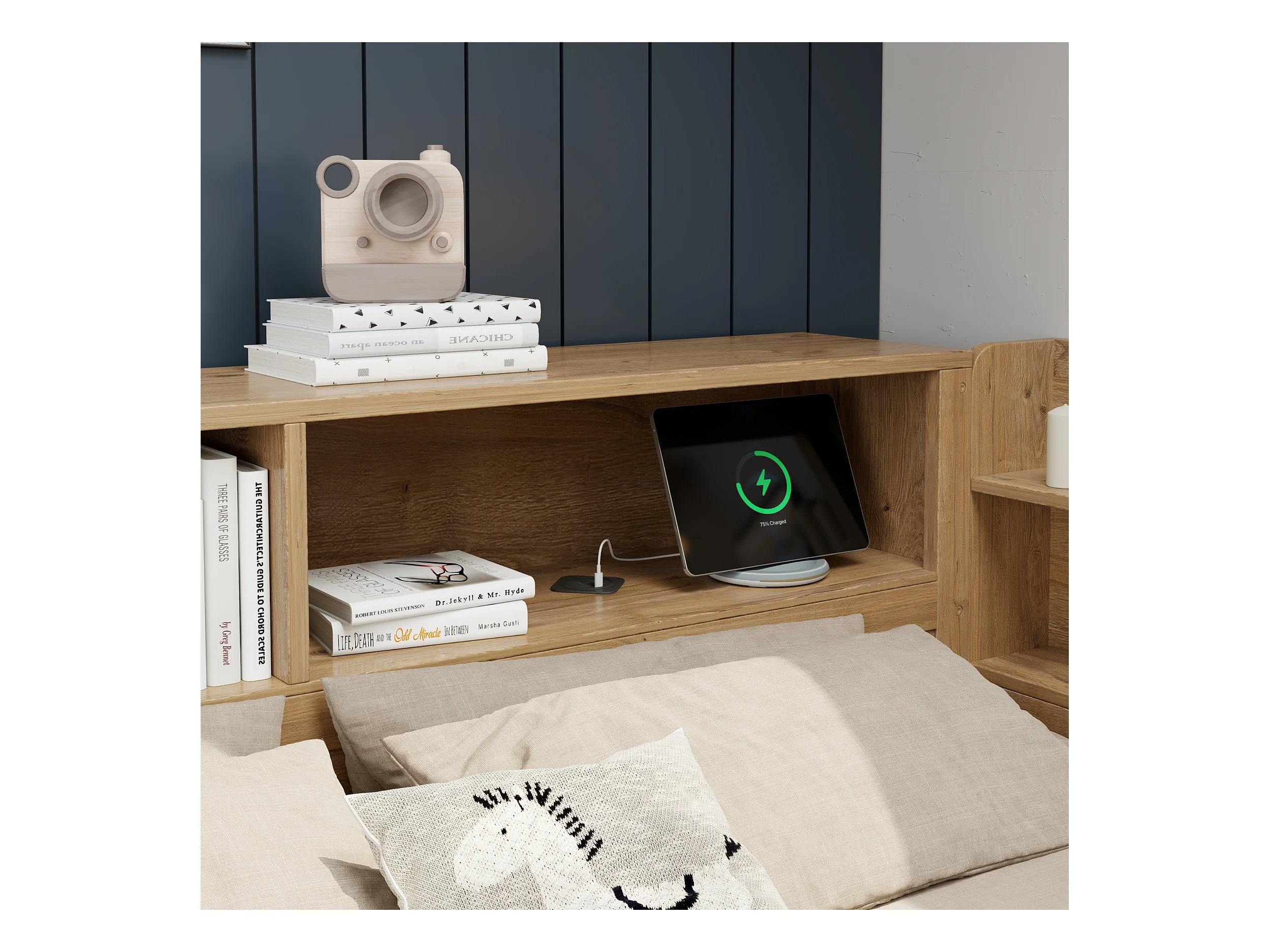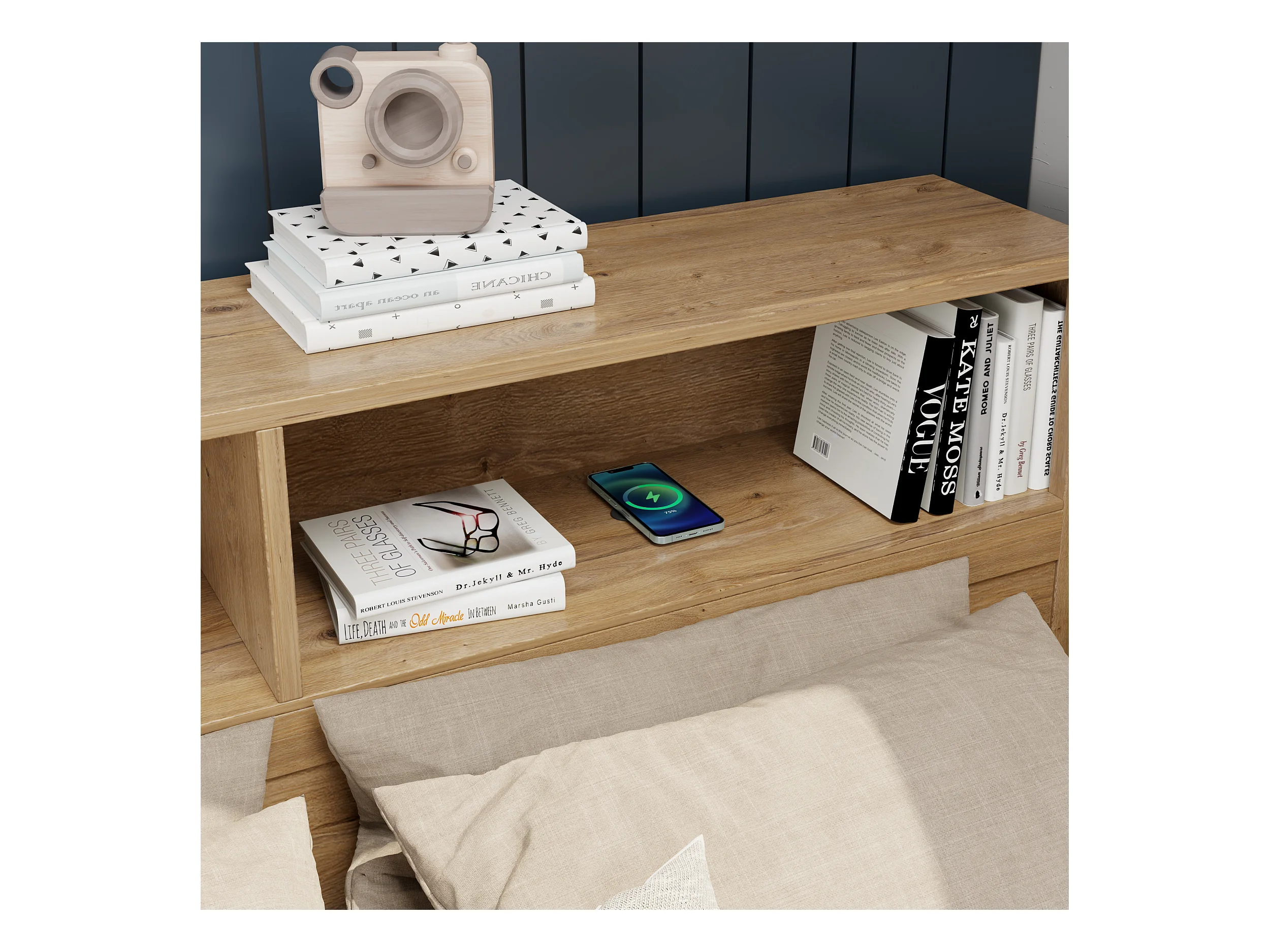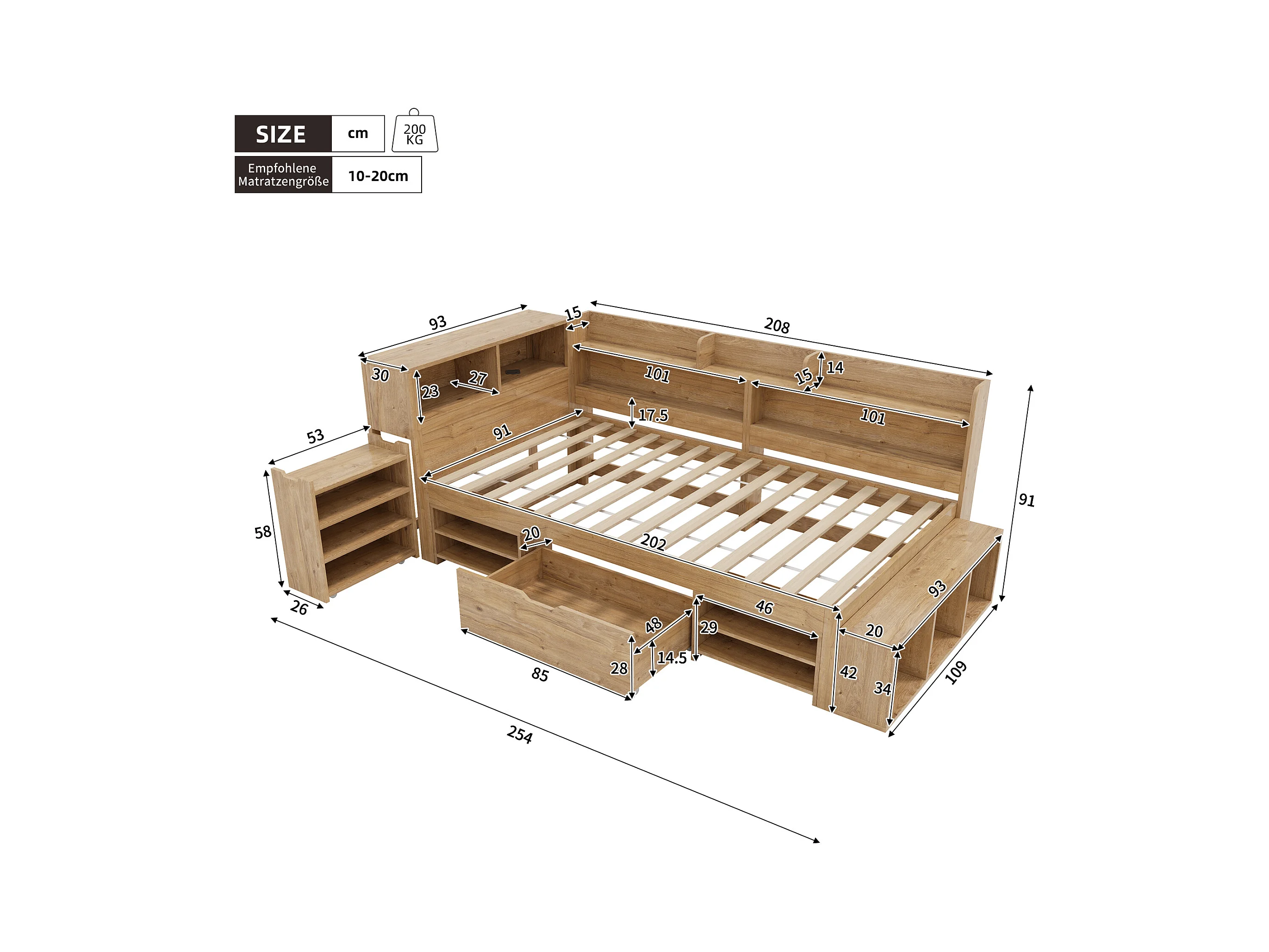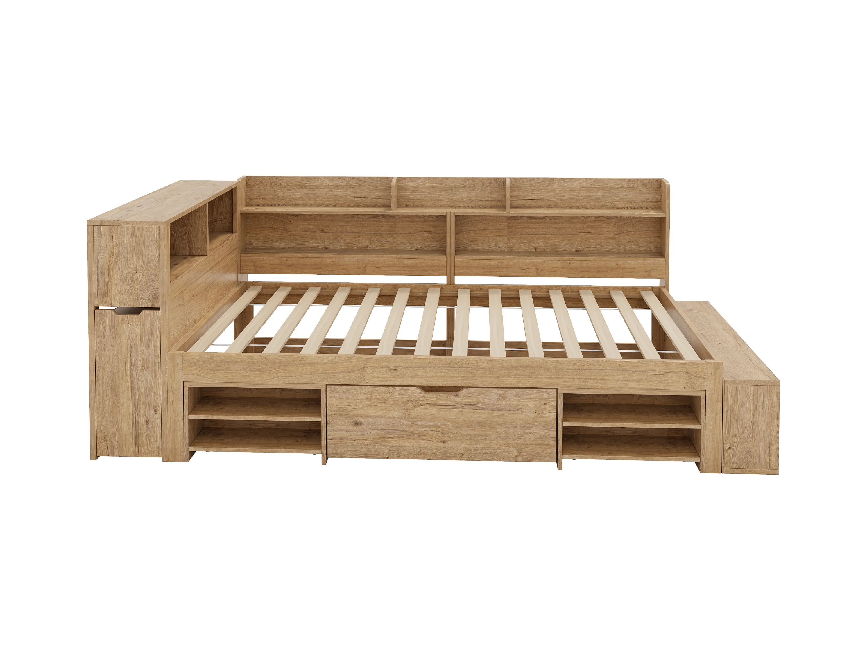 Lit enfant 90x200 cm - avec 1 tiroir - avec bibliothèque et rangement - sommier à lattes - naturel (sans matelas)