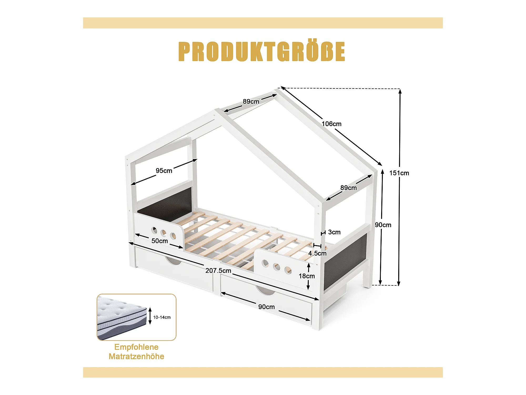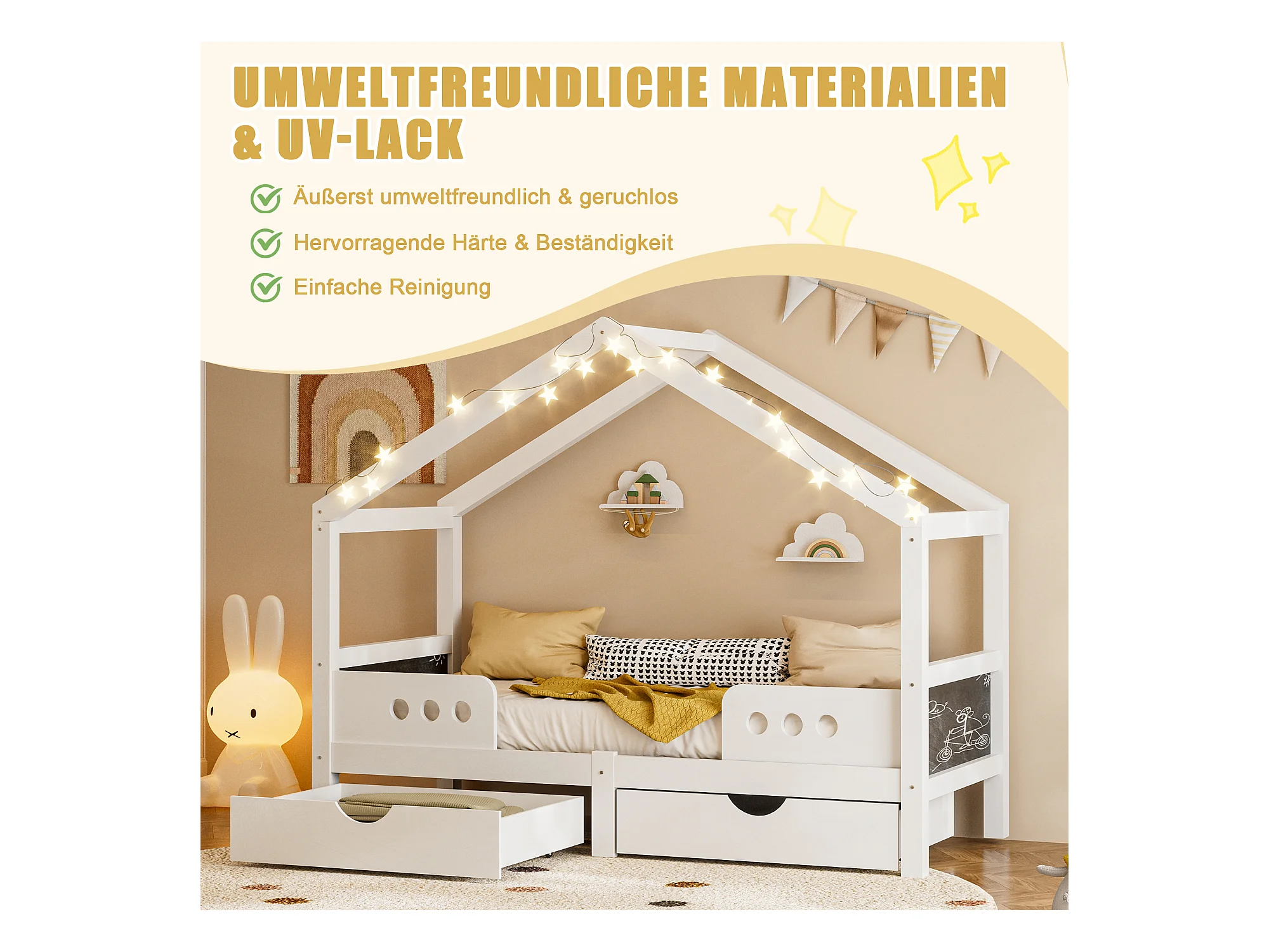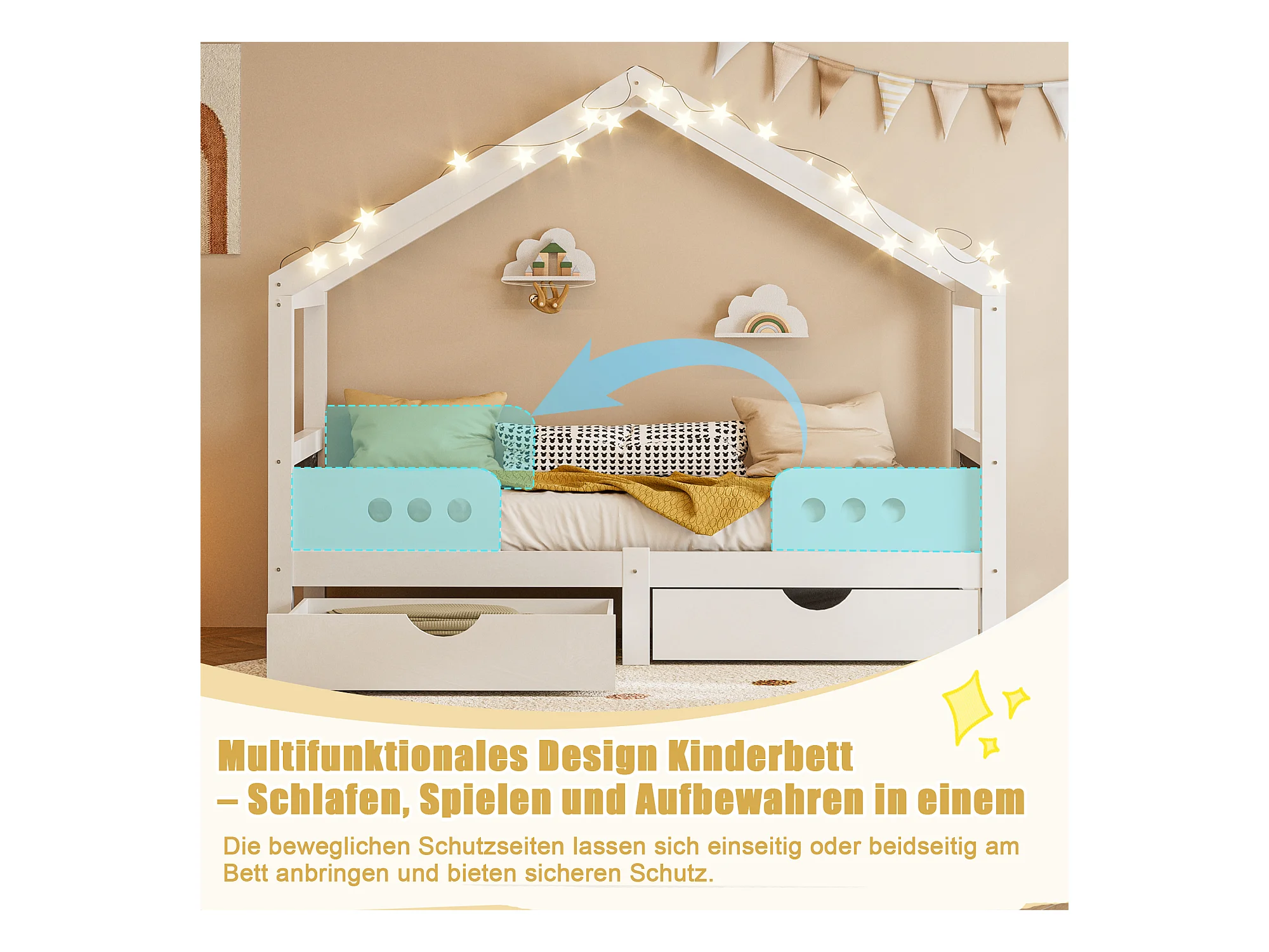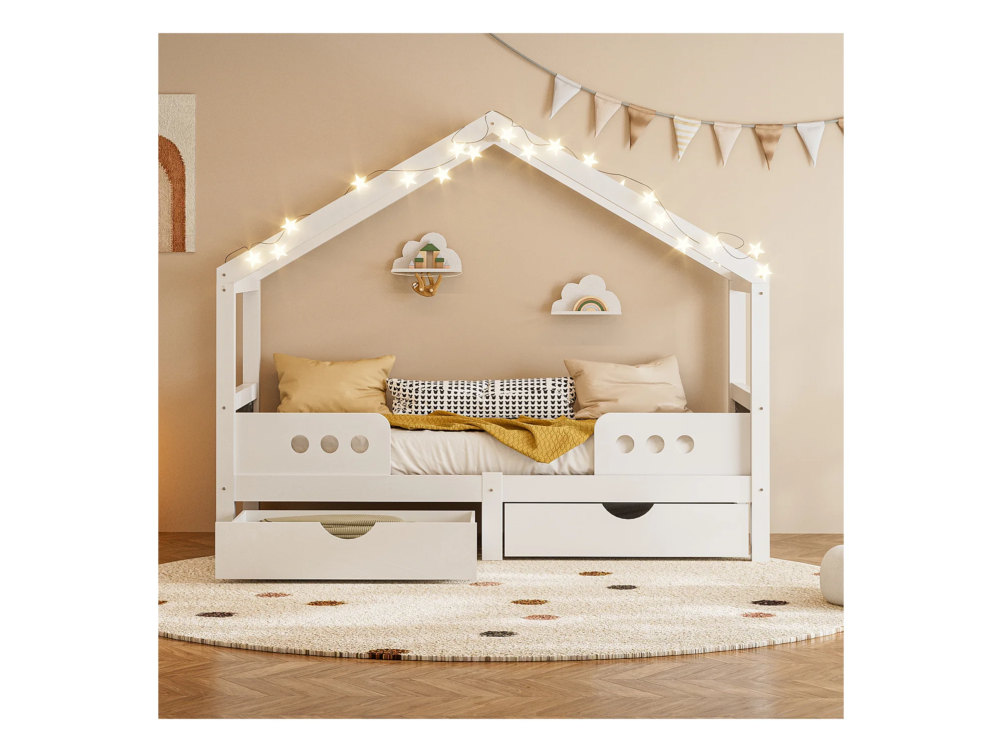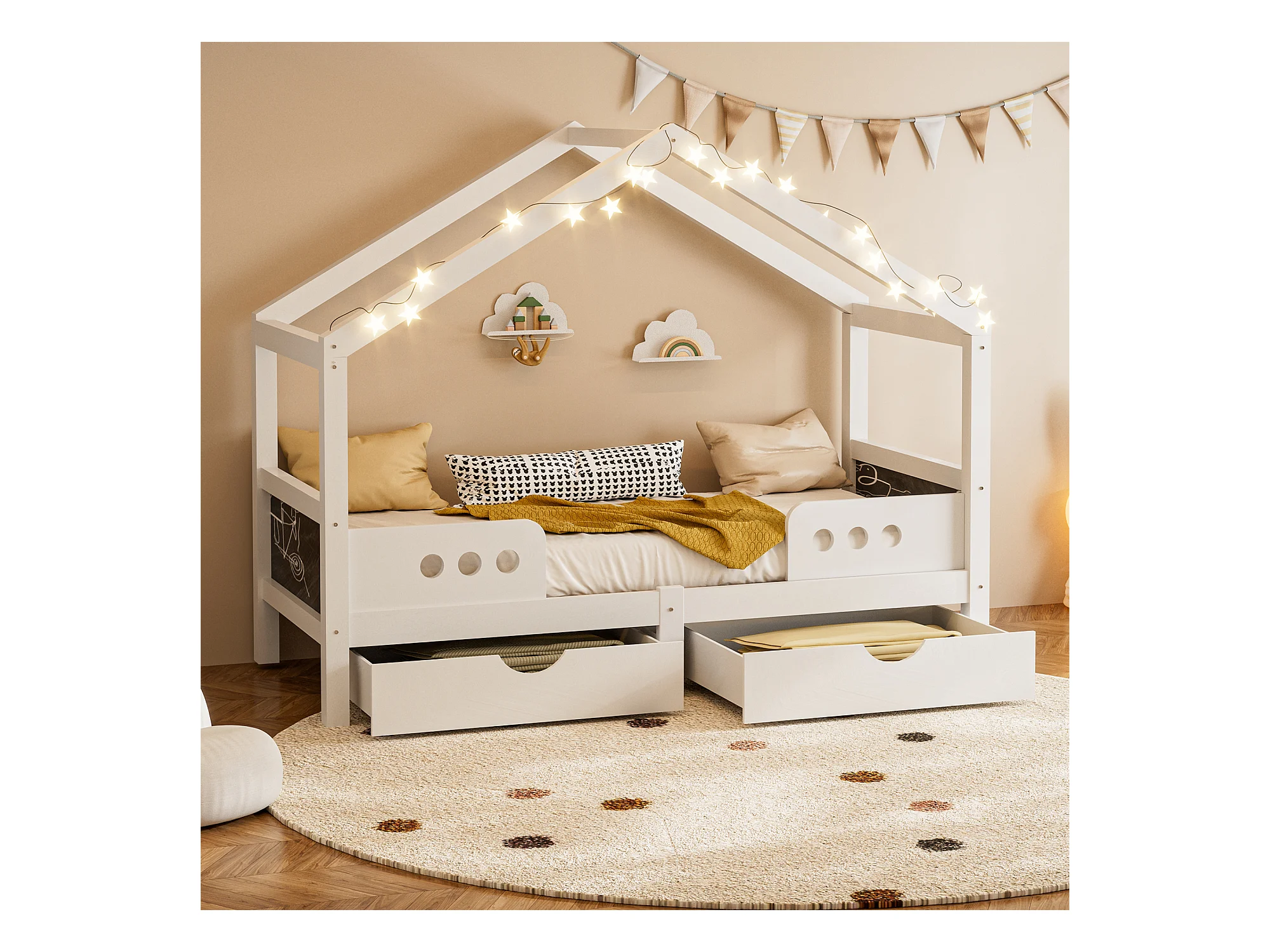 Lit enfant 90x200 cm avec design toit, 2 grands tiroirs, cadre bois + MDF, peinture UV sans odeur, charge jusqu’à 120 kg, solide et pratique