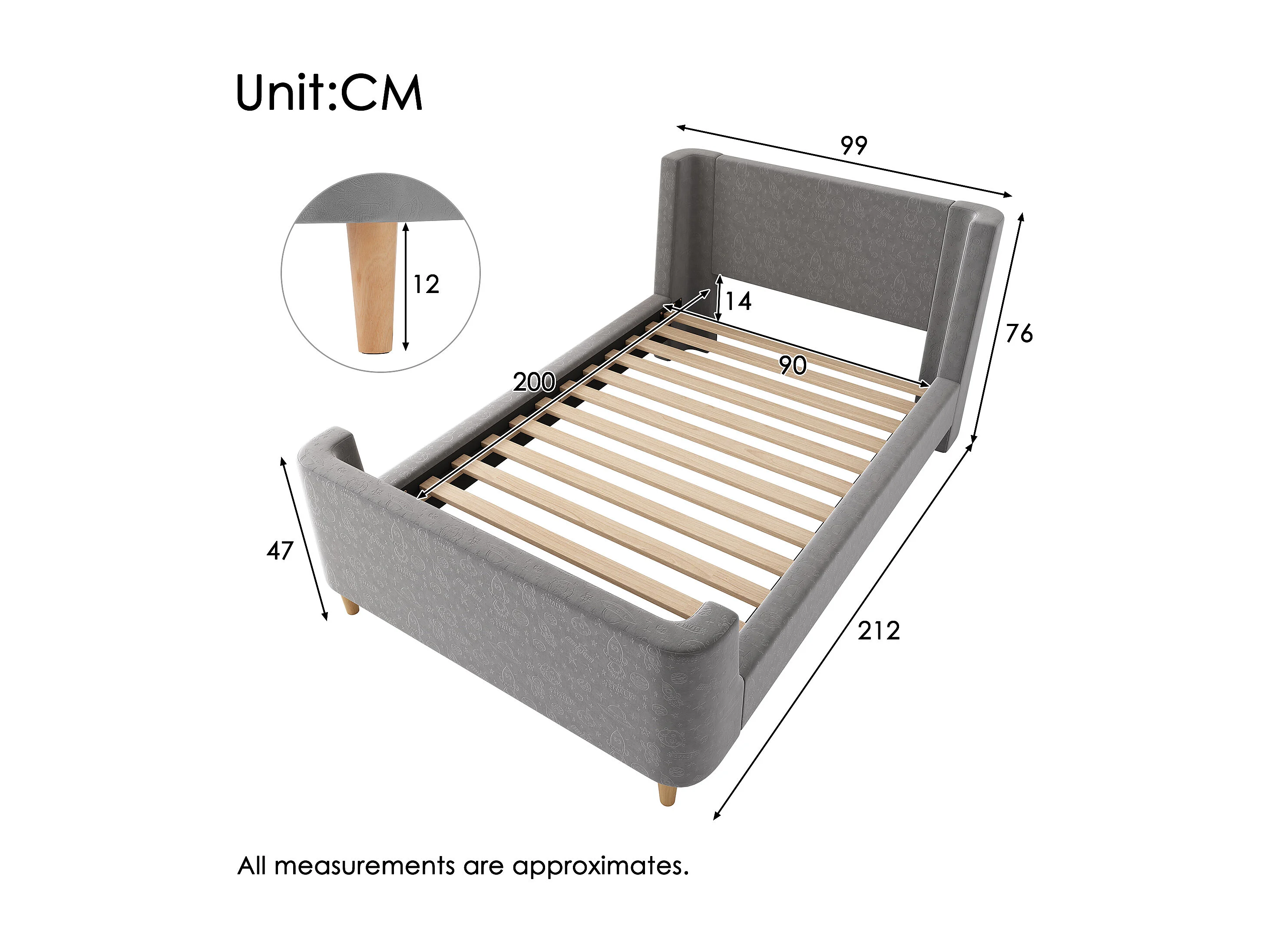 Lit enfant 90x200 cm avec sommier à Lattes- cadre de lit en bois - velours - gris (sans matelas)