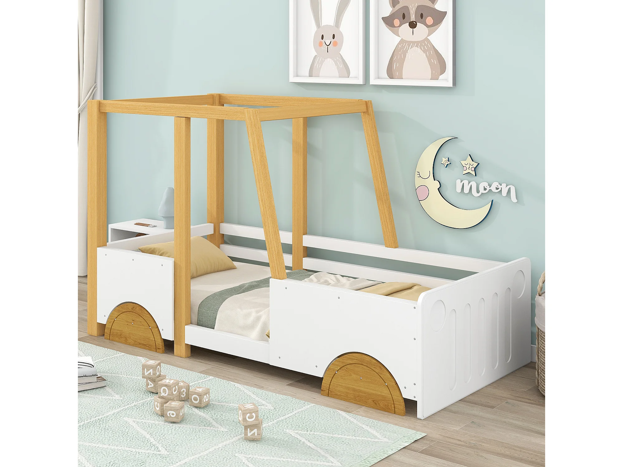 Lit enfant 90x200cm avec Bordures latérales et moulures en forme de voiture en blanc pour enfants et adolescents