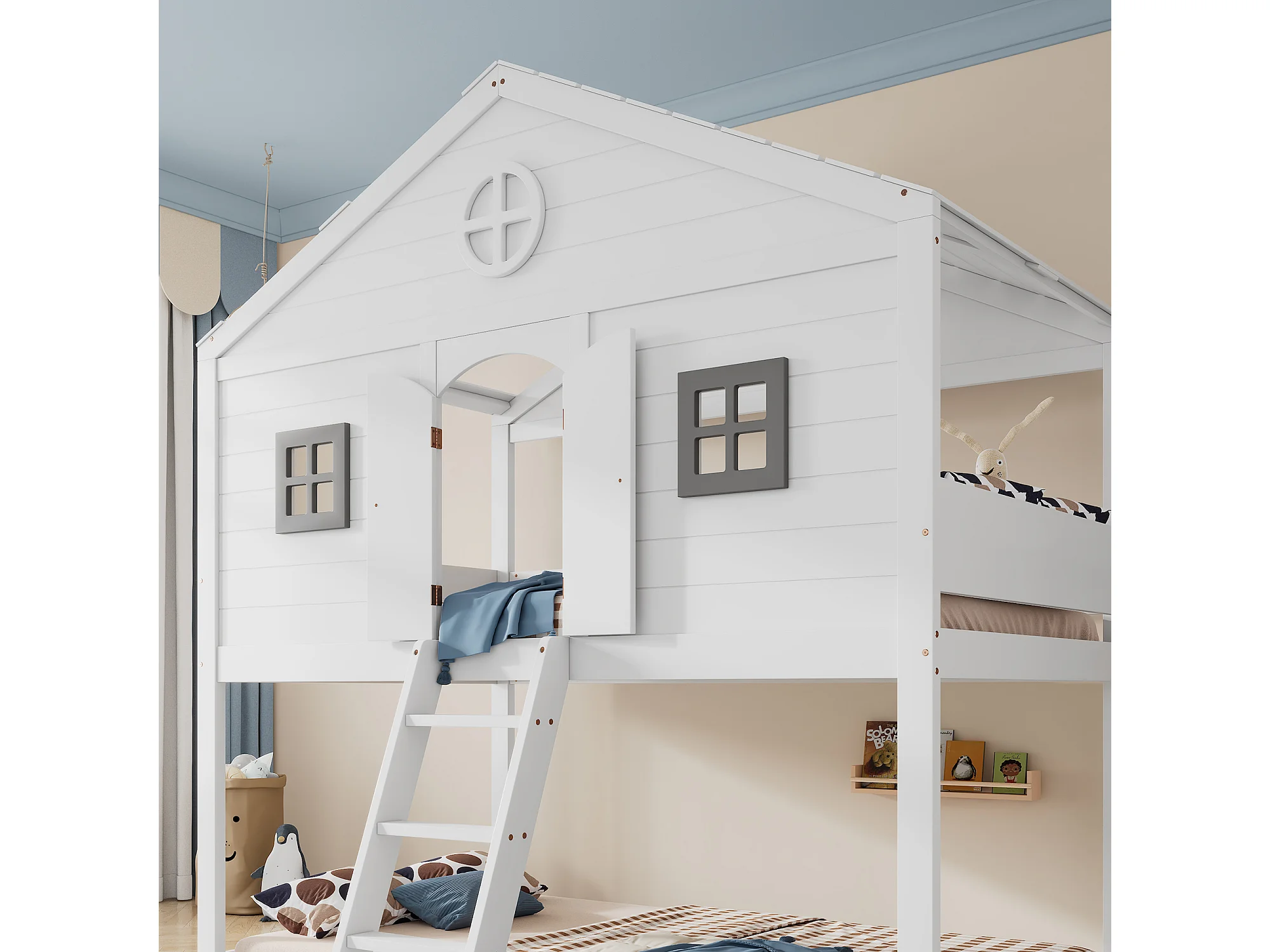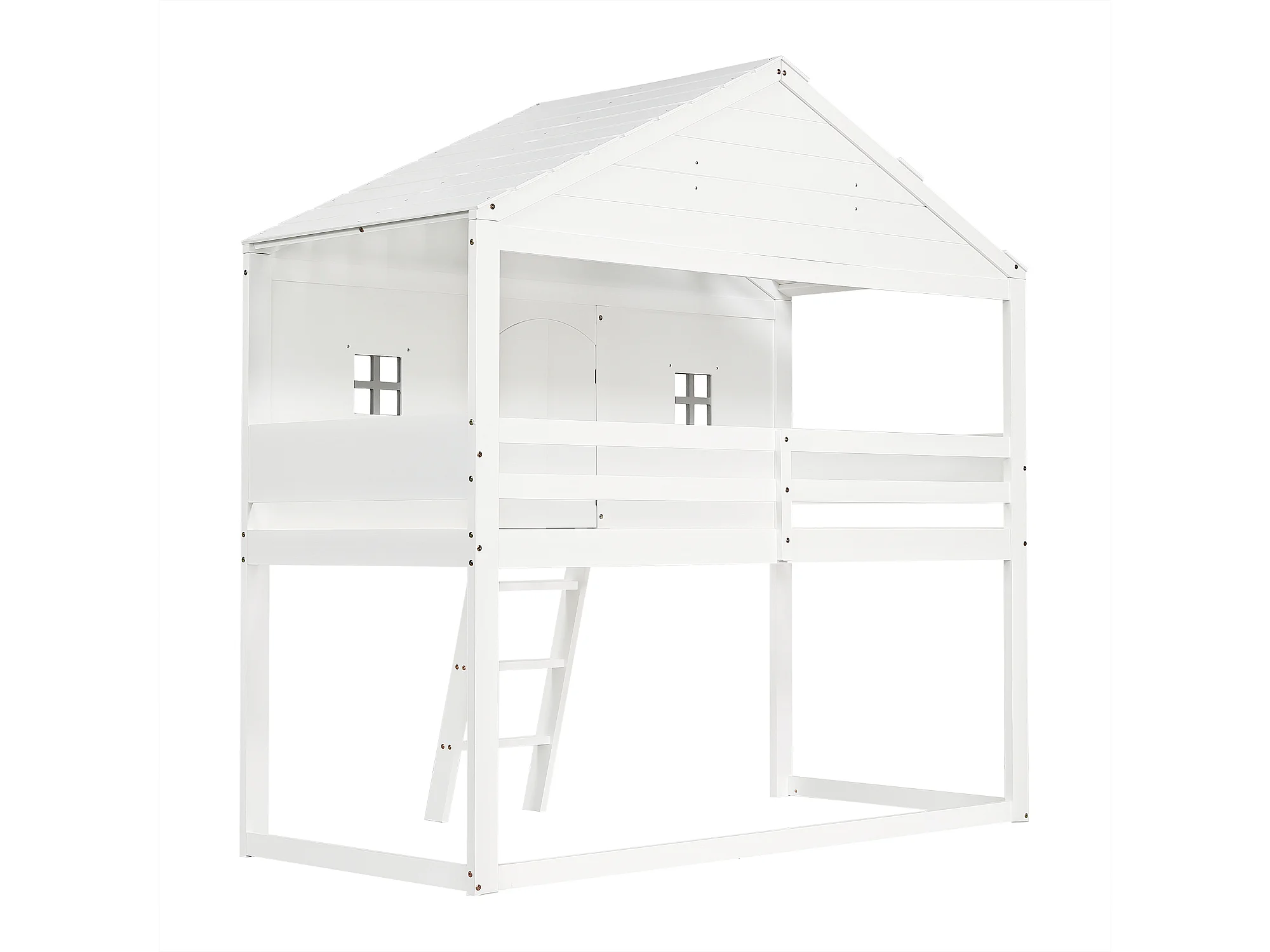 Lit enfant 90x200cm avec échelle et rambarde antichute Design maison en bois en blanc pour enfants et adolescents