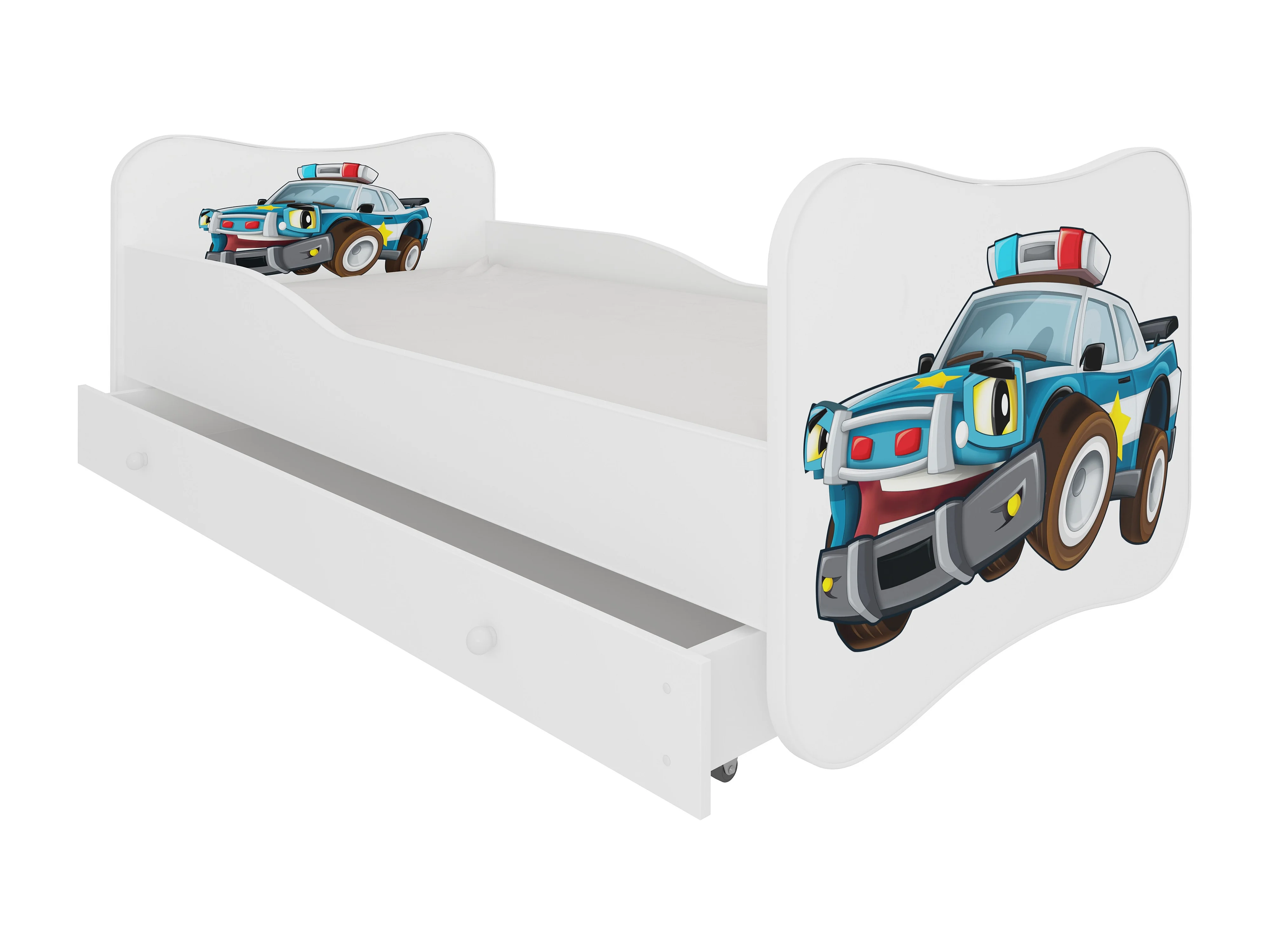 Lit enfant bois blanc à tiroirs avec imprimé voiture de police - Sommier et matelas inclus - Ondula-70x140