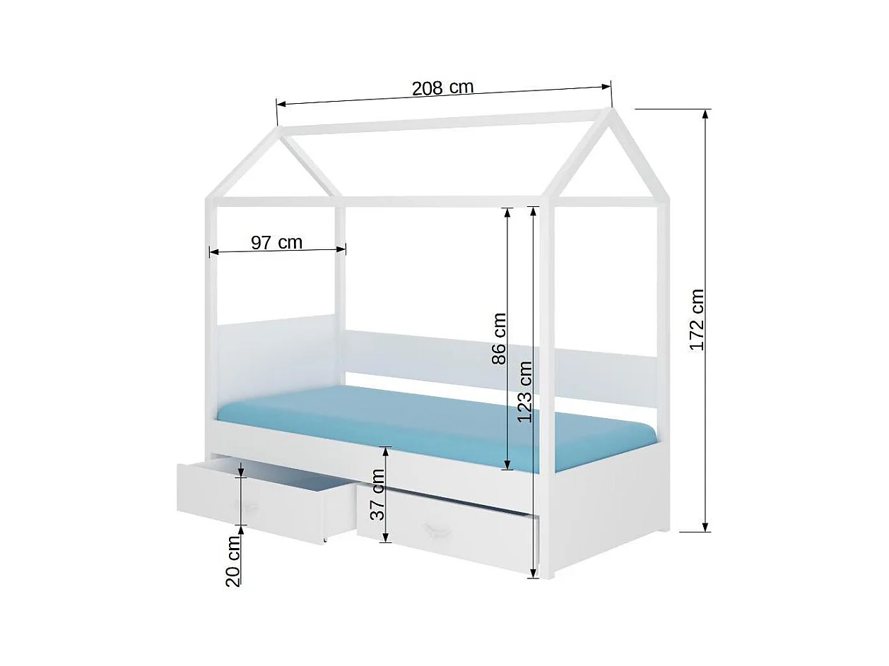 Lit enfant cabane bois pin blanc 90x200 avec 2 tiroirs de rangement Forka
