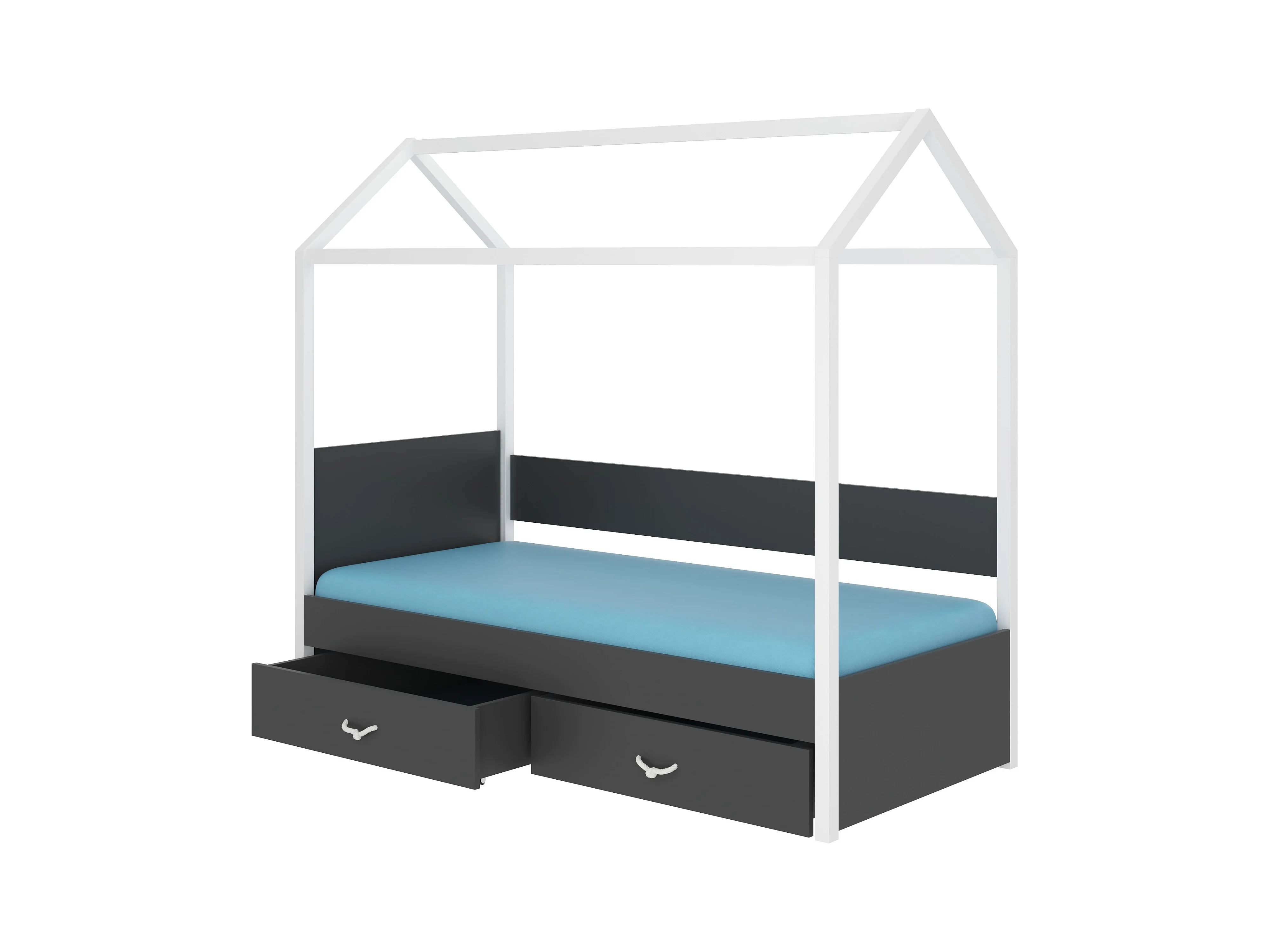 Lit enfant cabane bois pin blanc et gris graphite 90x200 avec 2 tiroirs de rangement Forka