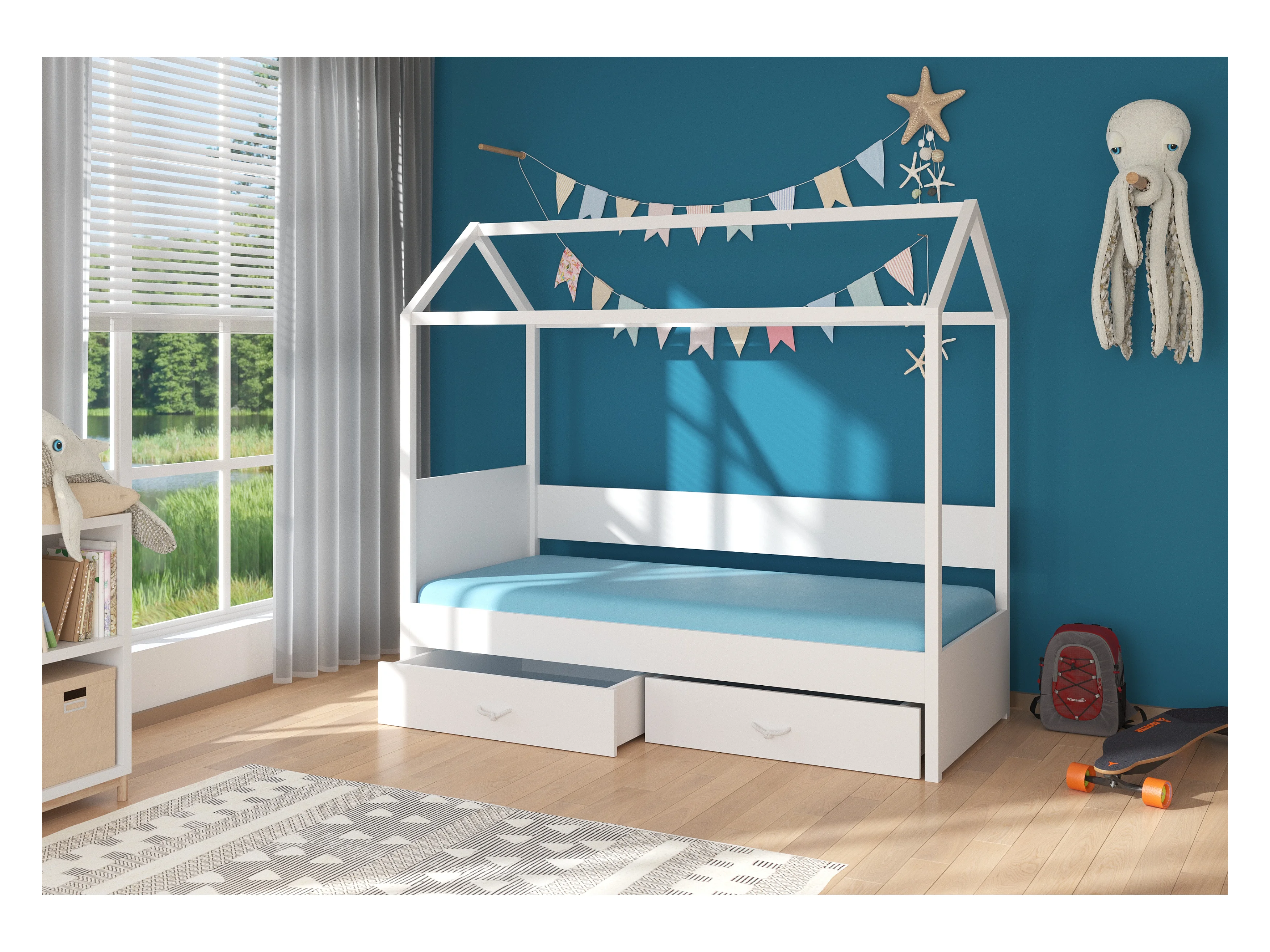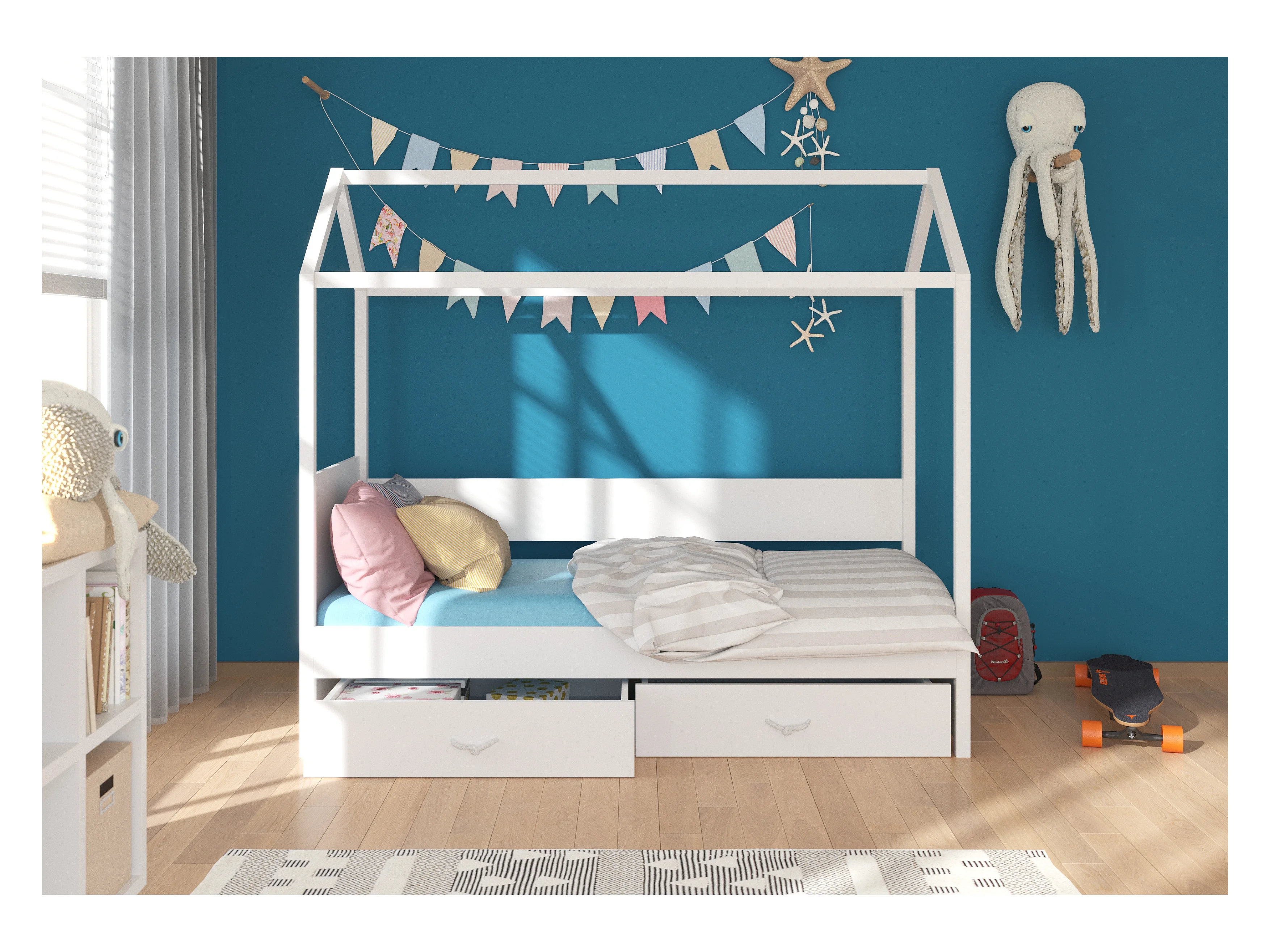 Lit enfant cabane bois pin blanc 90x200 avec 2 tiroirs de rangement Forka