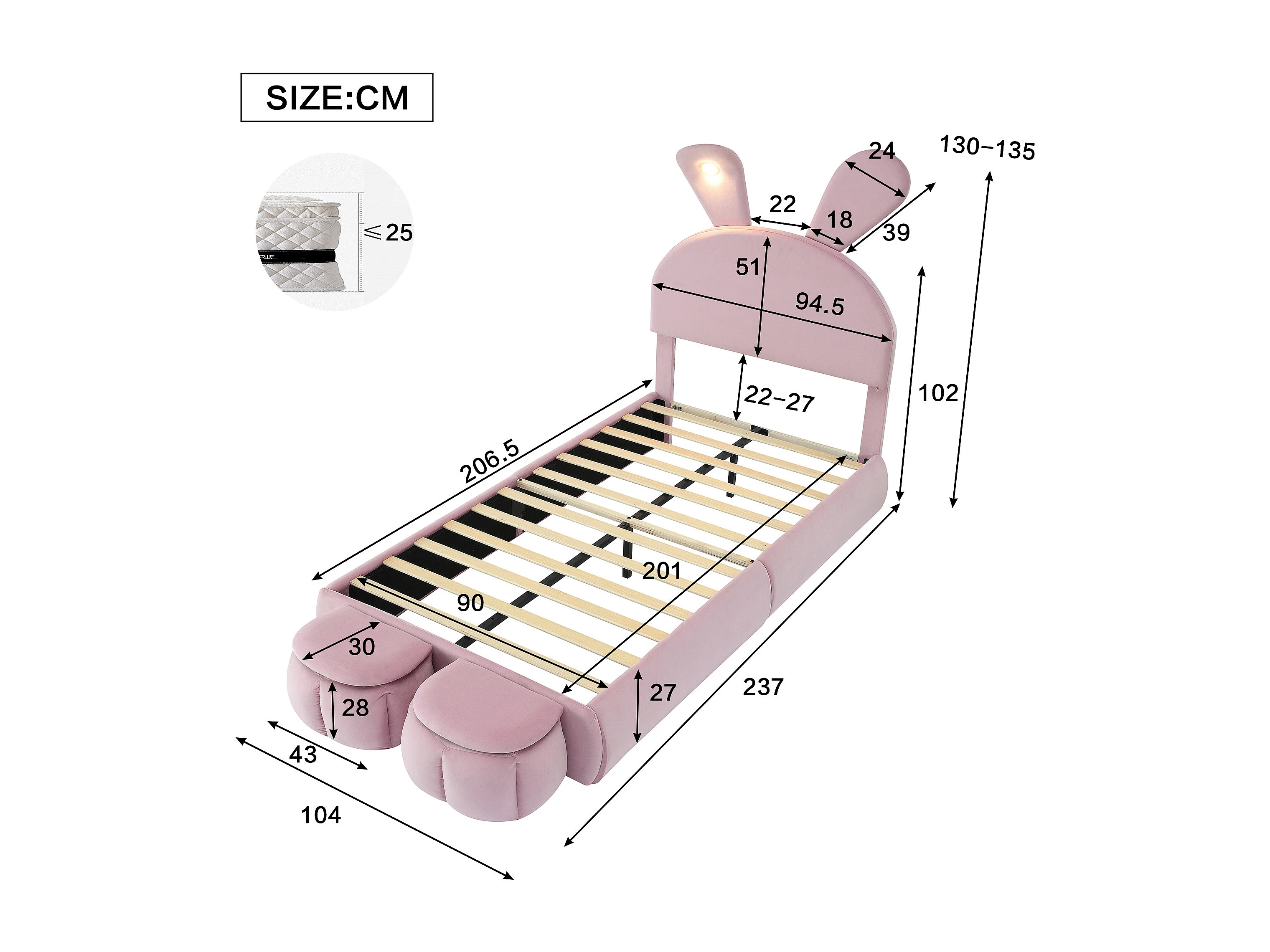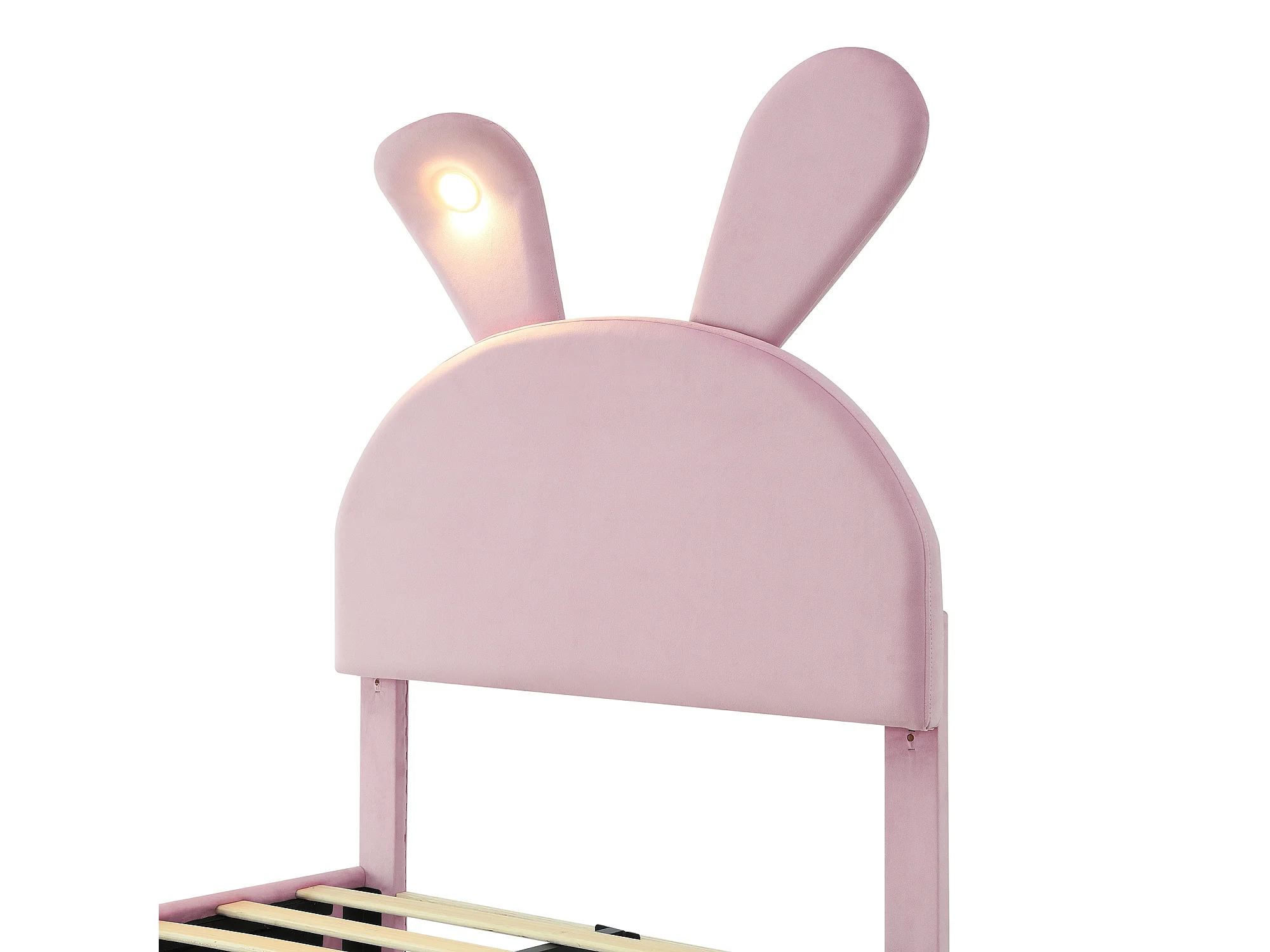 Lit enfant Lit simple Rabbit Ears 90x200 cm avec 2 tabourets de rangement, LED, velours rose, sans matelas
