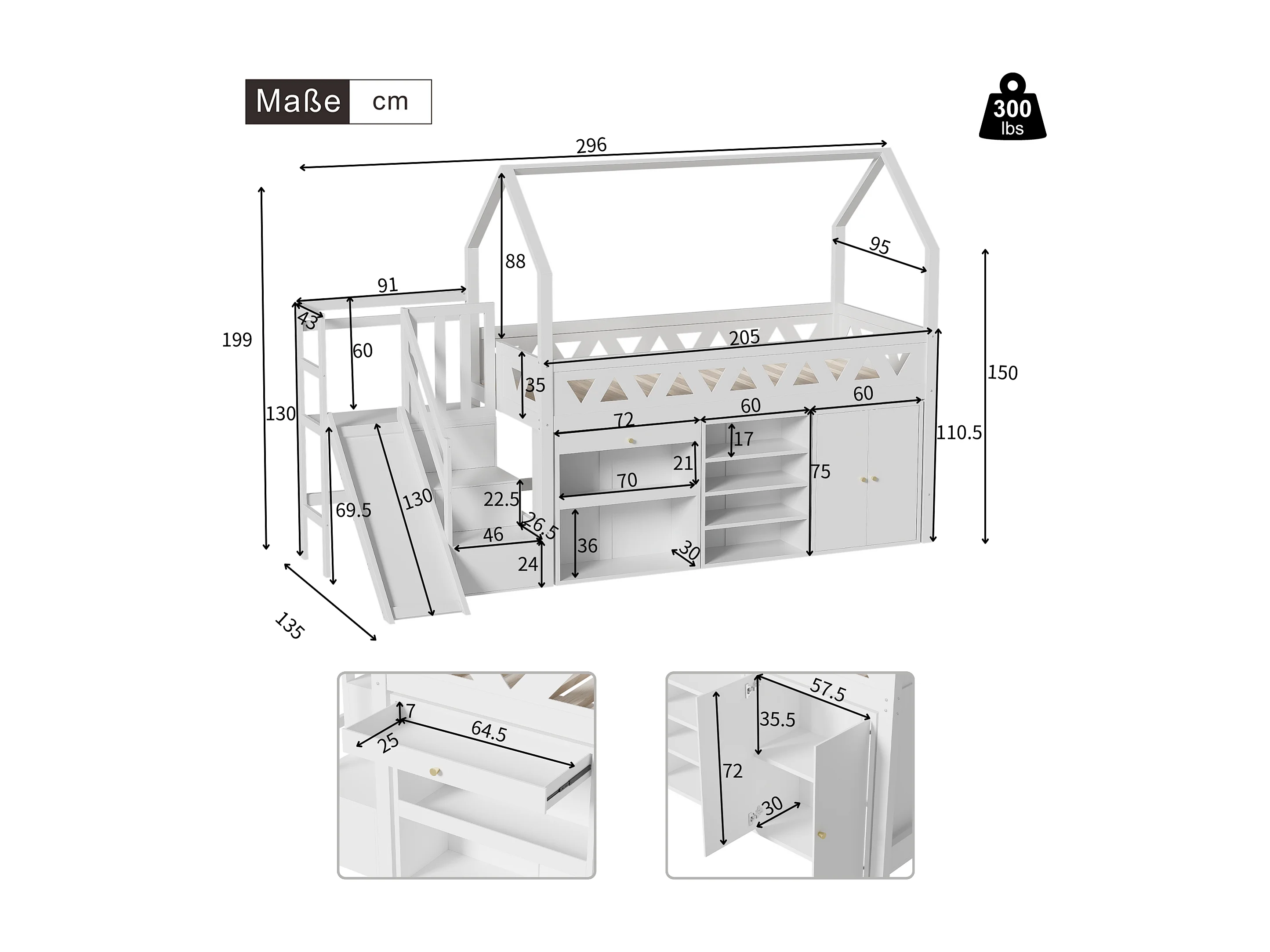 Lit enfant multifonction 90×200 cm blanc, bois massif, avec toboggan, escaliers, tiroirs et porte magnétique