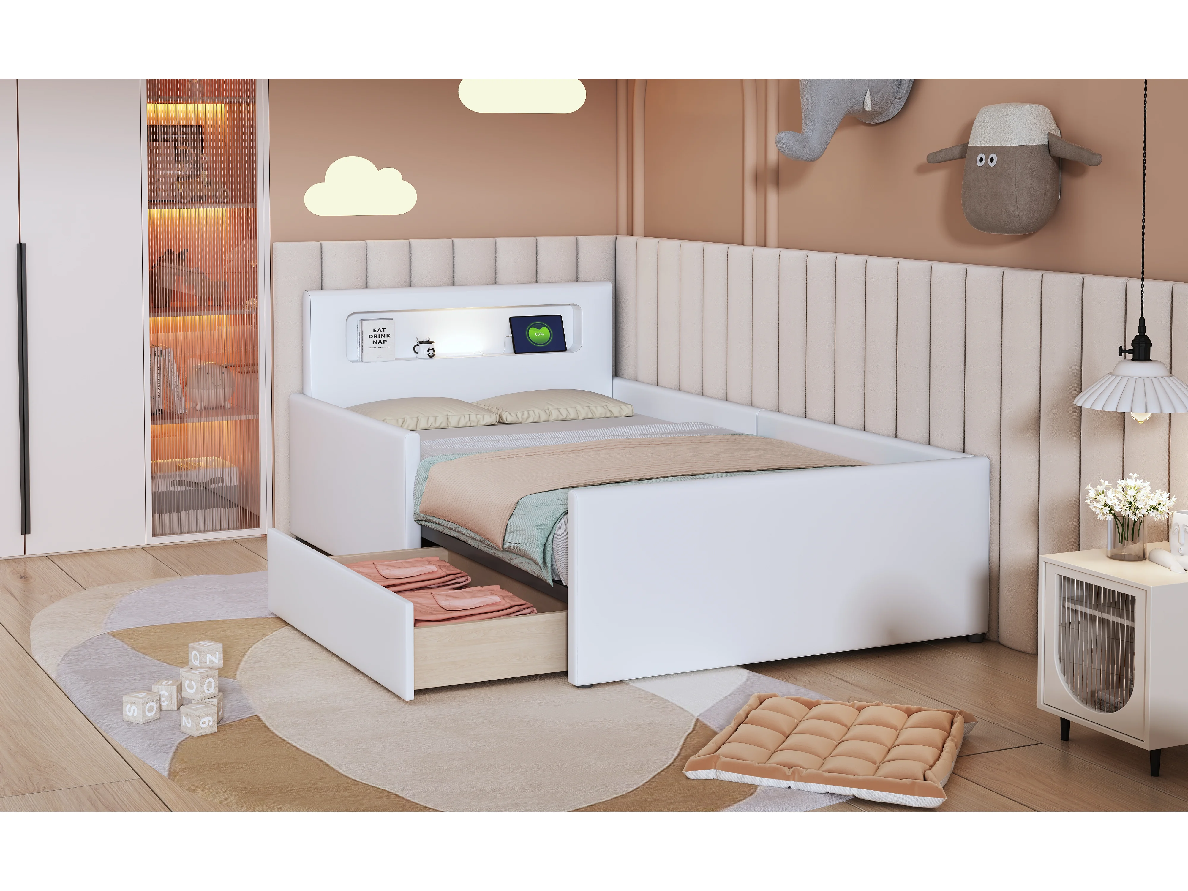 Lit enfant rembourré 90×200 cm, avec lumière nocturne et port USB, tiroirs de rangement, sécurité renforcée