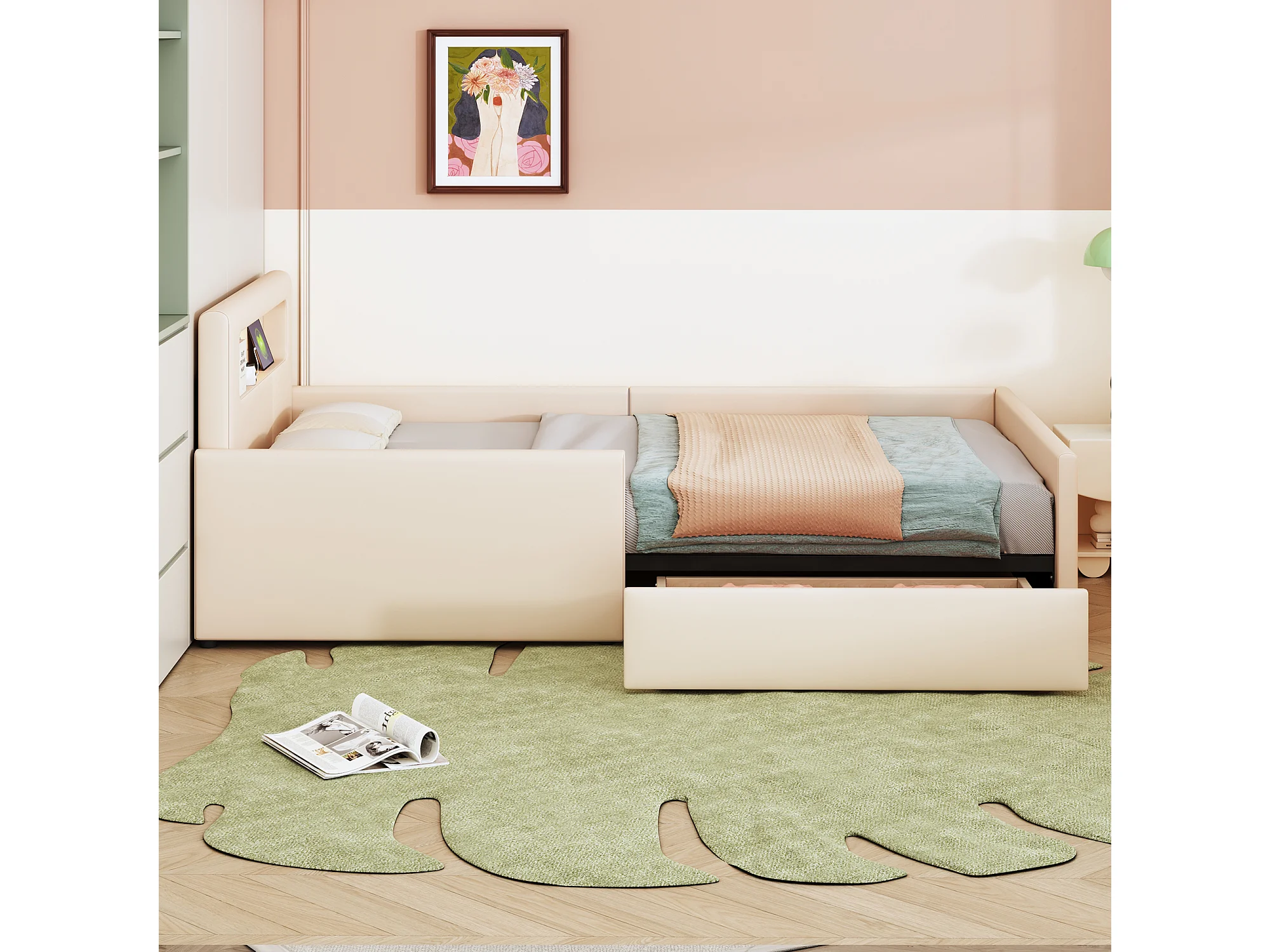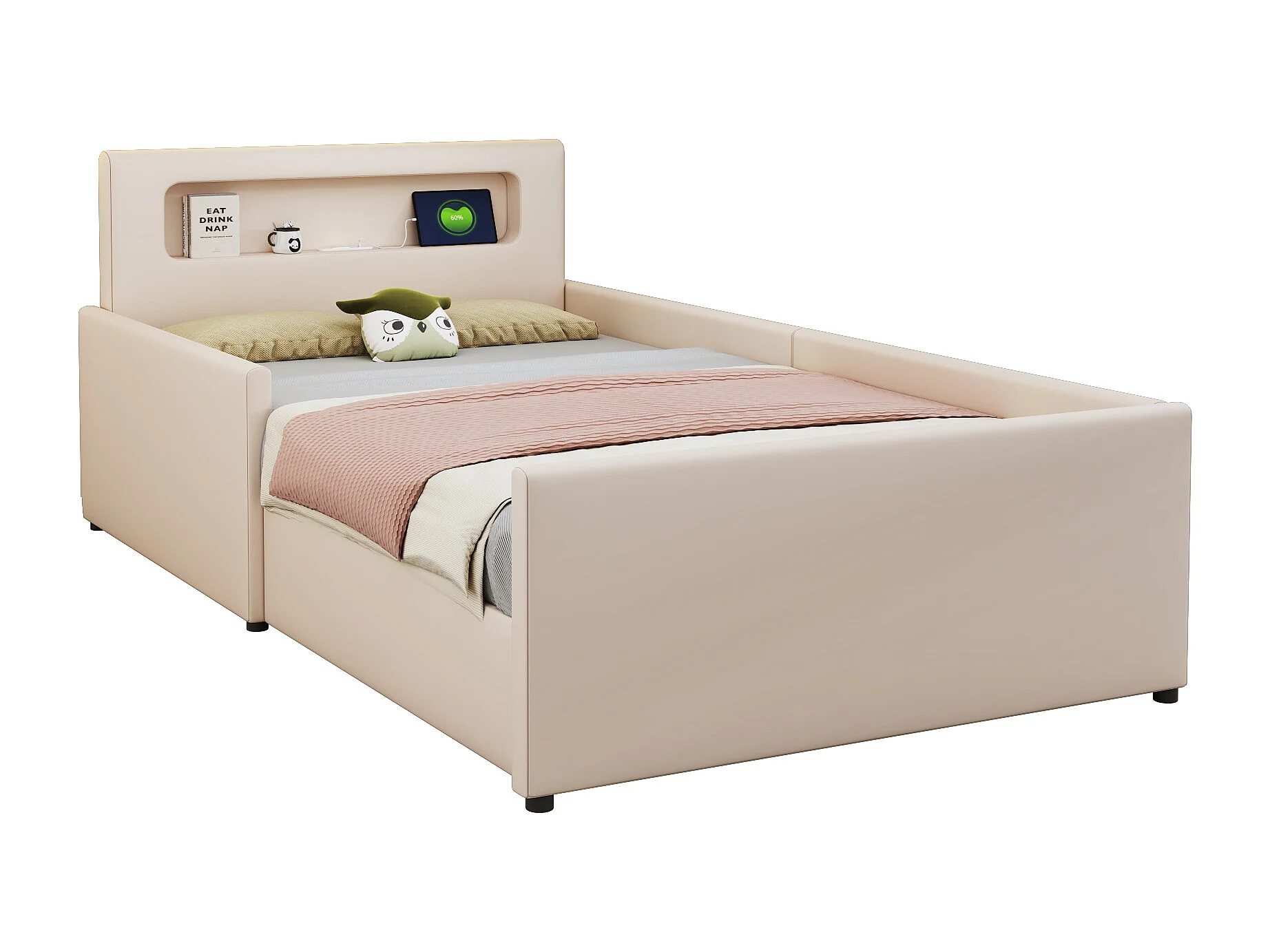 Lit enfant rembourré 90×200 cm, avec lumière nocturne et port USB, tiroirs de rangement, sécurité renforcée