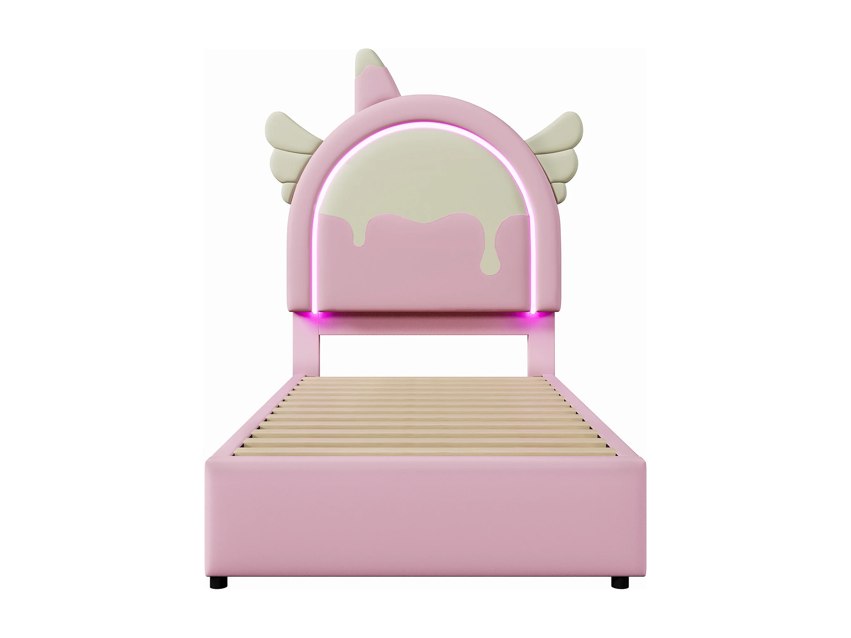 Lit enfant 90x200 cm avec sommier - tête de lit capitonnée avec LED et 2 tiroirs - similicuir - rose (sans matelas)