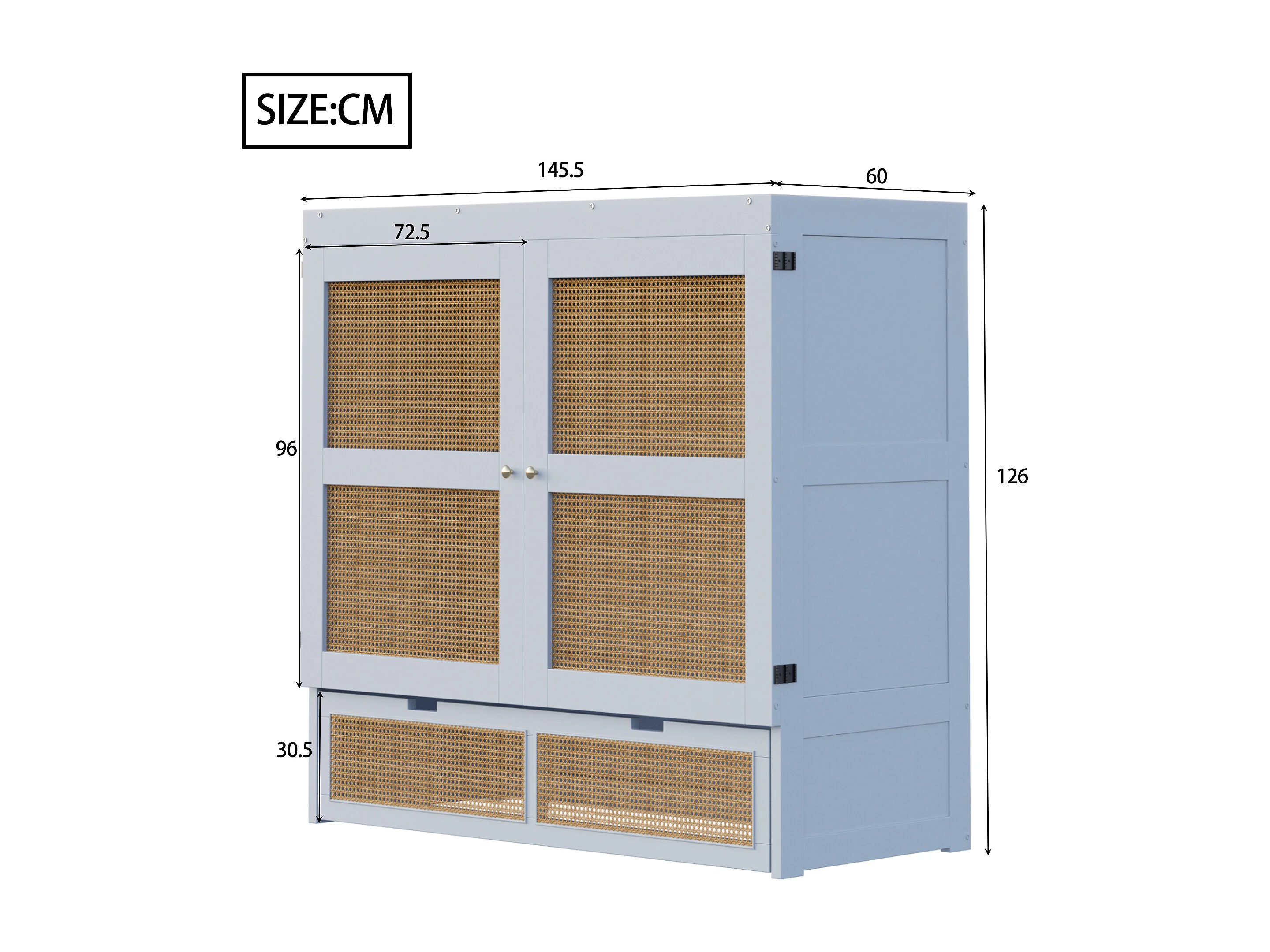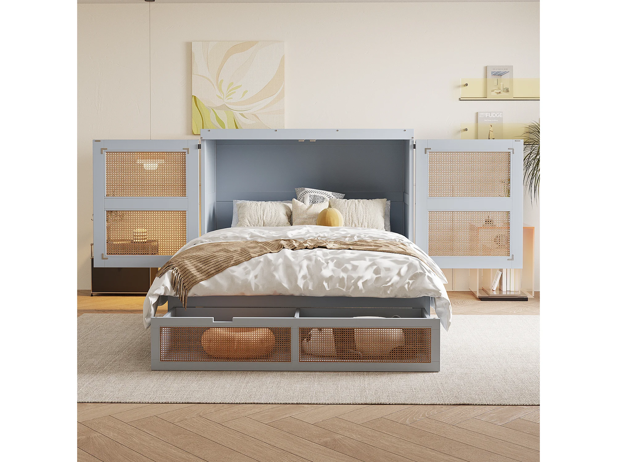 Lit escamotable 140x200 cm gris, avec tiroirs de rangement, style rotin, lit mural avec cadre en bois