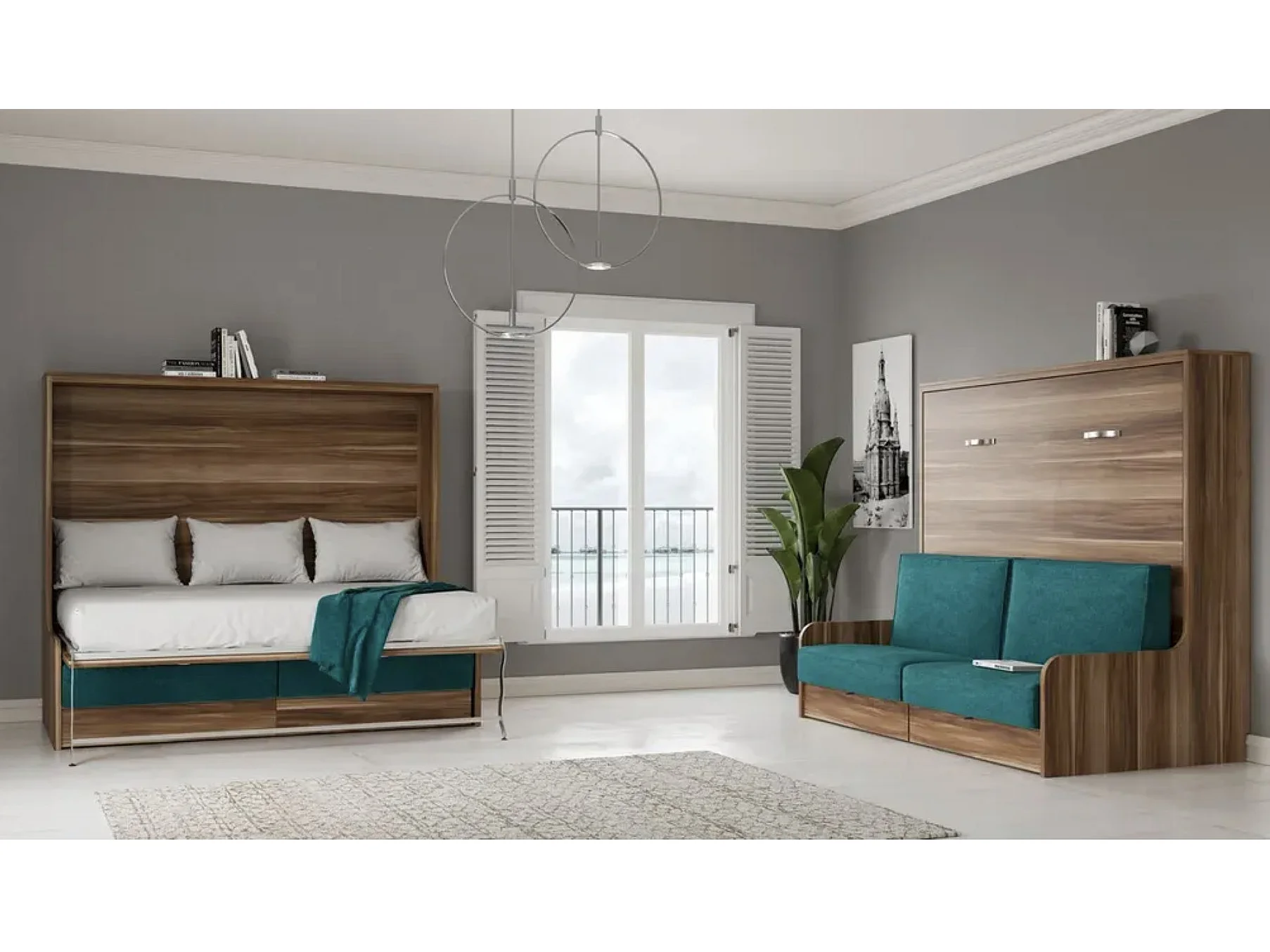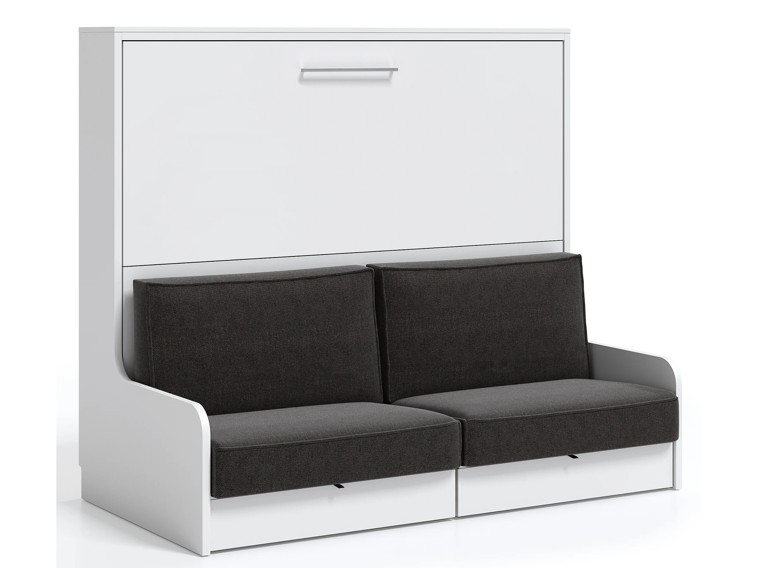 Lit escamotable autoporteur horizontal avec banquette et coffre KALIAN-Avec matelas-160x200-Cadre Blanc-Façade Blanche-Canapé Noir