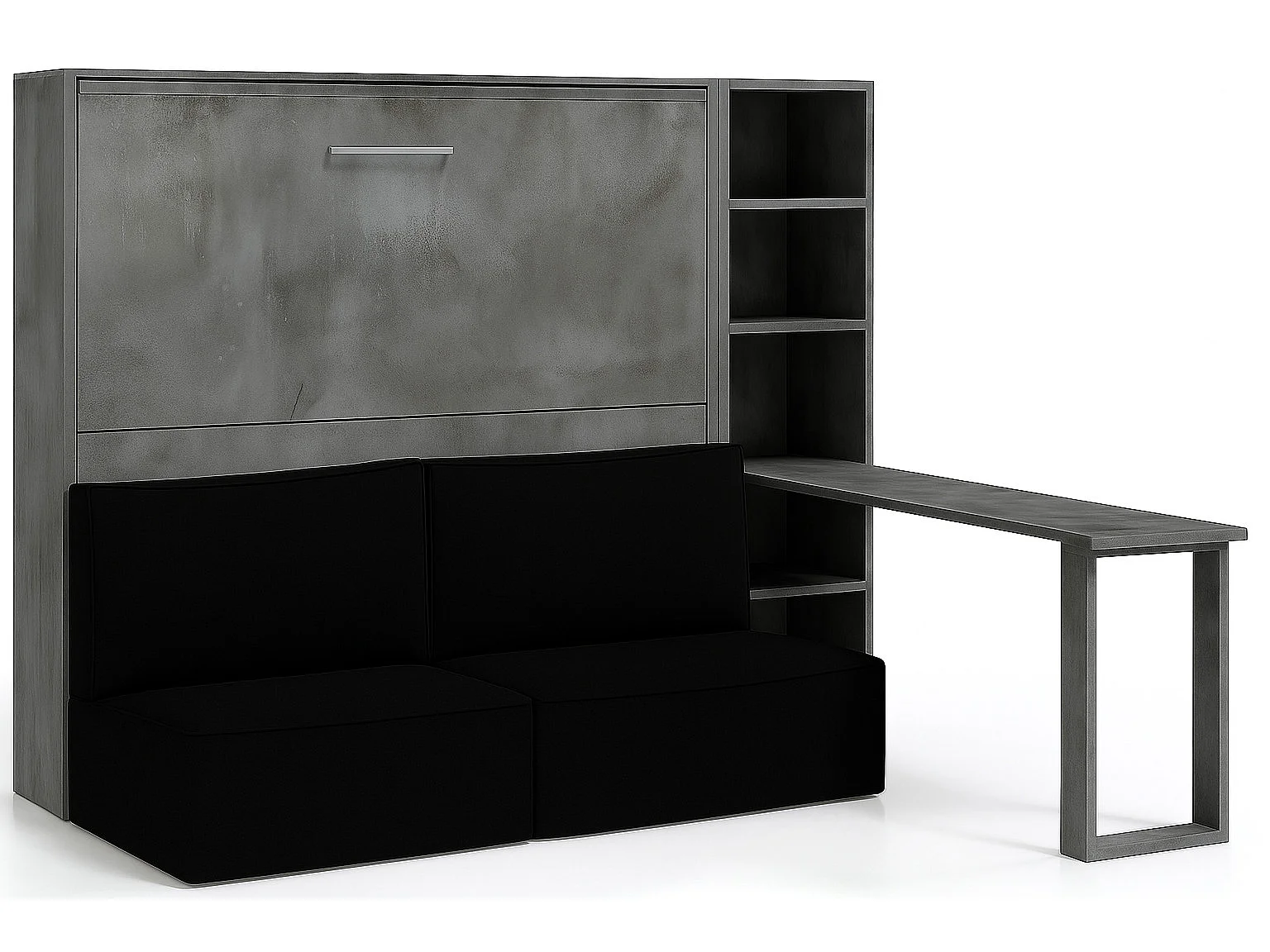 Lit escamotable horizontal LOGIA-140x200-Canapé Noir-Structure Gris ciment-Version lit+canapé+étagère+bureau