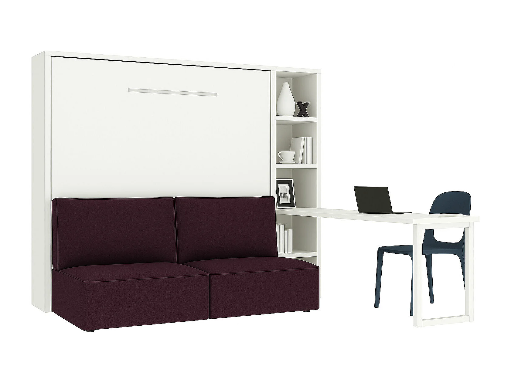 Lit escamotable horizontal LOGIA-140x200-Canapé Violet-Structure Blanche-Version lit+canapé+étagère+bureau